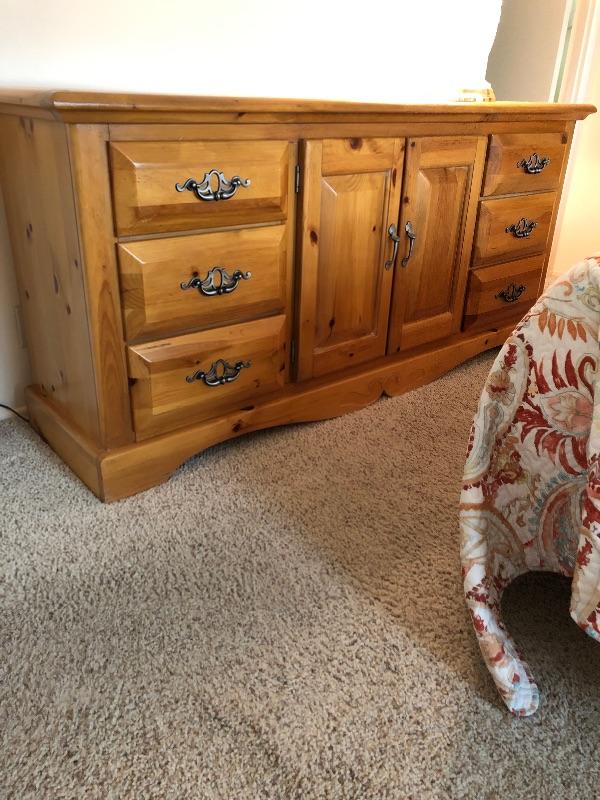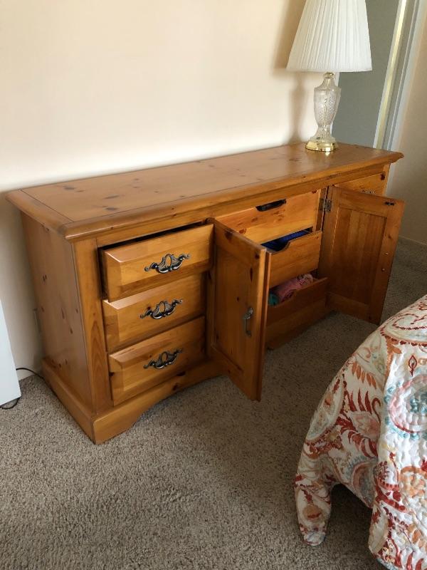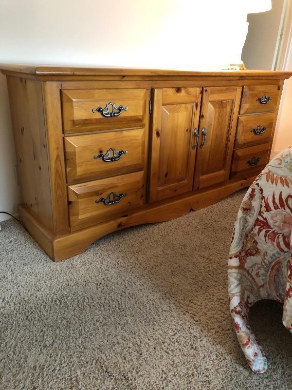 Beautiful Ponderosa Pine 9 drawer dresser. Brushed nickel finished handles. Drawers slide nicely. Very good condition.