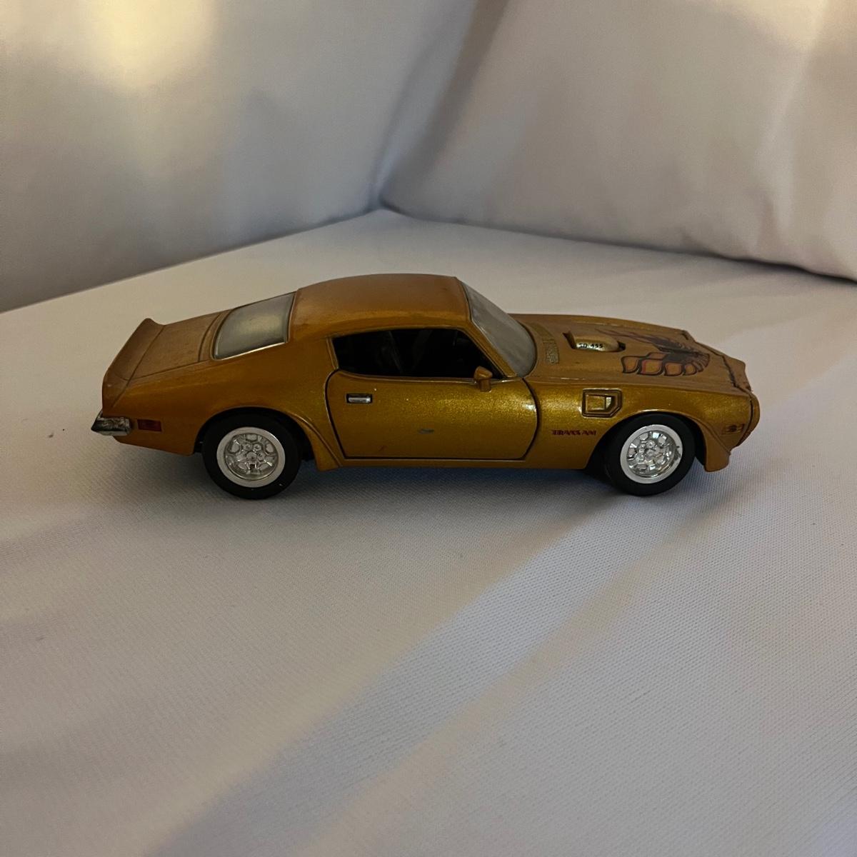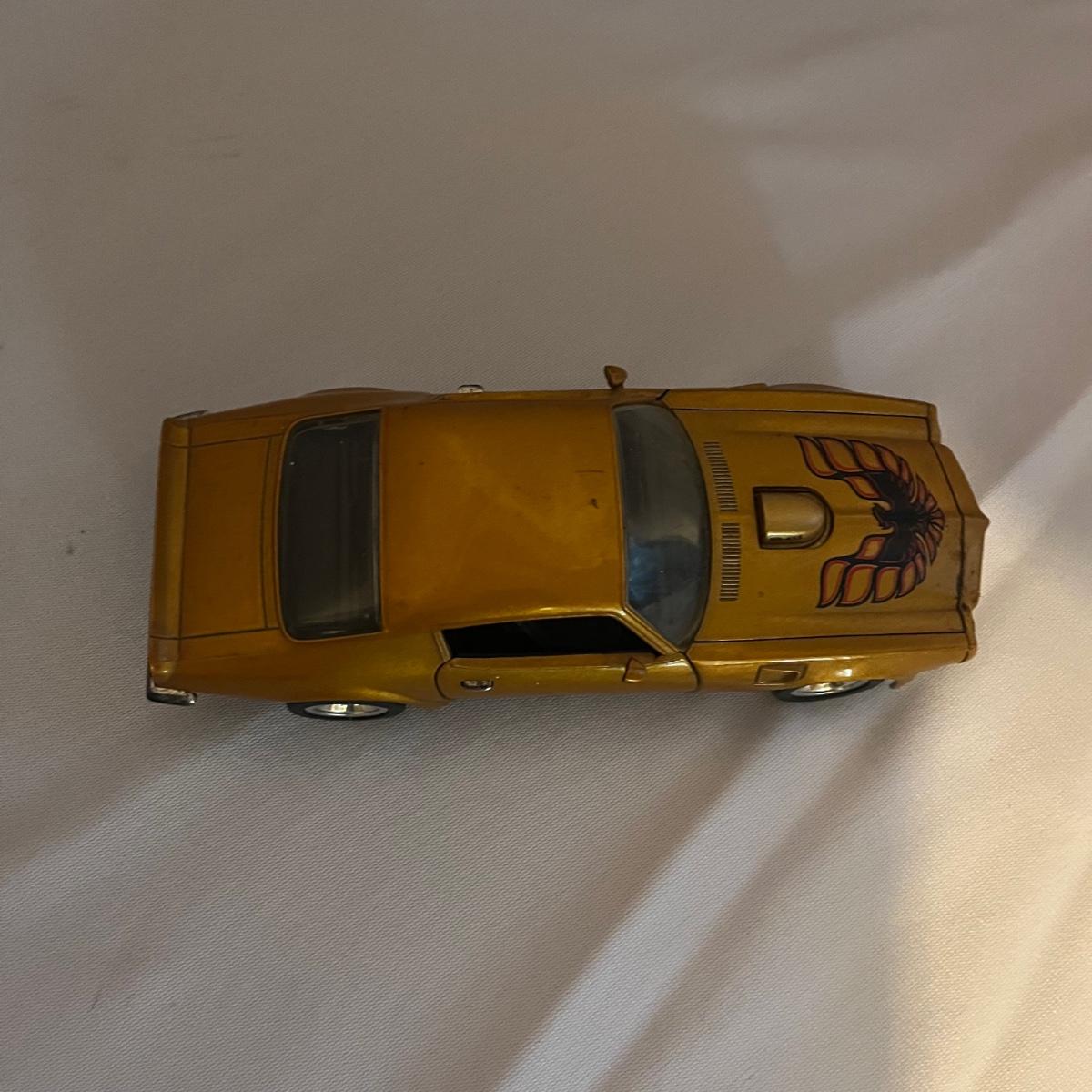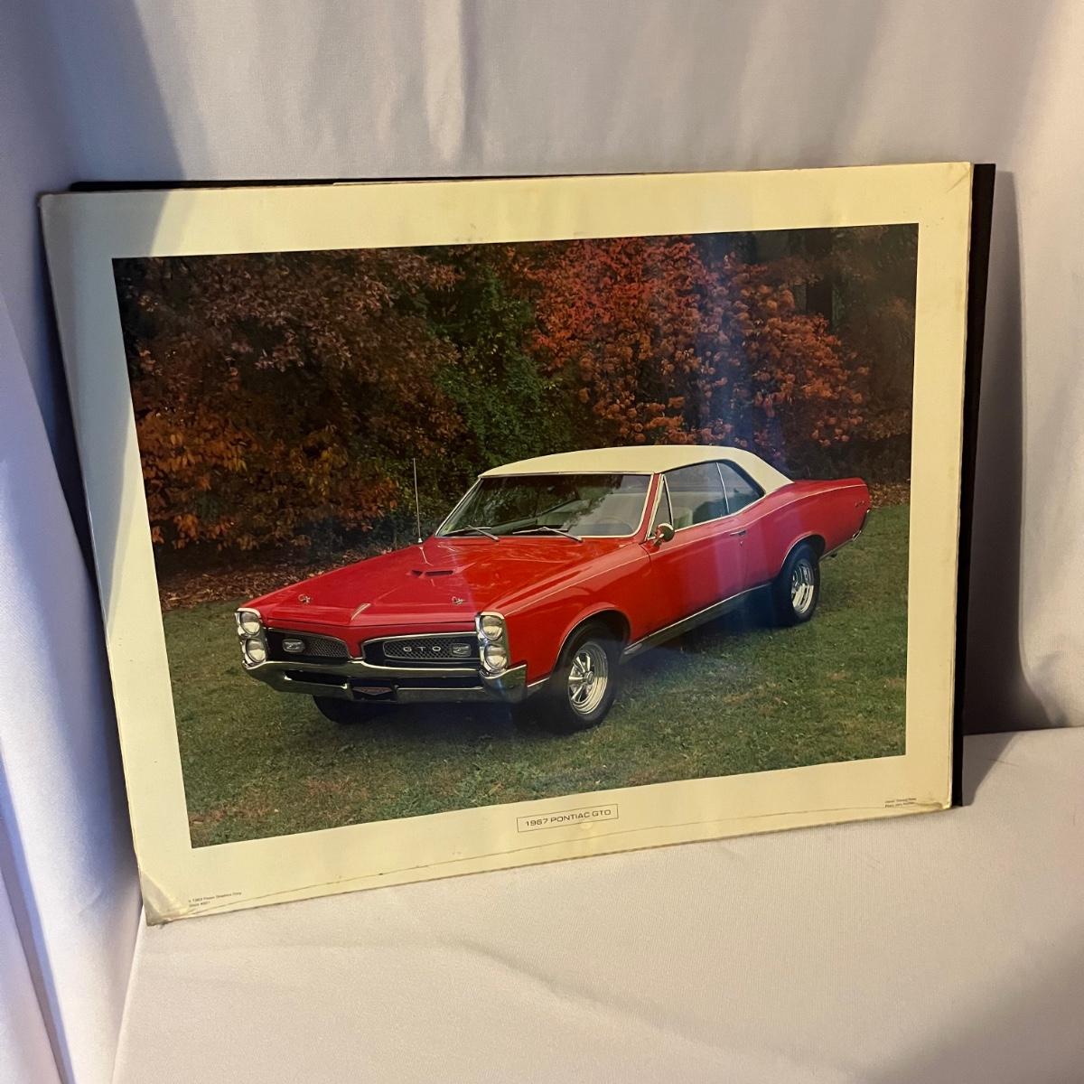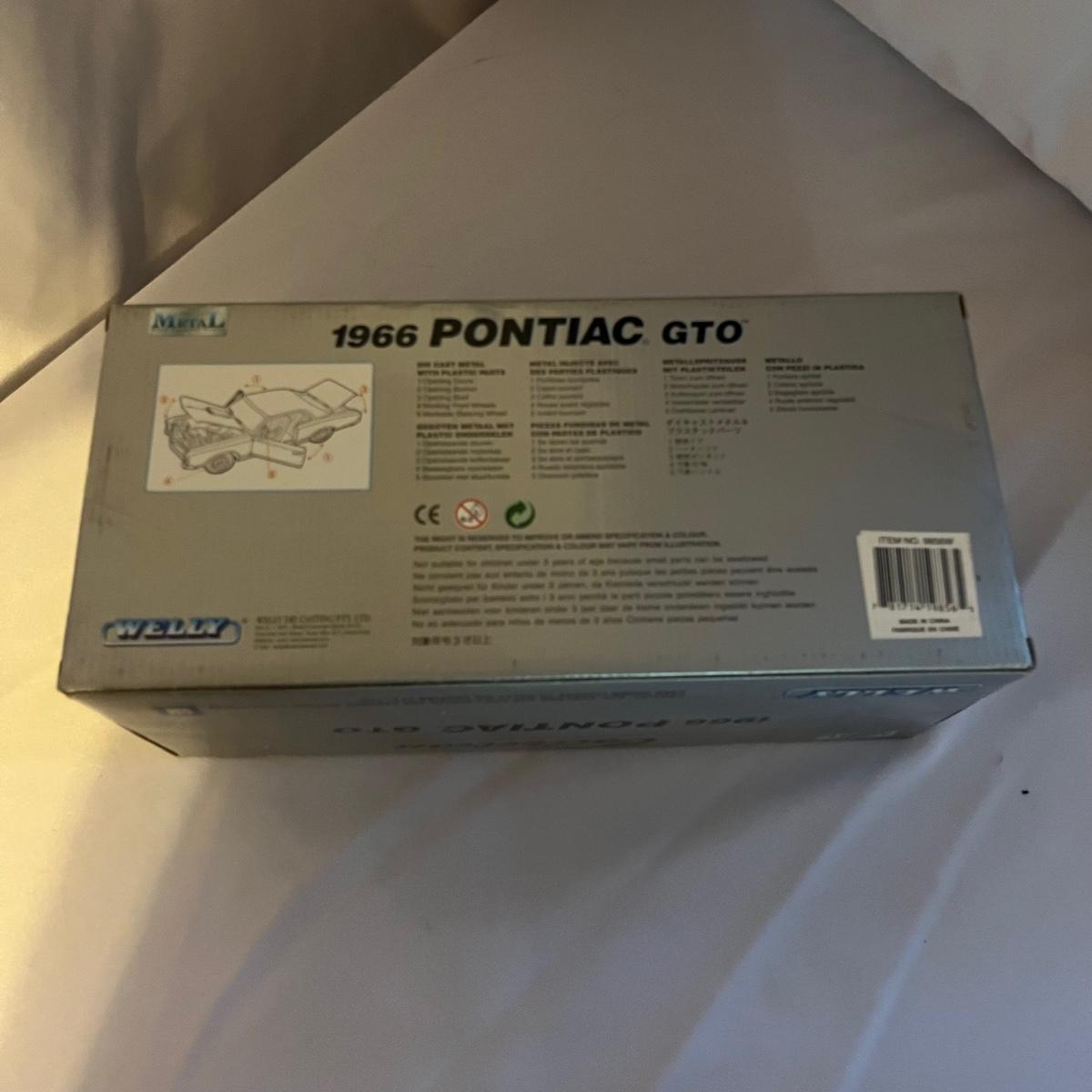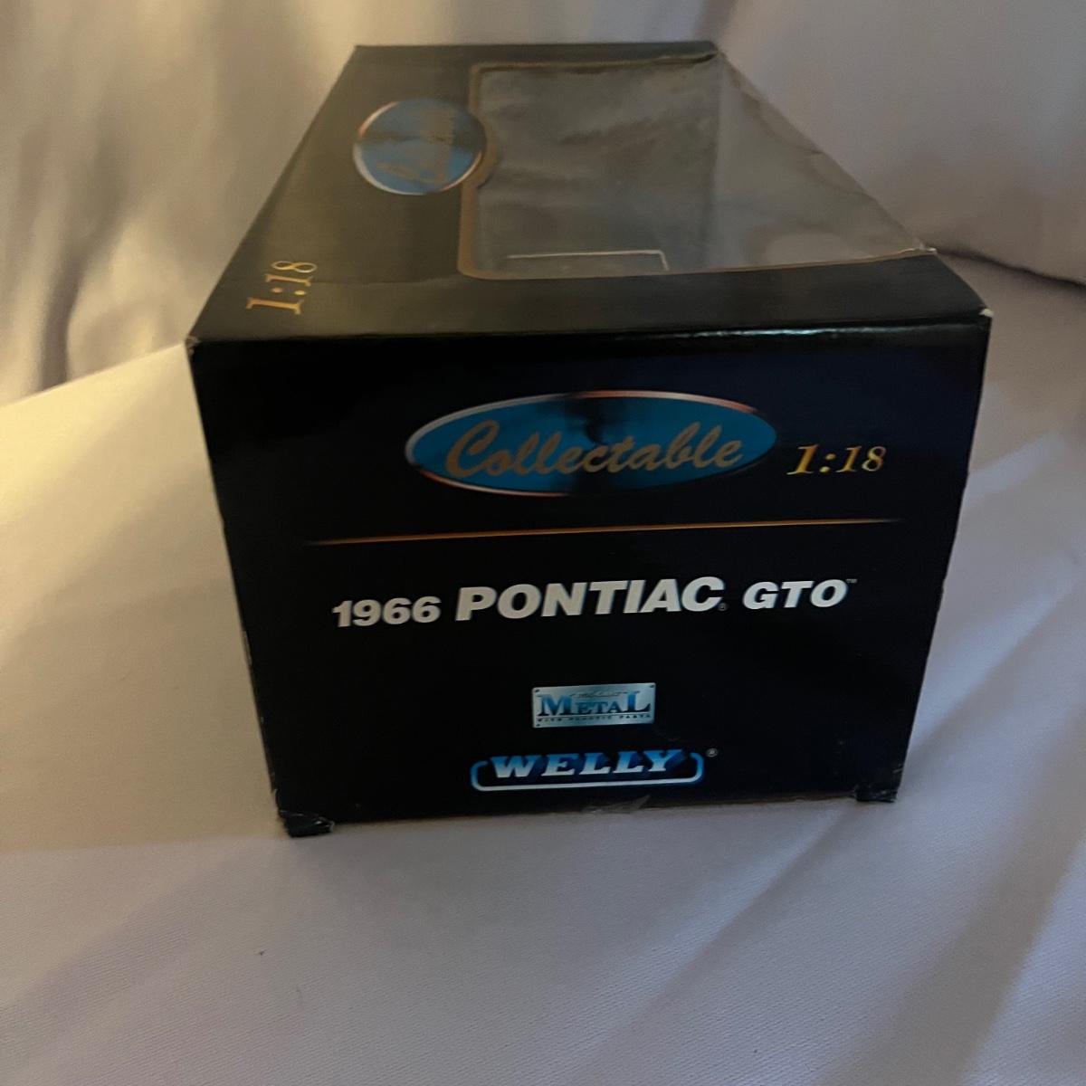 Lot includes two Welly 1:18 scale 1966 Pontiac GTOs, one Welly 1:24 scale 1965 Pontiac GTO, 1966 Pontiac GTO 1:18 scale that has both mirrors broken. Also includes a 1973 Pontiac 1:24 scale car, two GTOs posters that fit a 16” x 20” frame and a metal sign with a GTO on it. . All cars are metal die cast. Sign measures 16” x 12”.