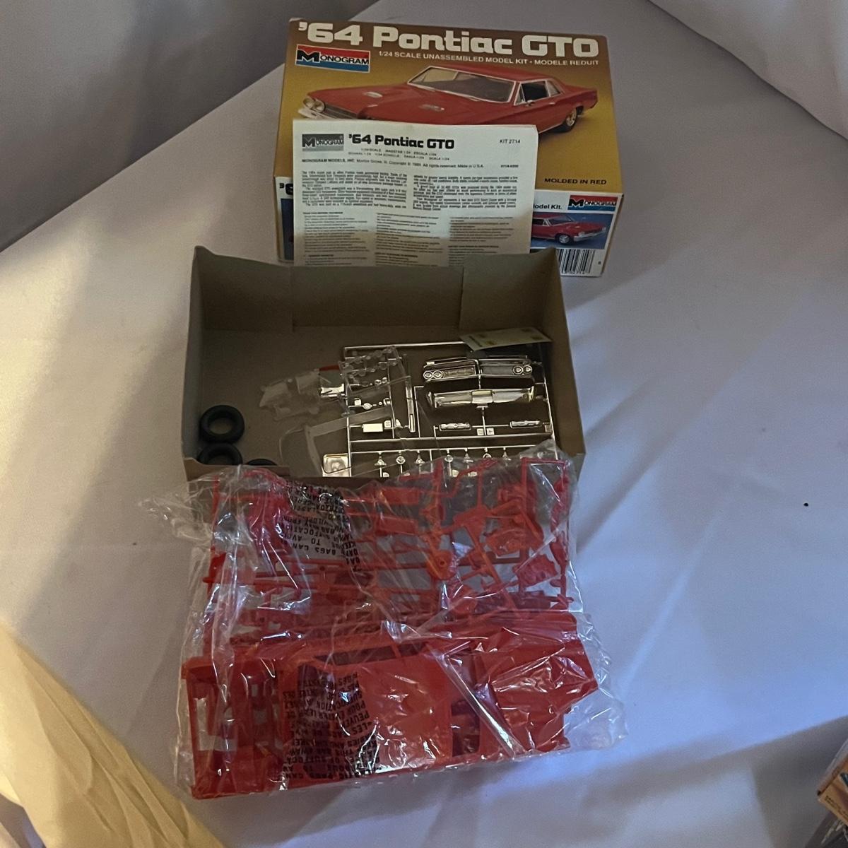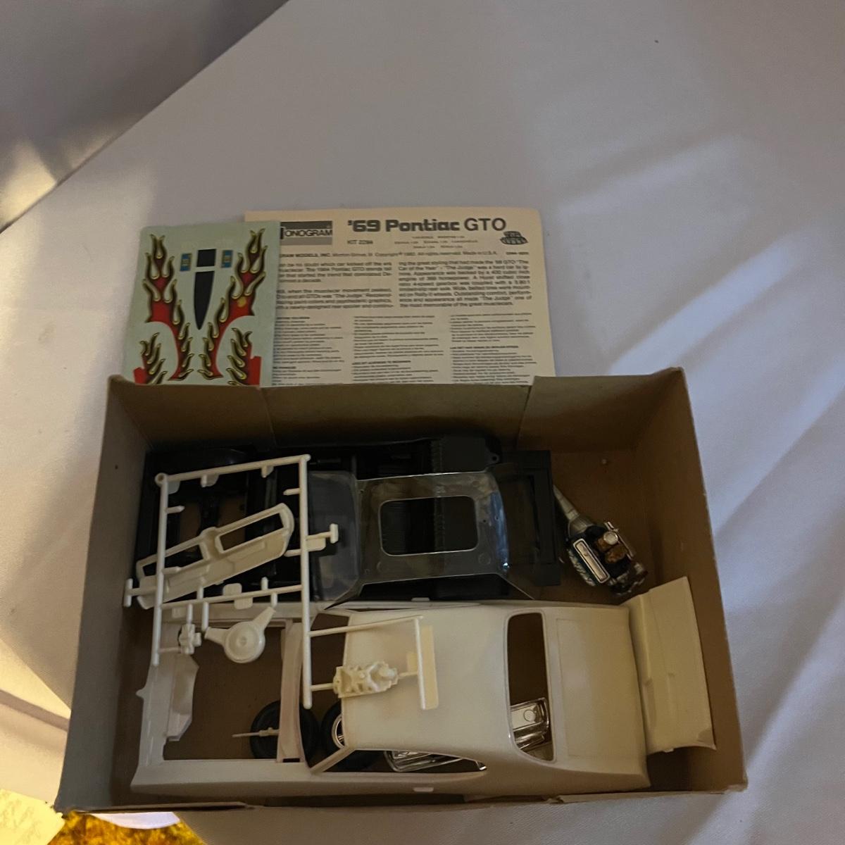 Lot includes Three Monogram Plastic scale model kits of a 68, 69 and 64 Pontiac GTO, two MPC Pontiac GTO Plastic model kits and a AMT plastic model kit of a 65 Pontiac GTO. The 1969 model kit appears to have engine put together, the other five all appear complete but we cannot guarantee that.