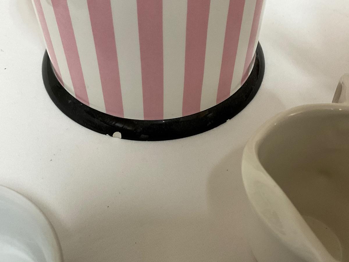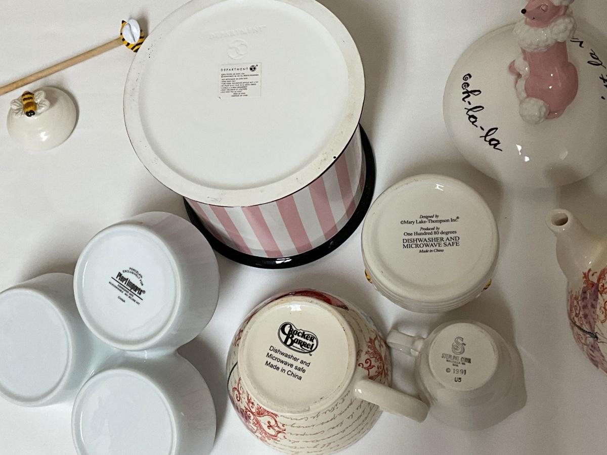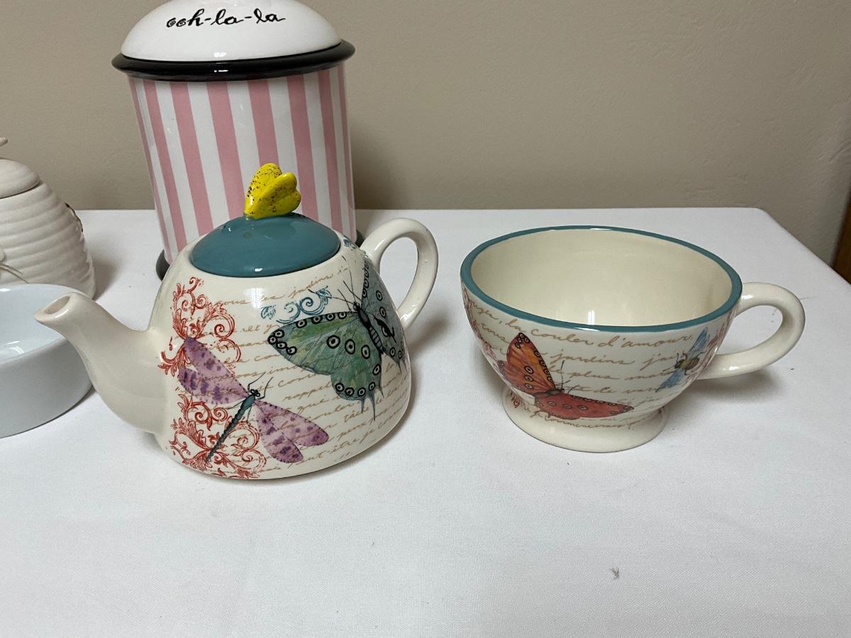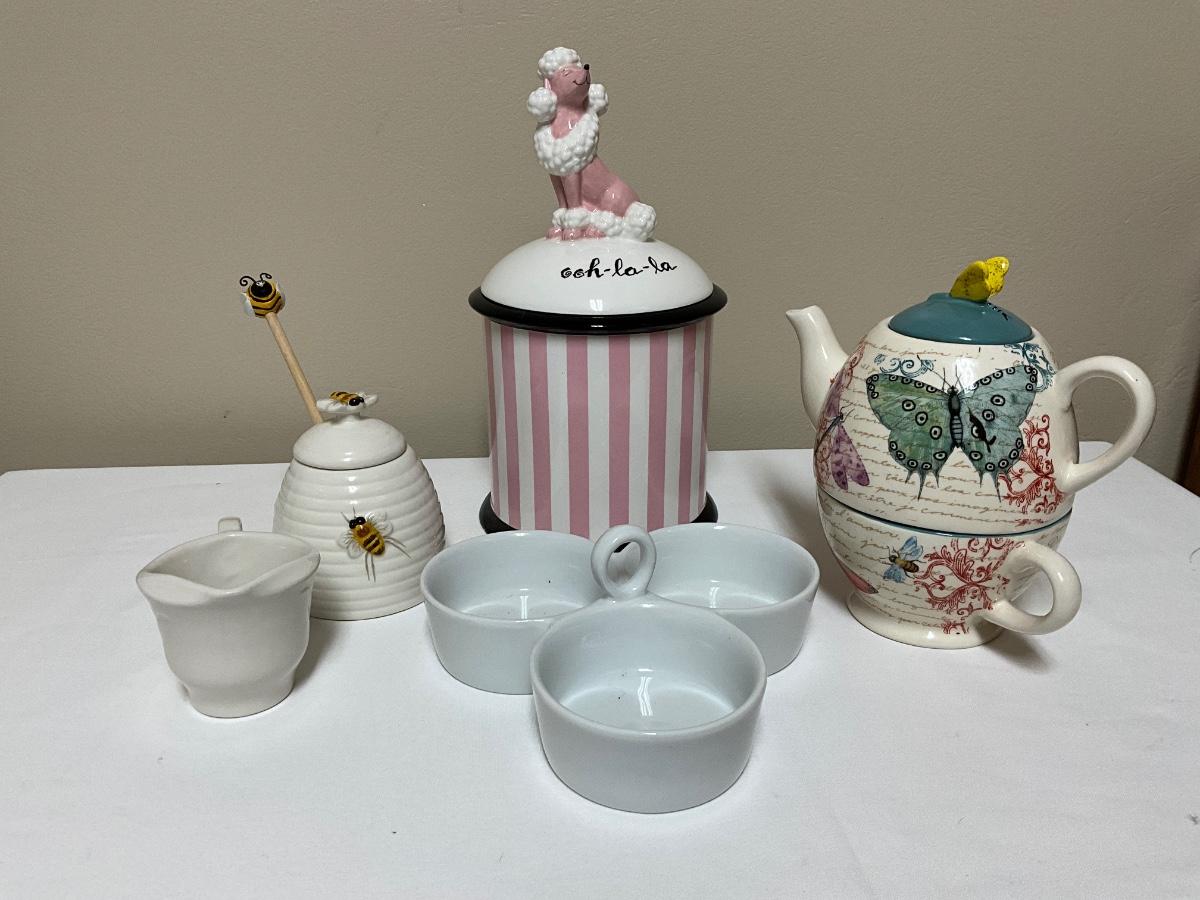 Poodle cookie jar, honey bee dish, Tea Pot/Cup, 3 tray dish, cream poorer