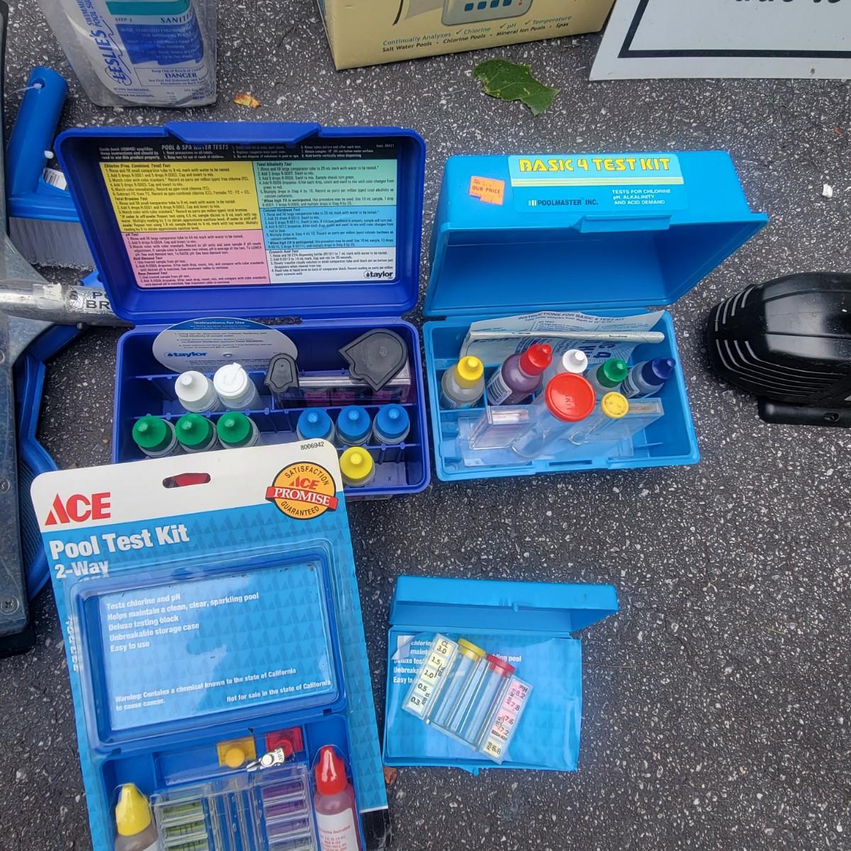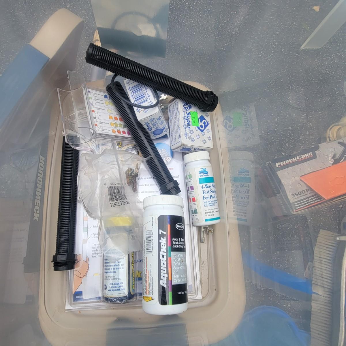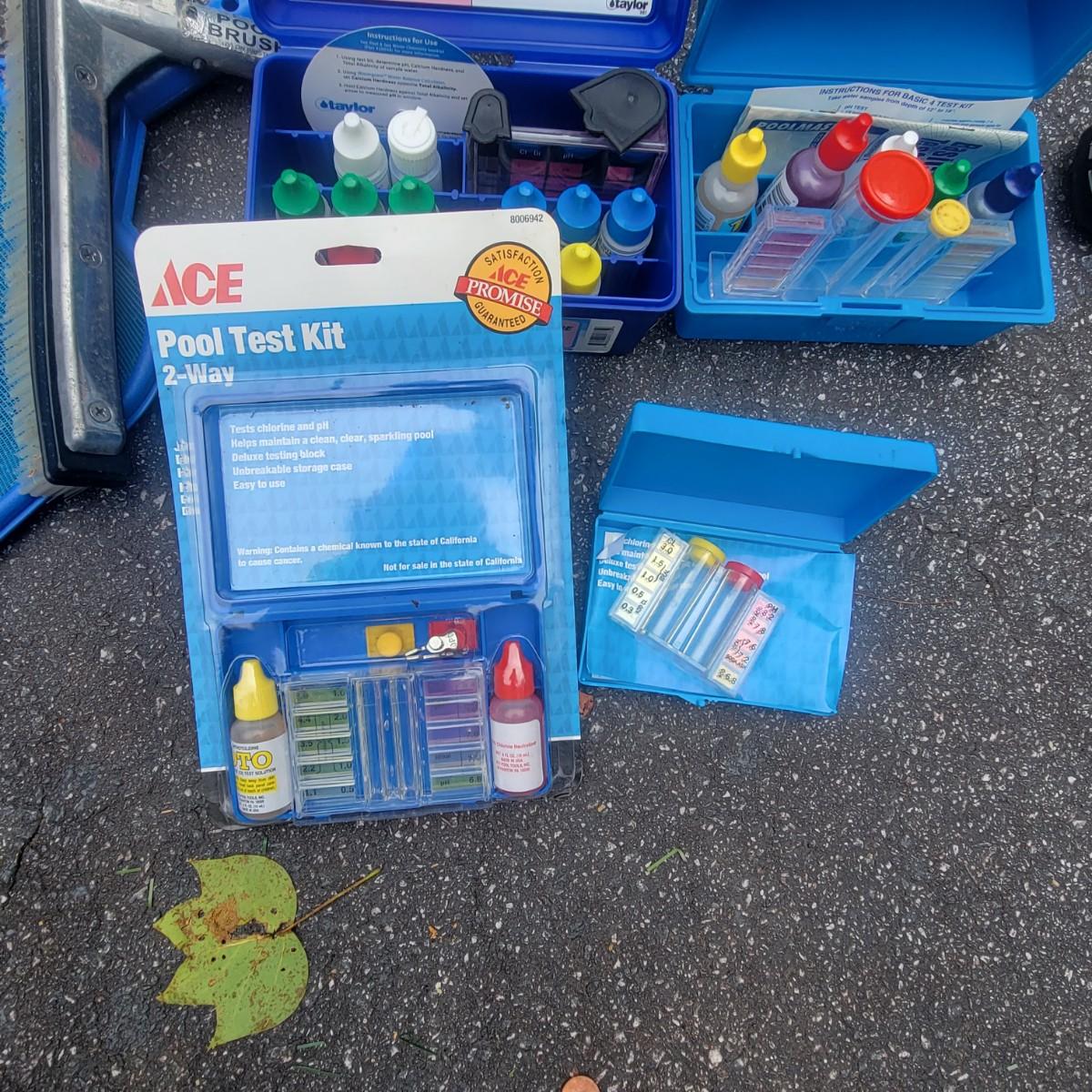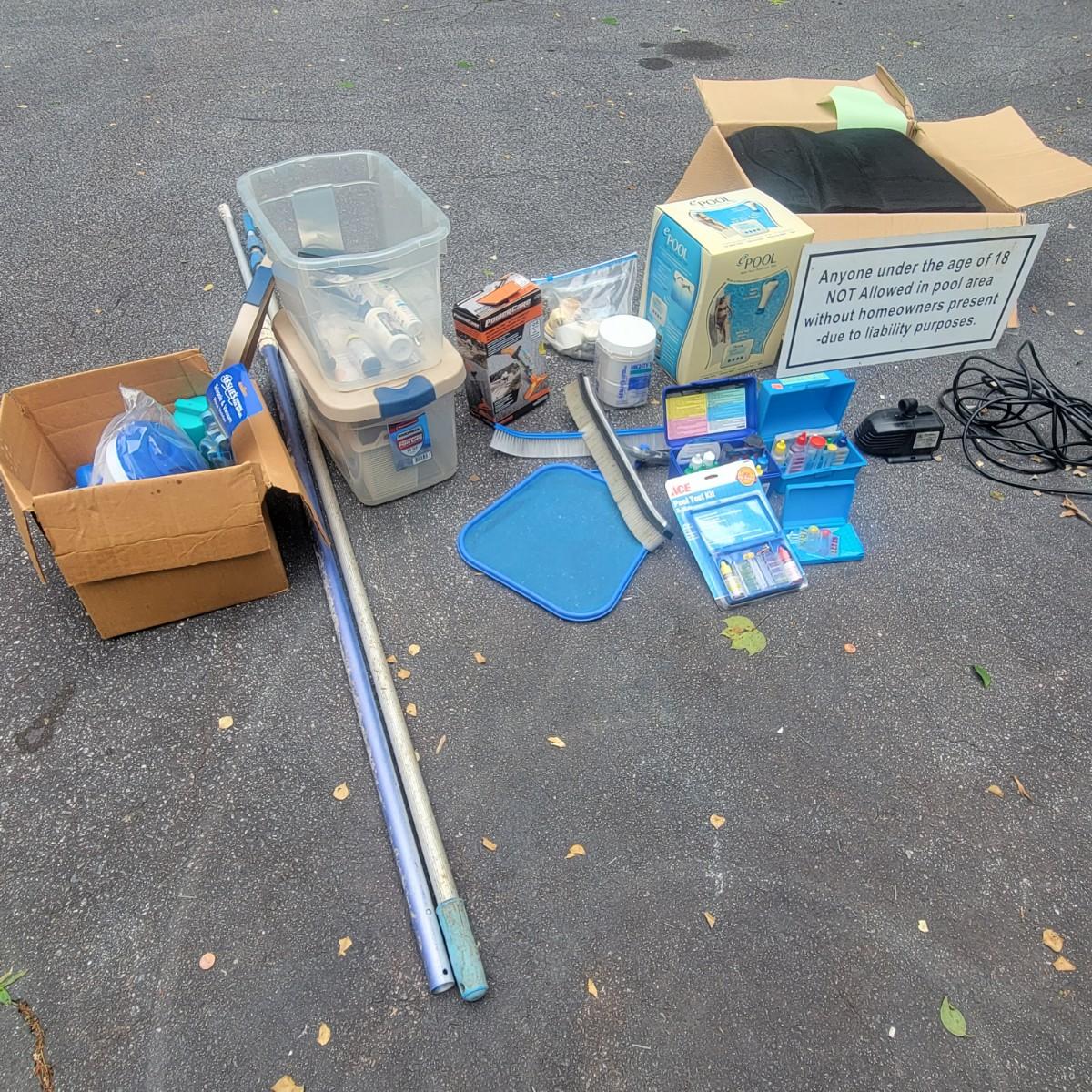 A variety of pool supplies and accessories. 2 extendable poles for brushes and nets. Brushes, net, pool testing kits, small pump, various valves, 20' x 40' pool leaf net, e pool for analyzing chlorine, pH and temperature and more. Local pickup only