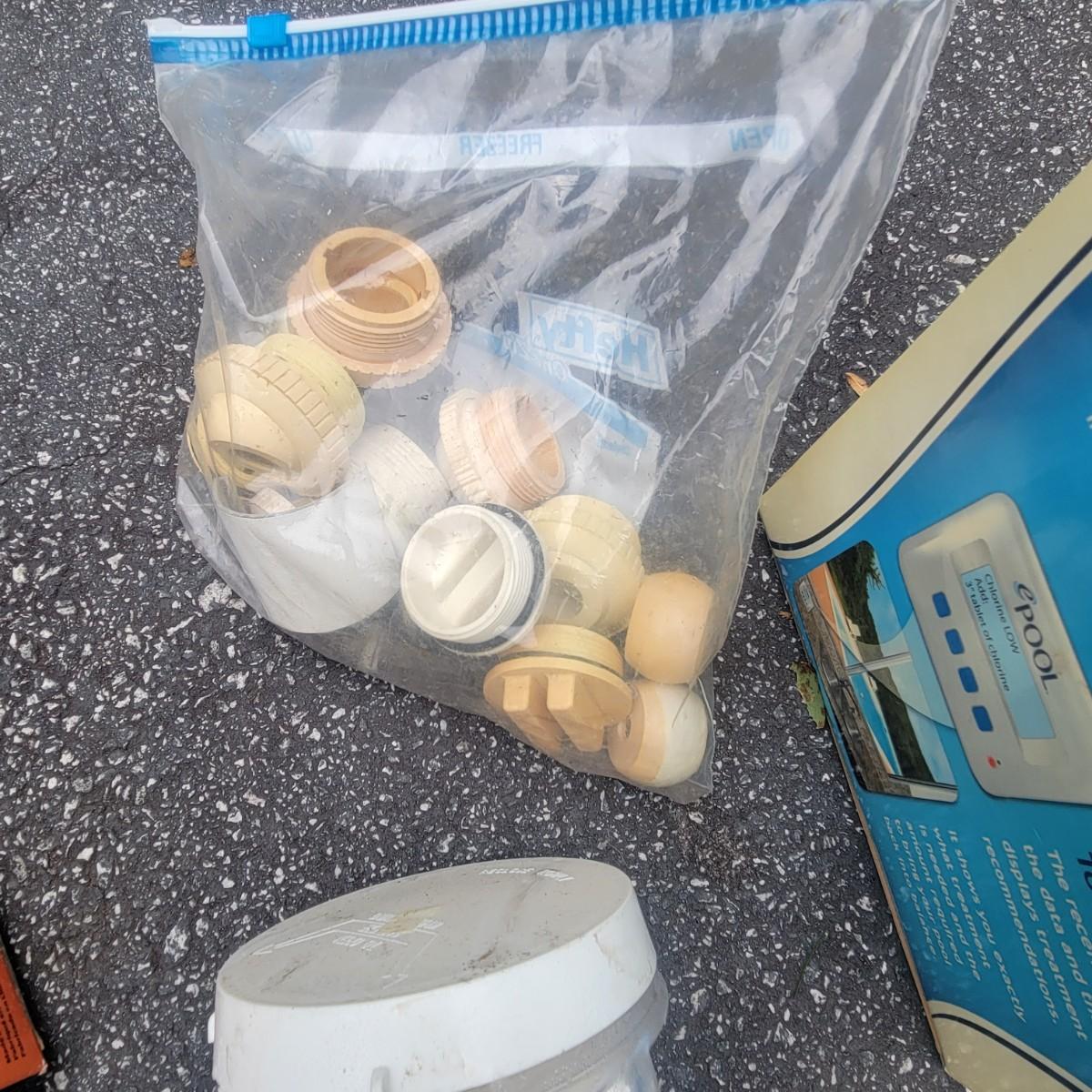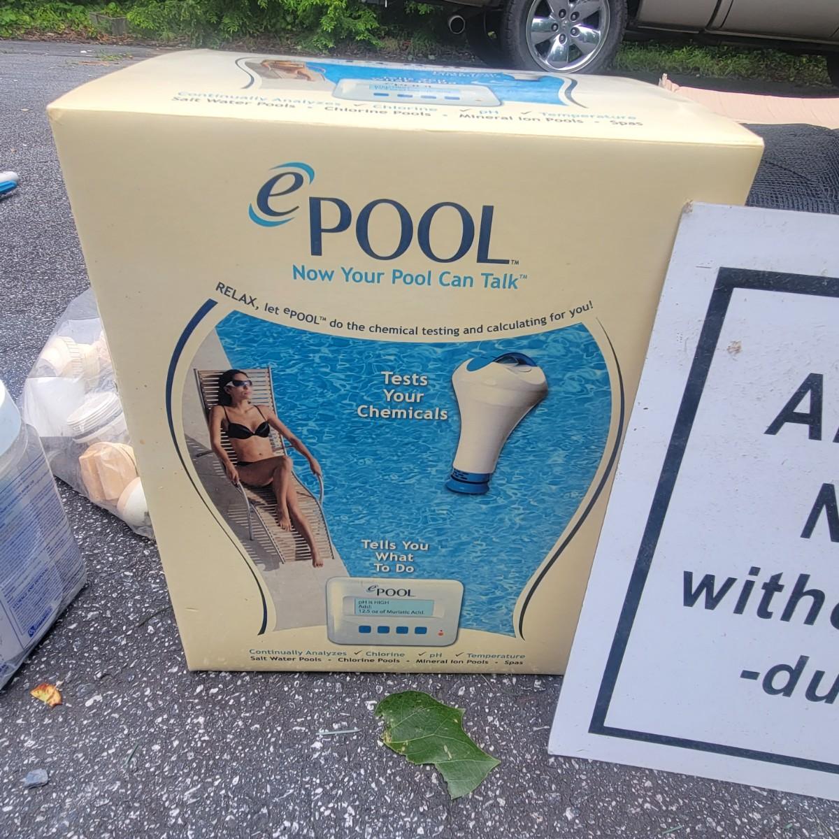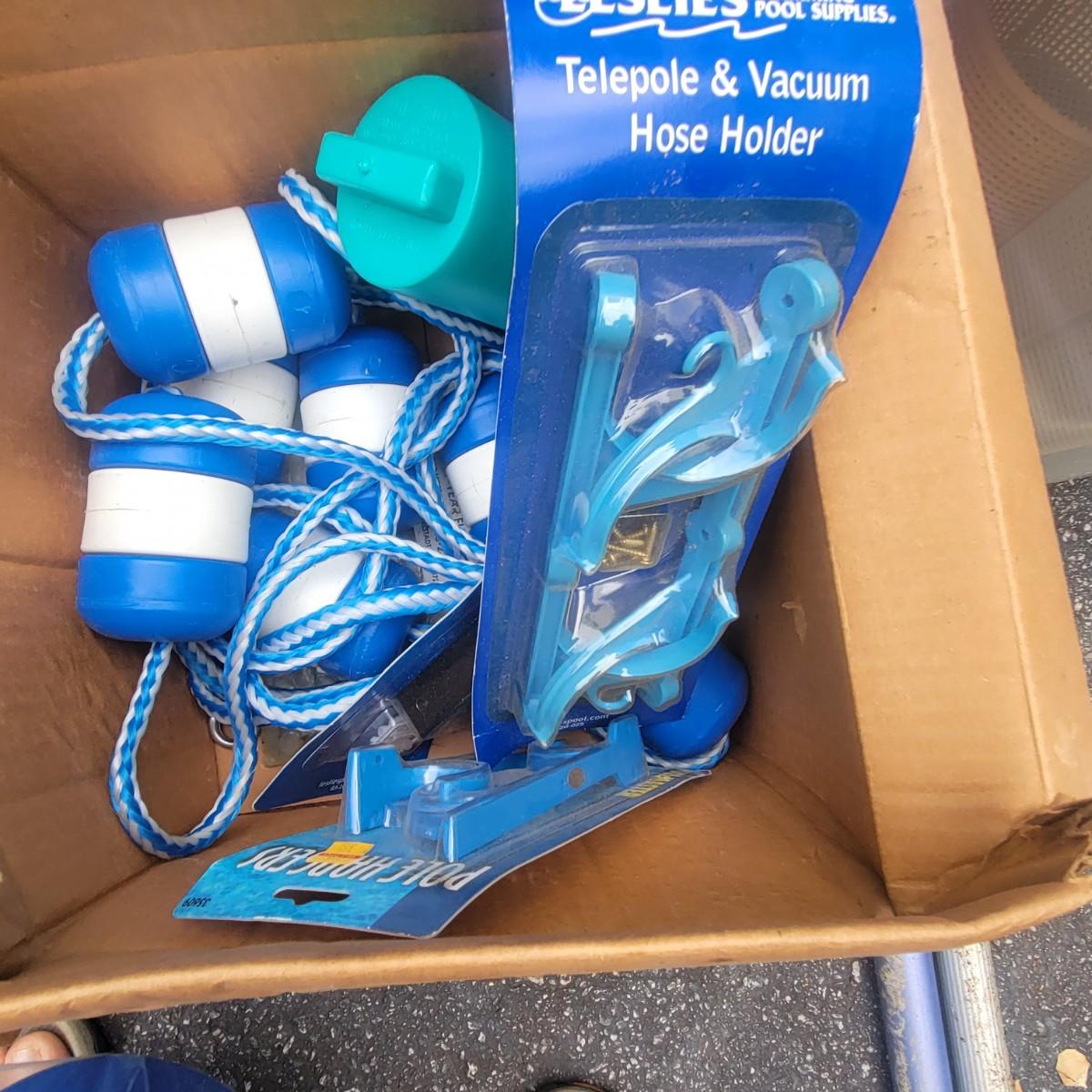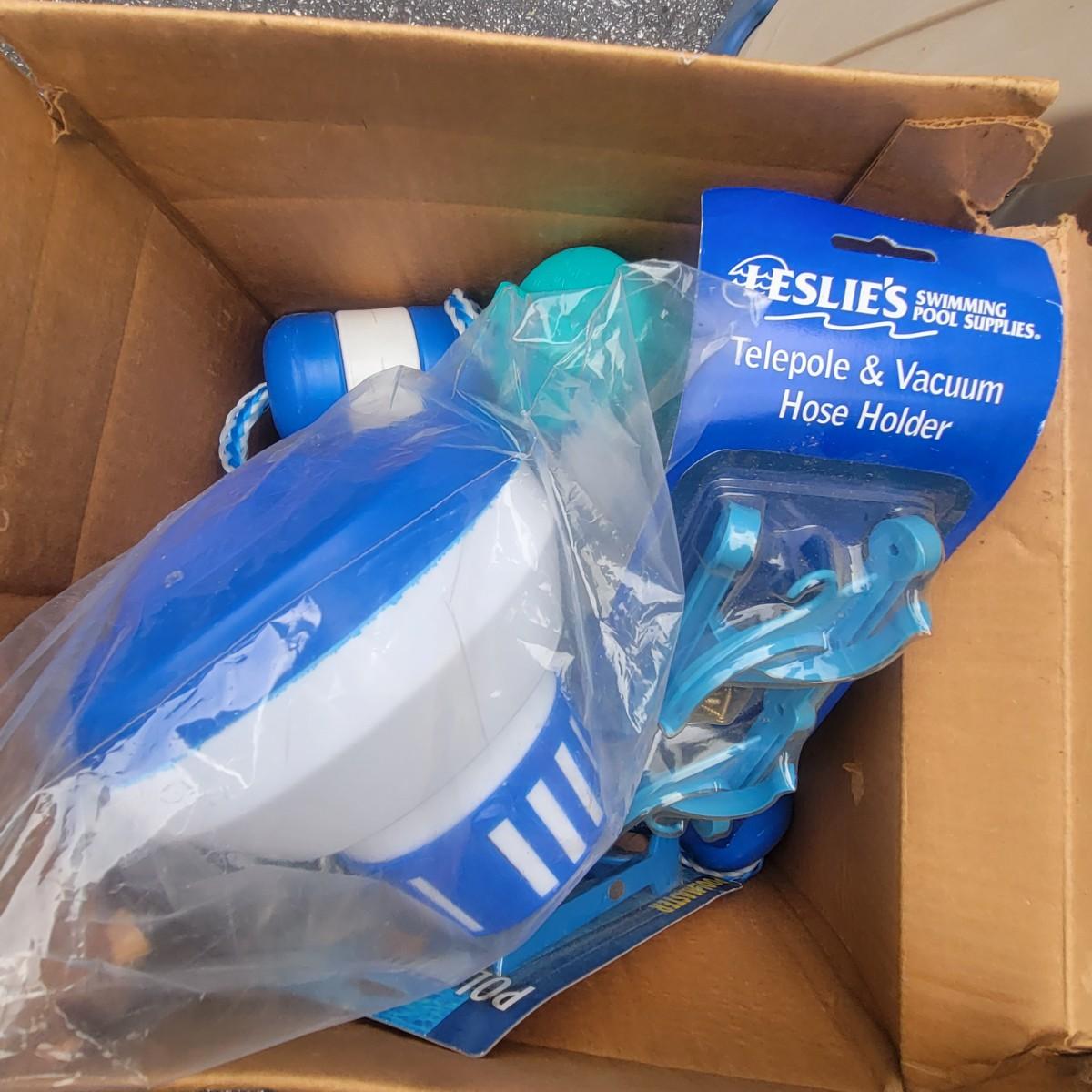 A variety of pool supplies and accessories. 2 extendable poles for brushes and nets. Brushes, net, pool testing kits, small pump, various valves, 20' x 40' pool leaf net, e pool for analyzing chlorine, pH and temperature and more. Local pickup only