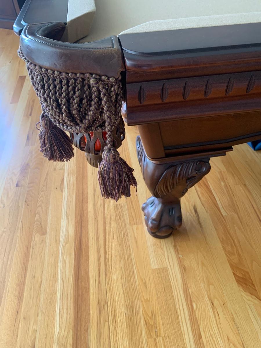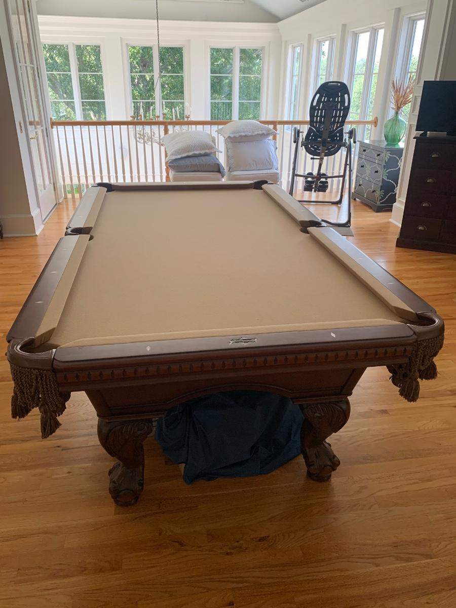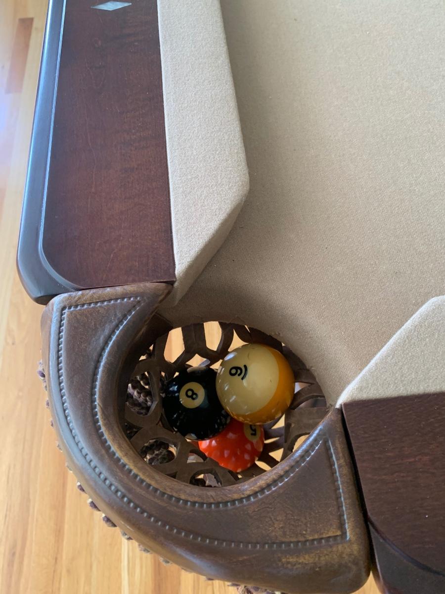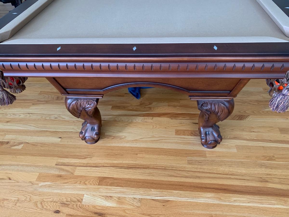 Gorgeous American Heritage 8’ pool table with ball & claw, leather drop pockets, and beige felt. Pool sticks and stand included.