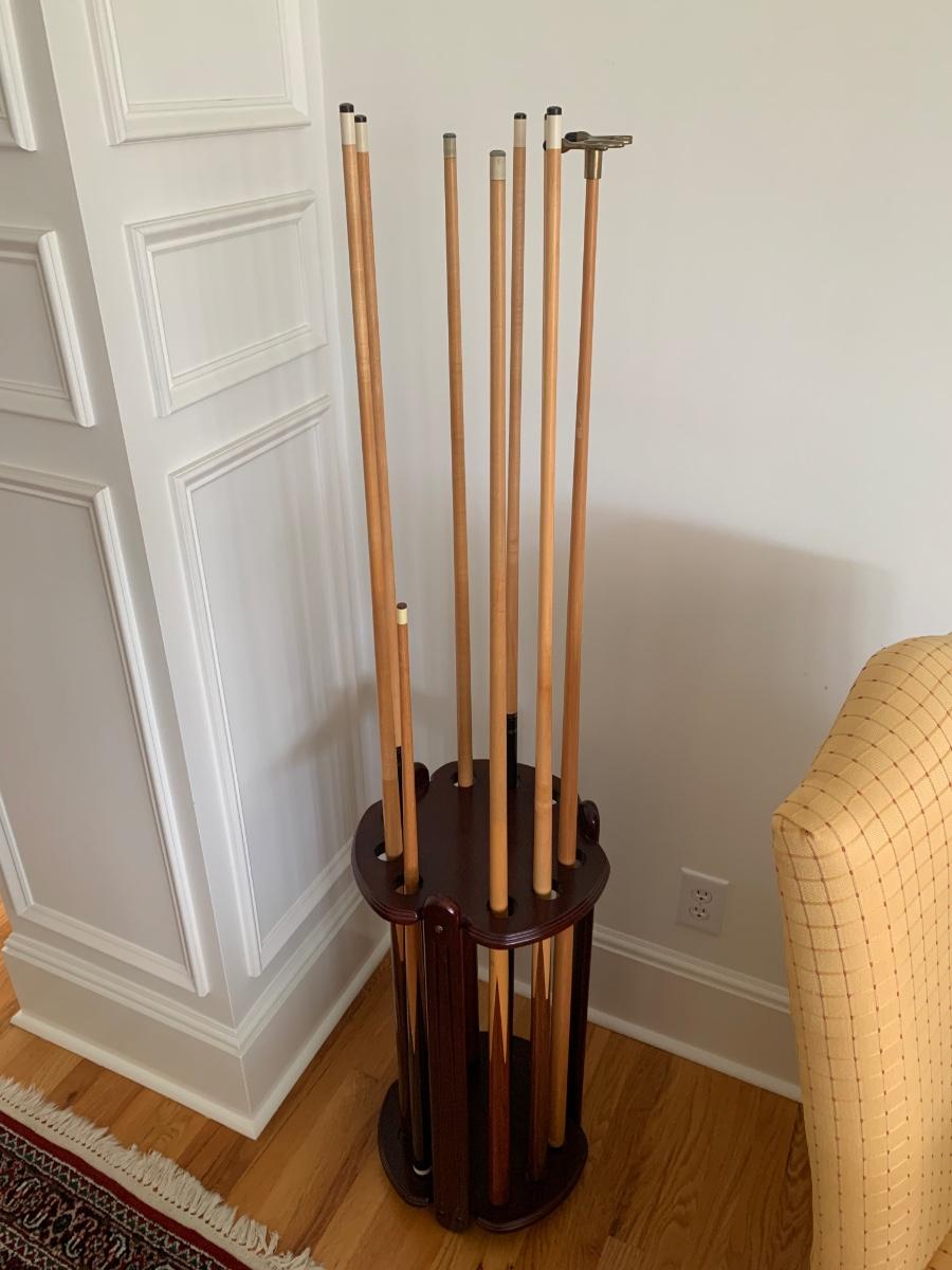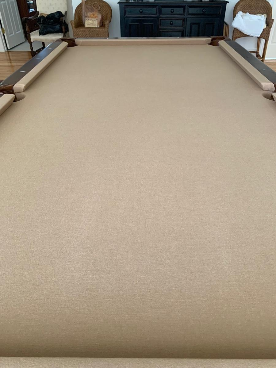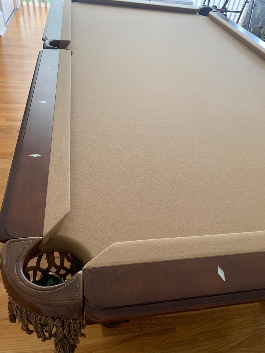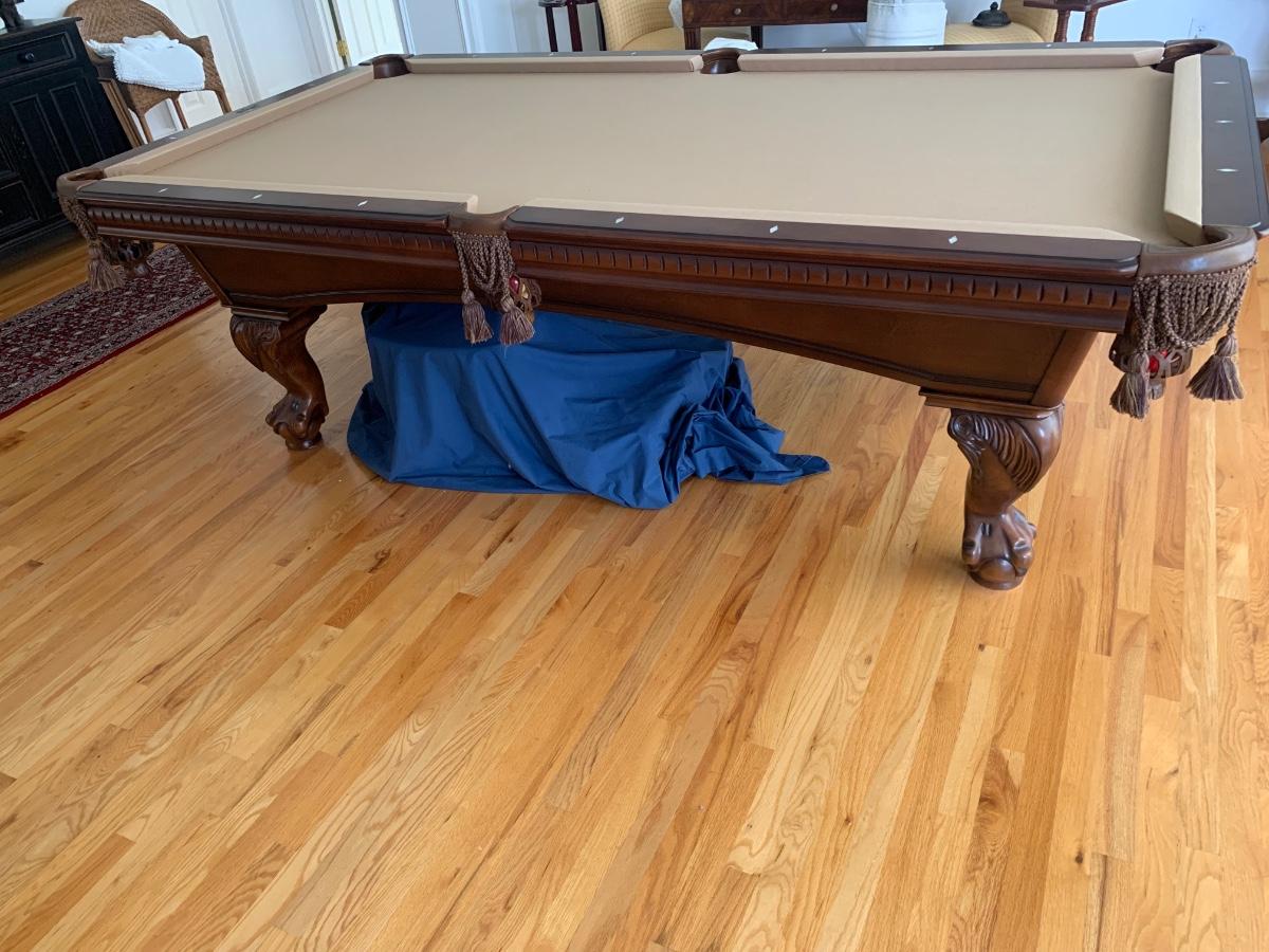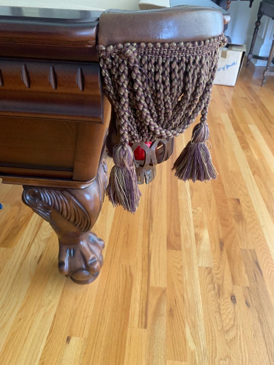 Gorgeous American Heritage 8’ pool table with ball & claw, leather drop pockets, and beige felt. Pool sticks and stand included.