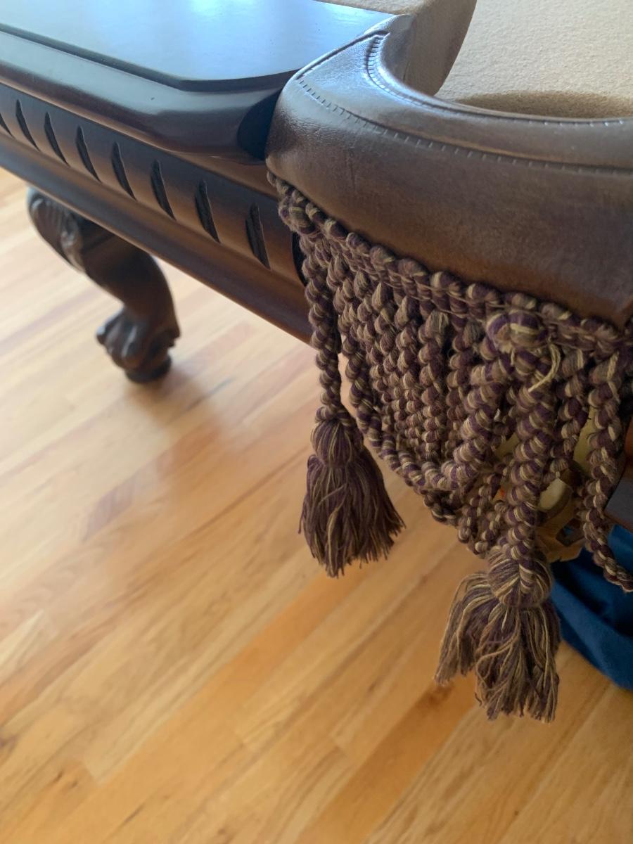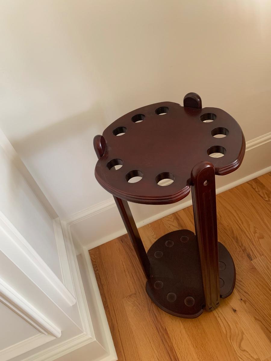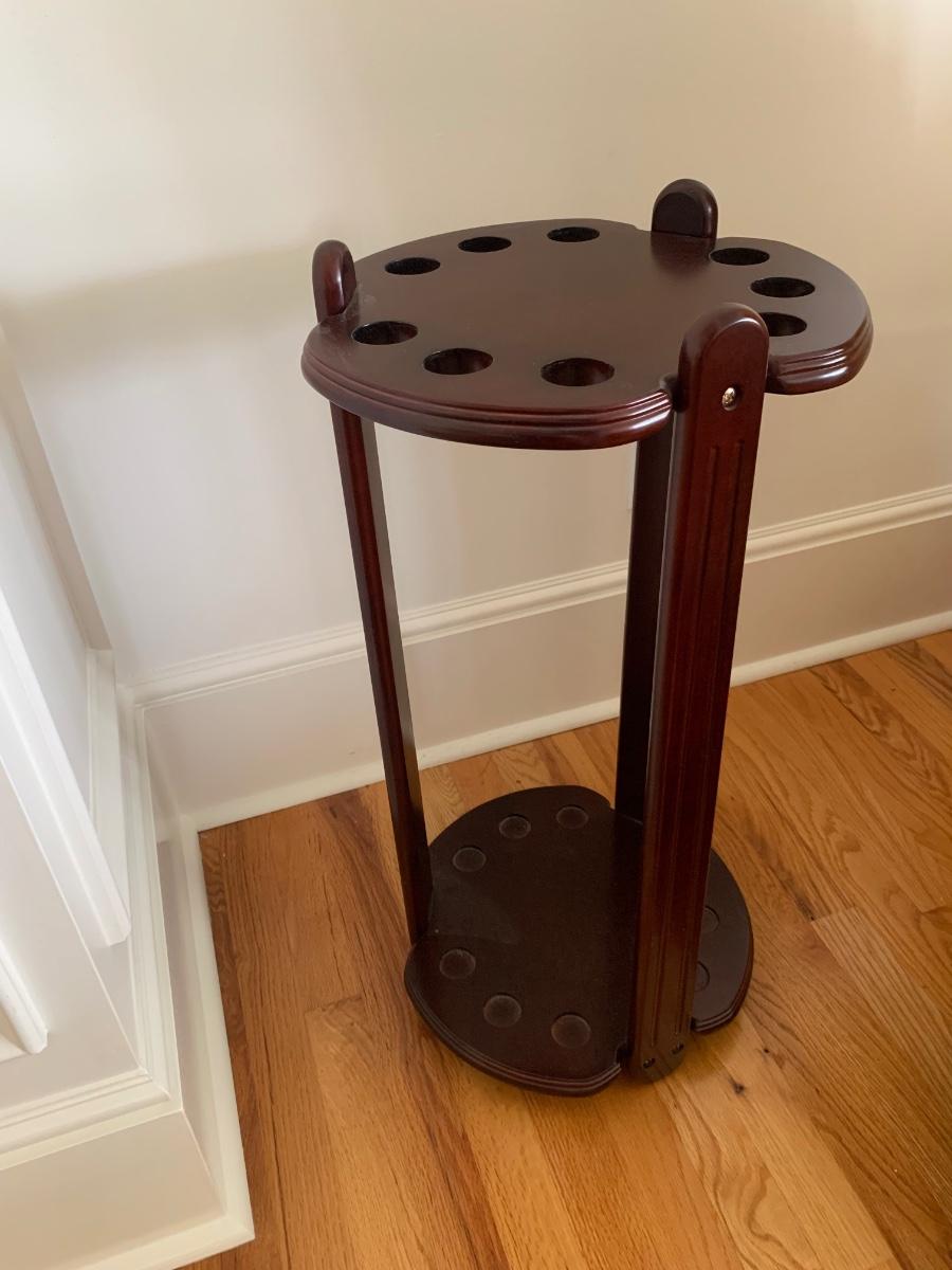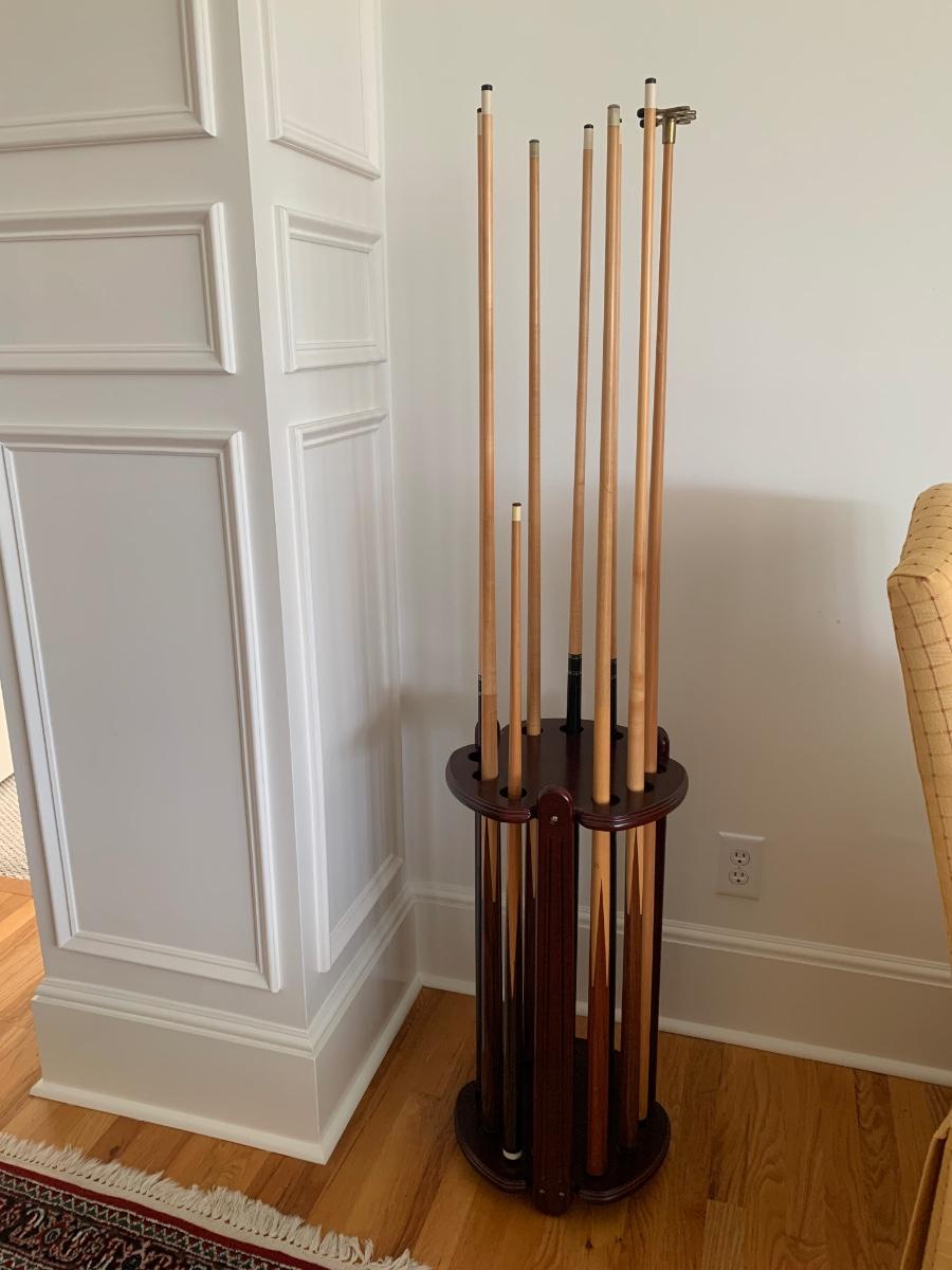 Gorgeous American Heritage 8’ pool table with ball & claw, leather drop pockets, and beige felt. Pool sticks and stand included.