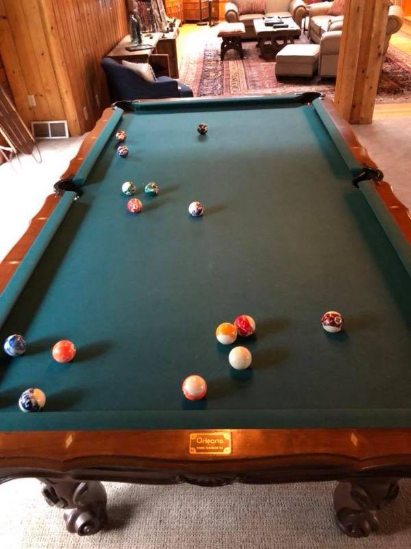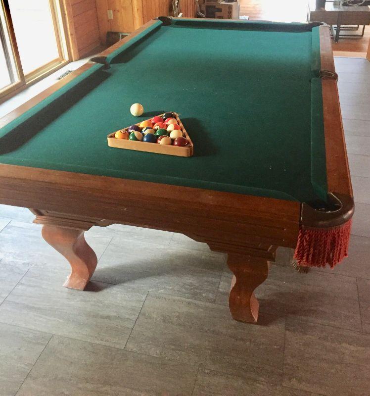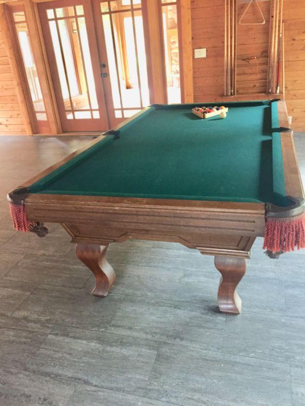 High quality table in great shape. Wall Cue Rack and 6 Cues sold separate.