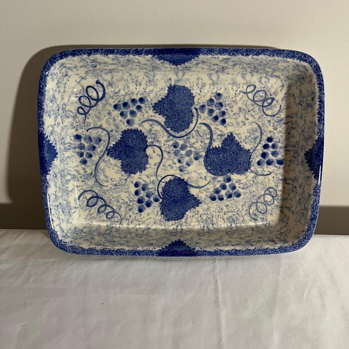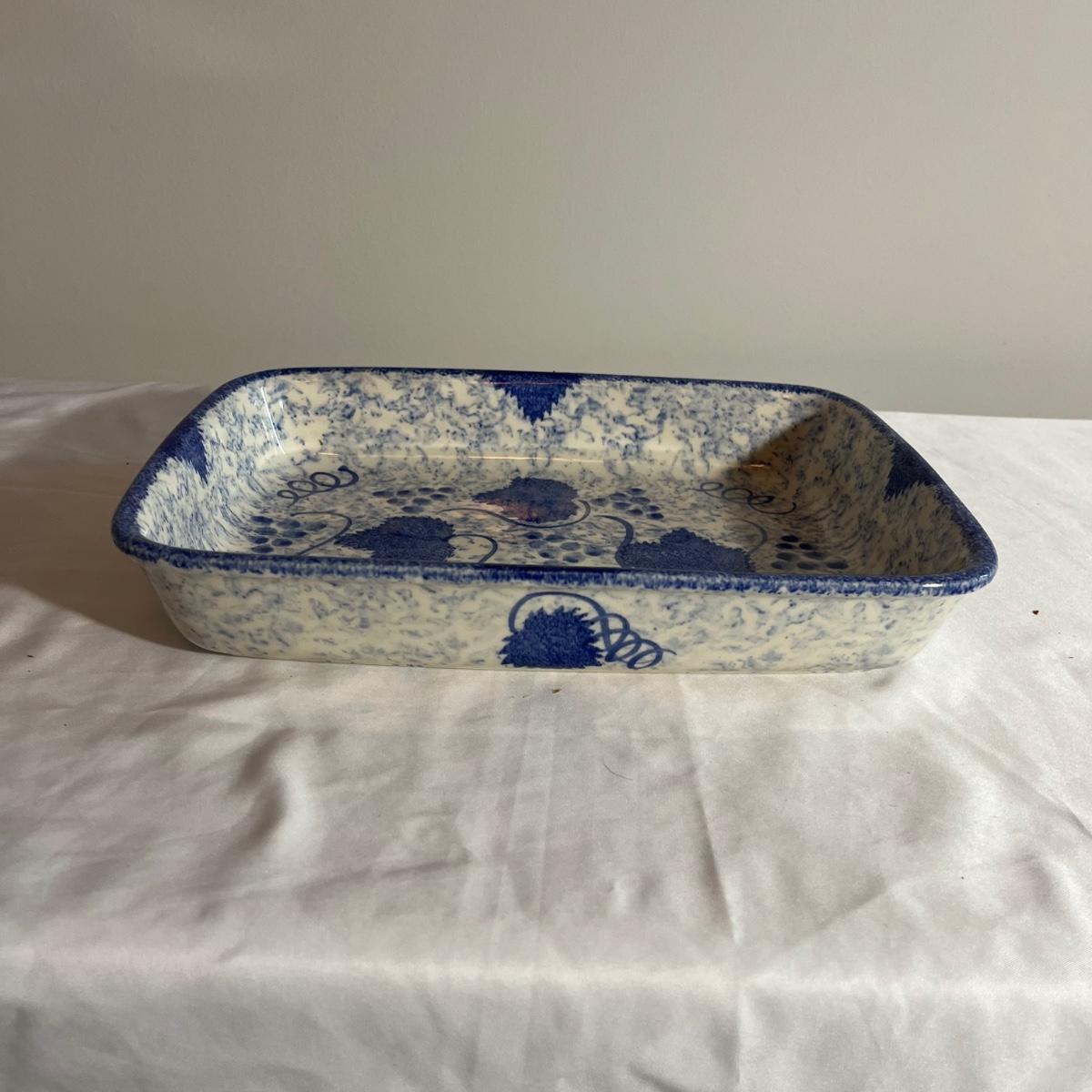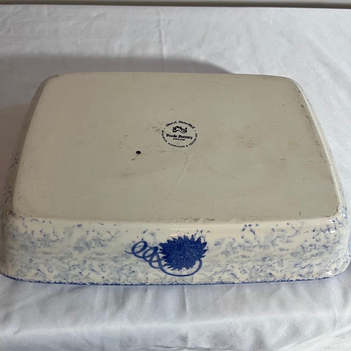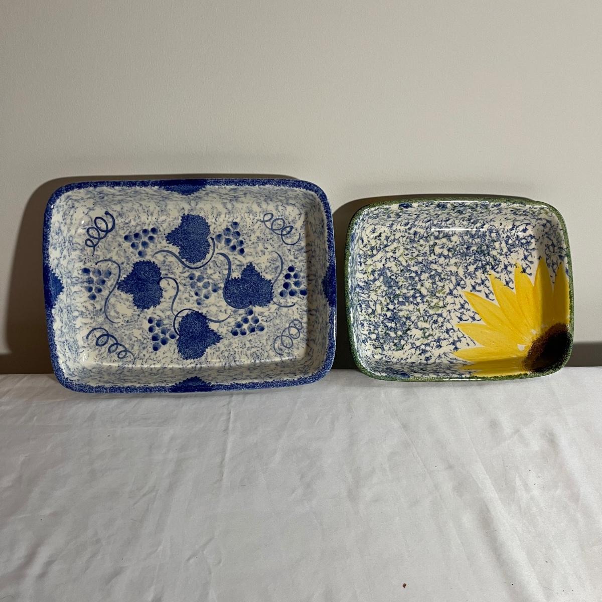 Lot includes a hand painted Poole Pottery serving dish that measures 8.75” x 11.75” x 2”. Also includes a rectangular lasagna serving dish that is unmarked but similar to the Poole pottery dish.