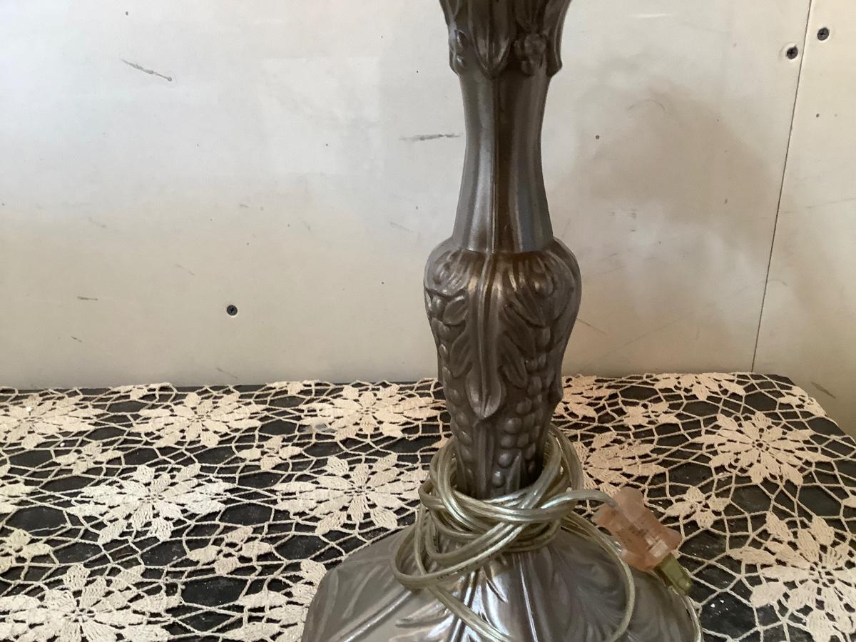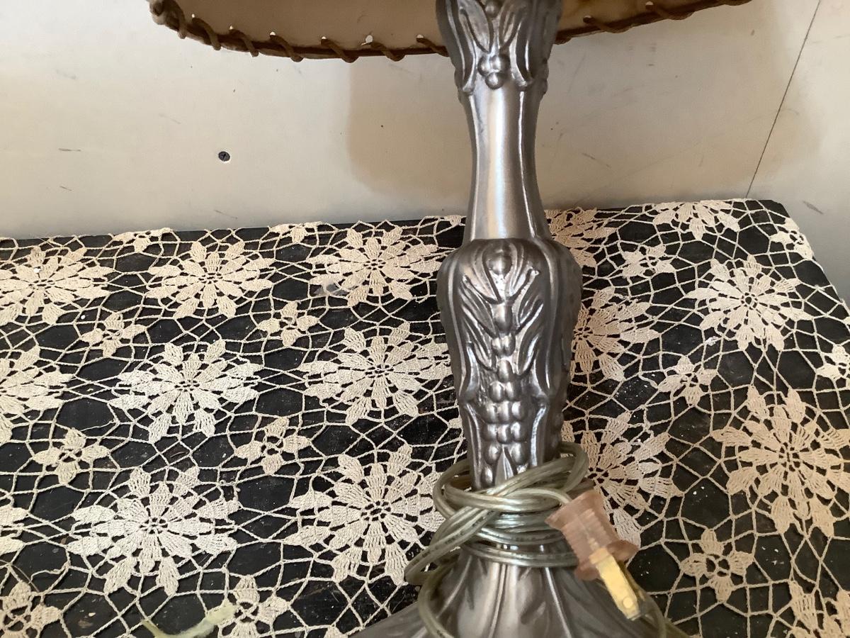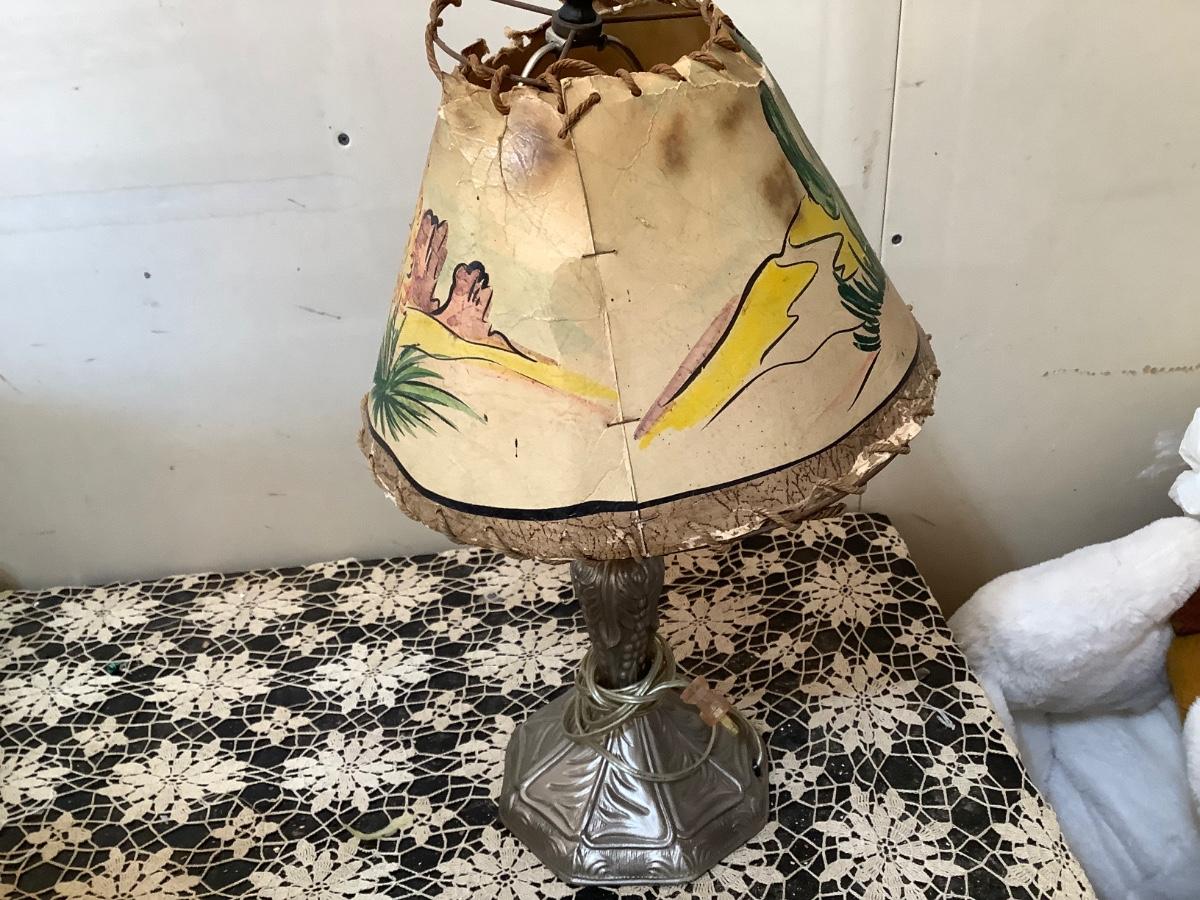 This is a great pop metal table lamp with child’s western scene lamp shade. Lamp shade has damage. Has newer cord