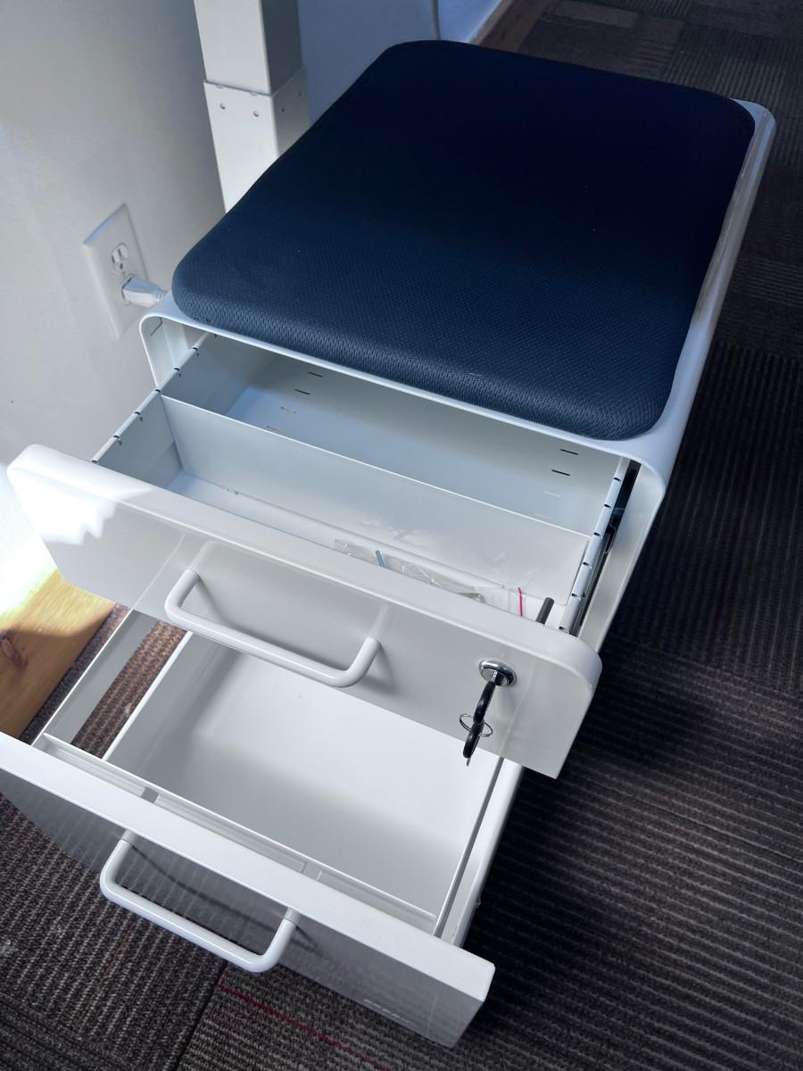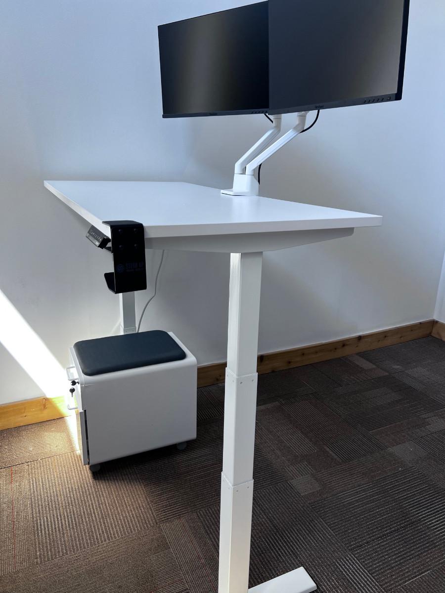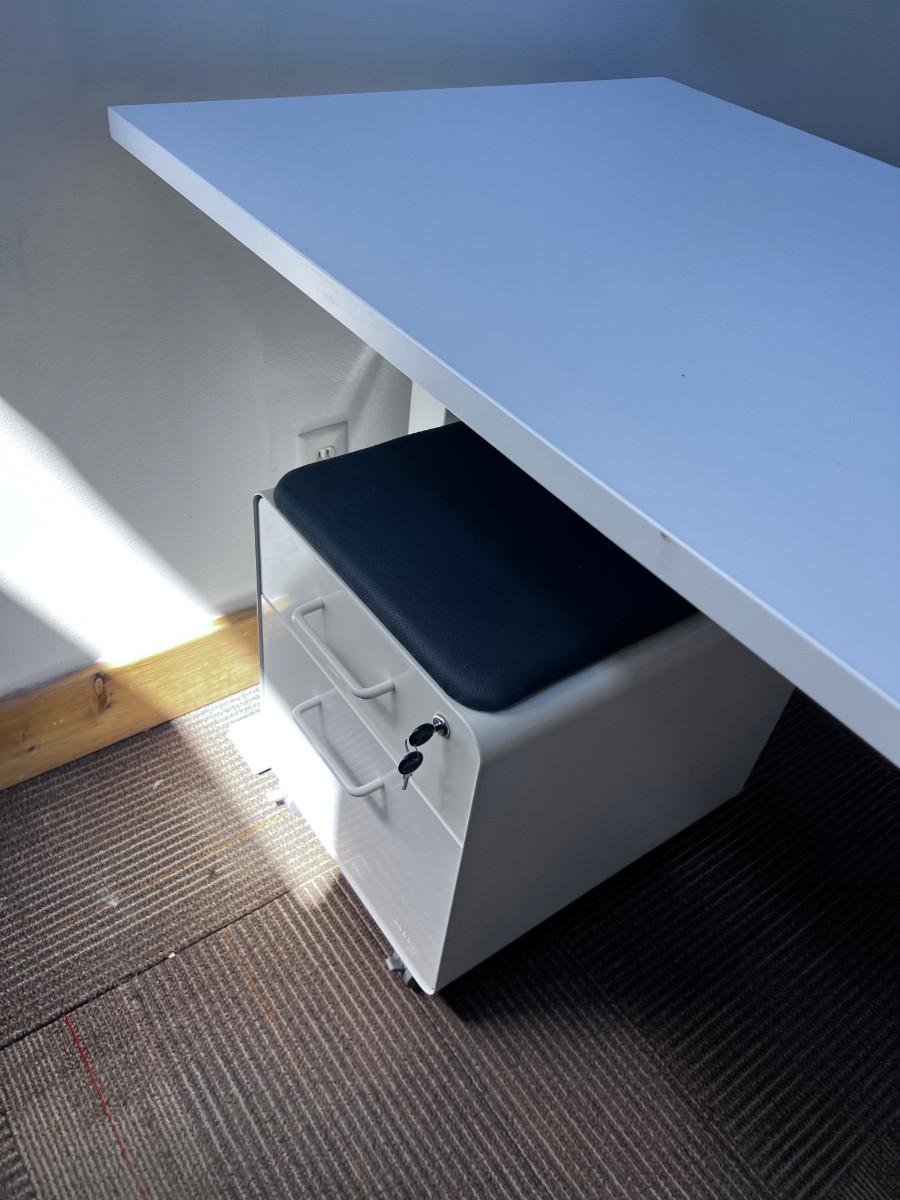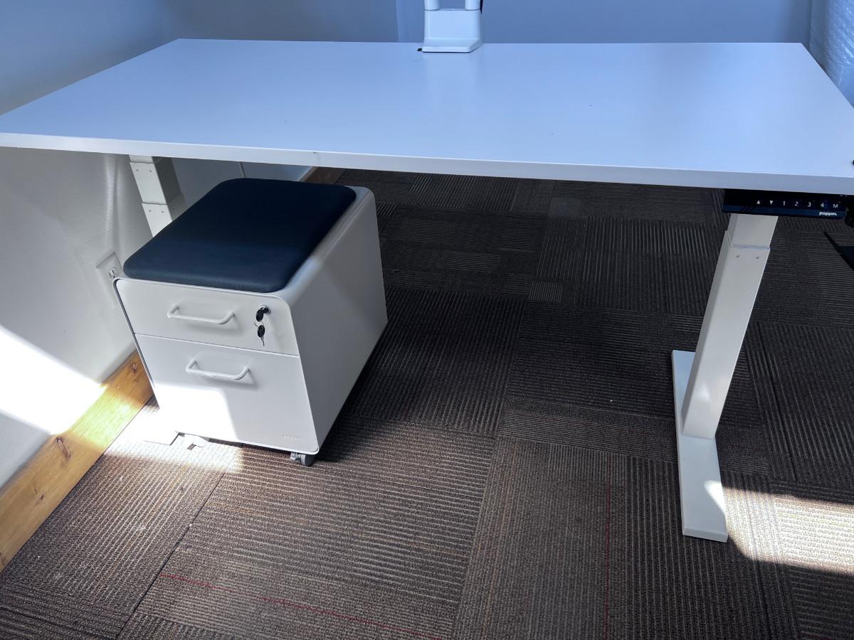 Good Working Condition. Measure 57" X 27" Meant to be standing desks. Lot Includes Mini Stowe Cabinet (2 Drawer) with Magnetic Pad called the Mini Stowe Seat Pad that is usable for a seat. Or Removable Bring Help to move down the Stair from the Second floor