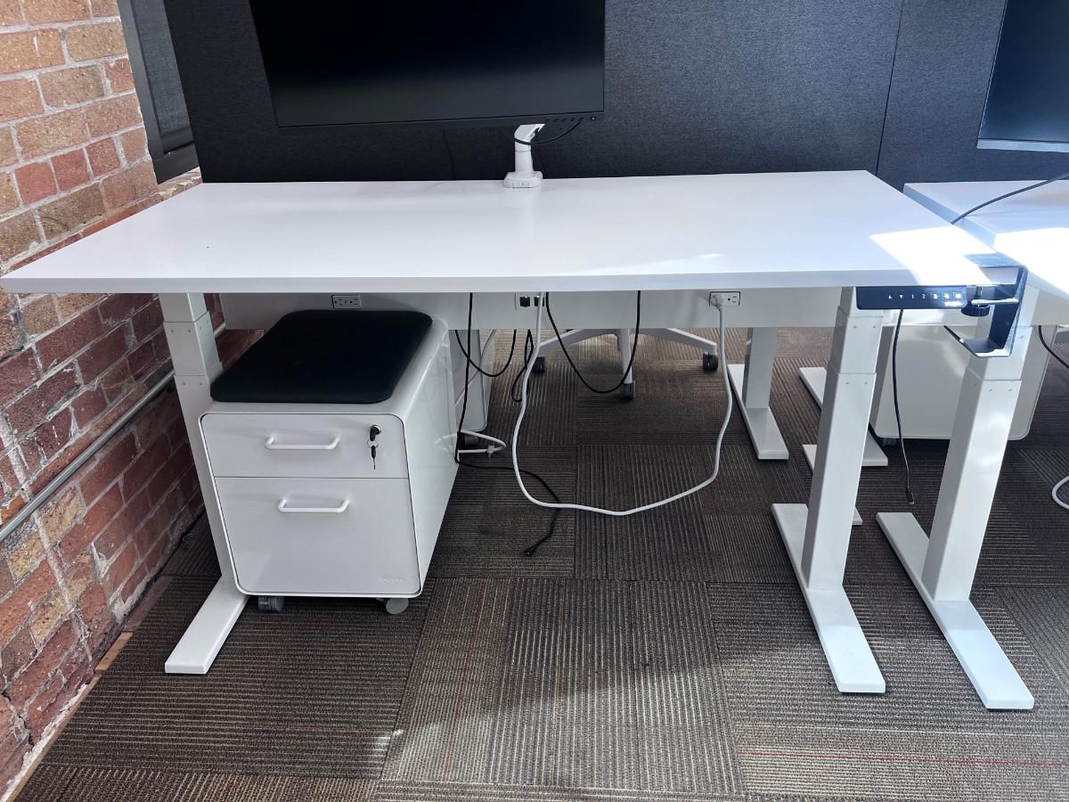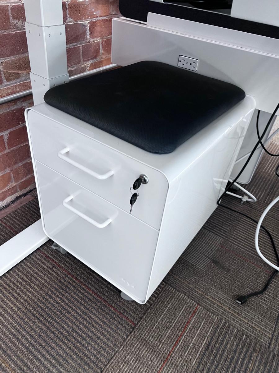 Good Working Condition. Measure 57" X 27" Meant to be standing desks. Lot Includes Mini Stowe Cabinet (2 Drawer) with Magnetic Pad called the Mini Stowe Seat Pad that is usable for a seat. Or Removable Bring Help to move down the Stair from the Second floor. There is no Elevator in this historical building.