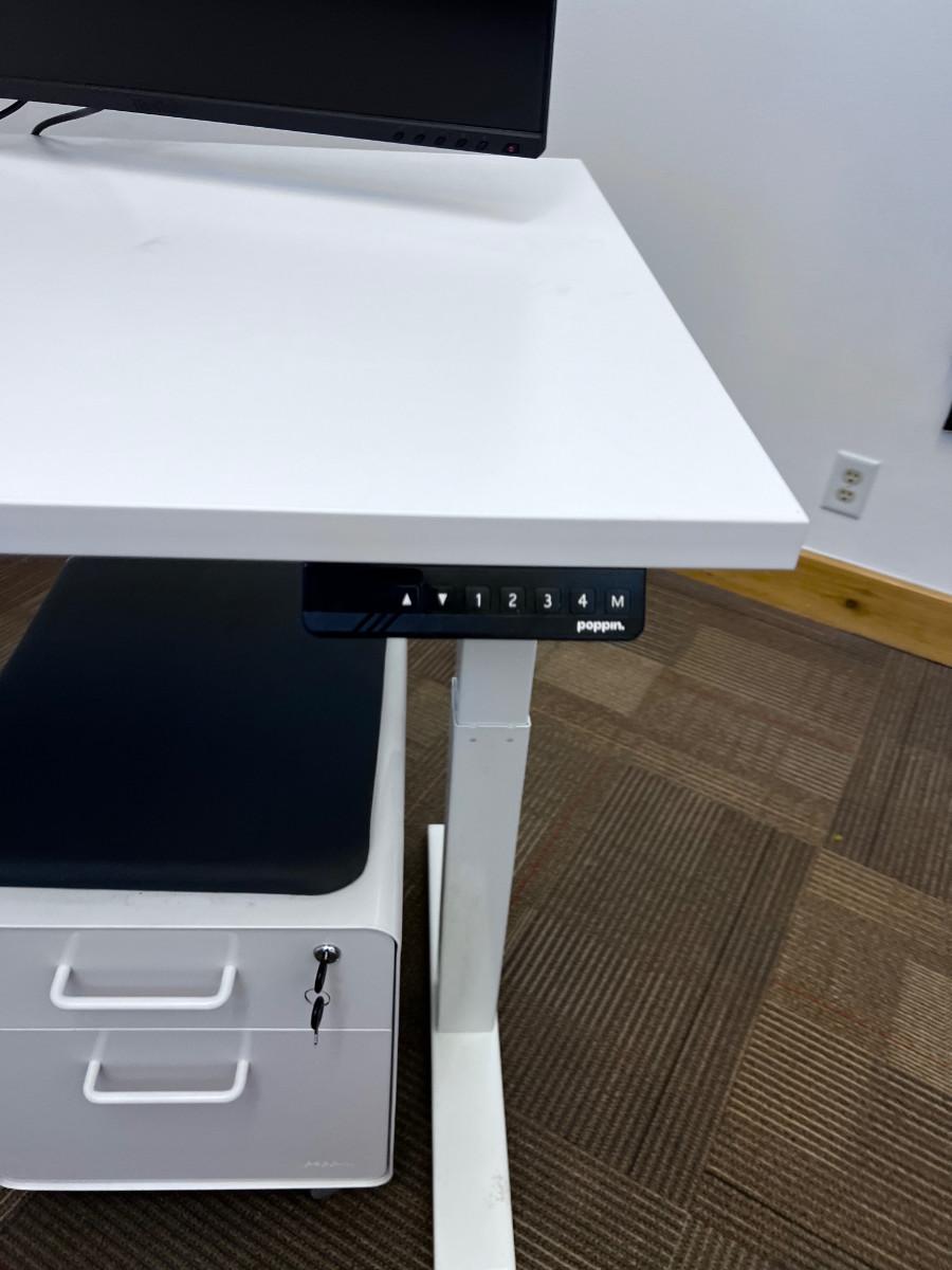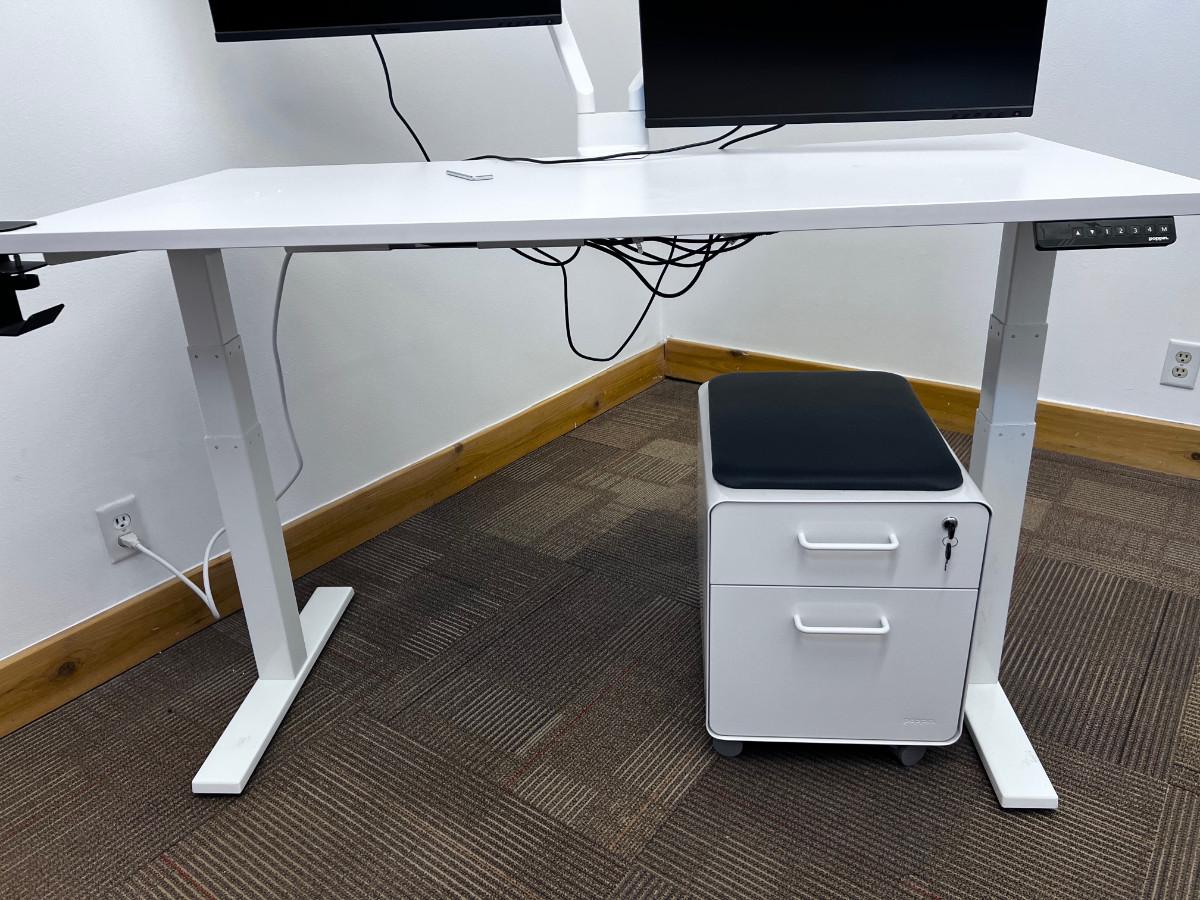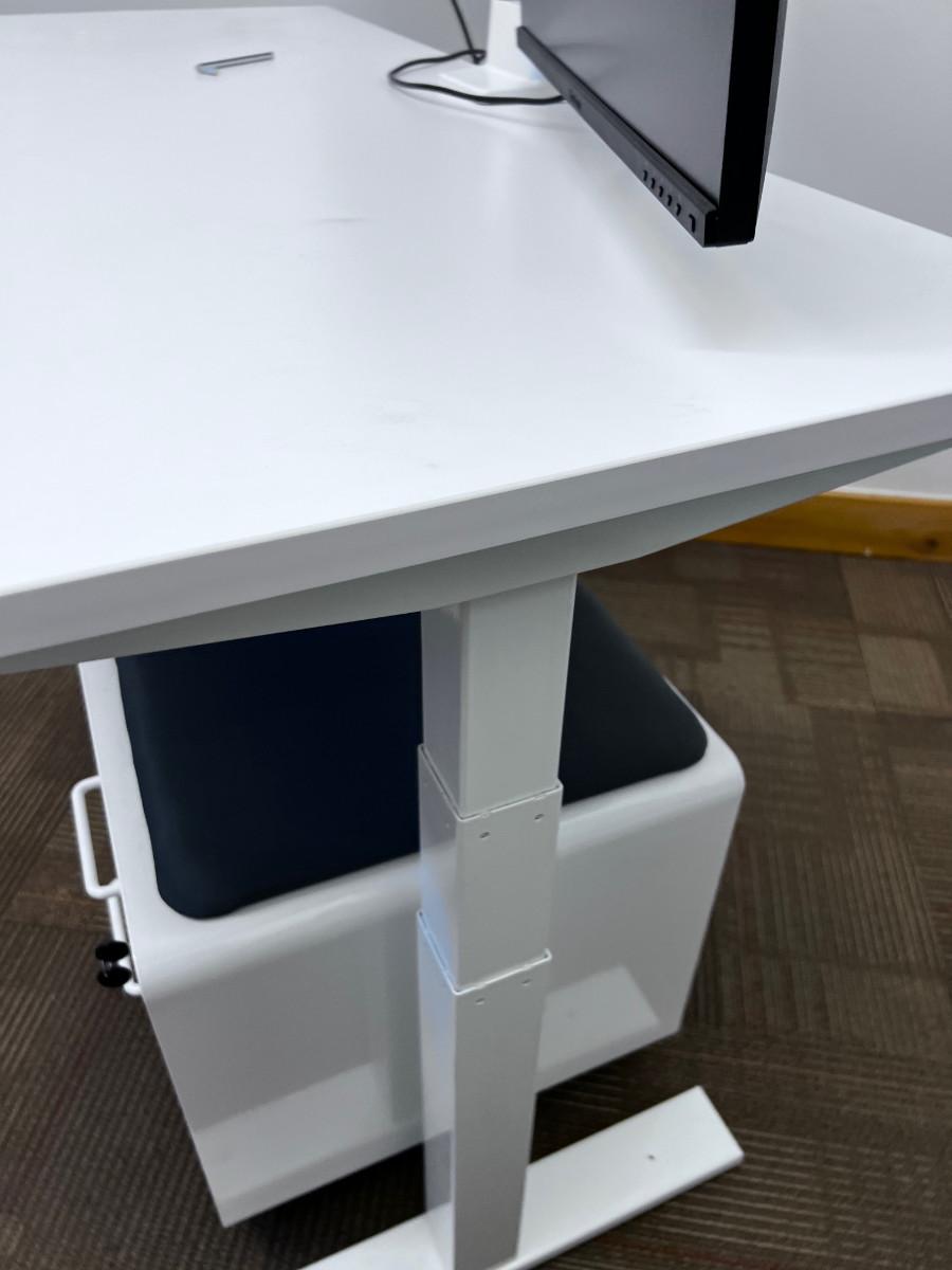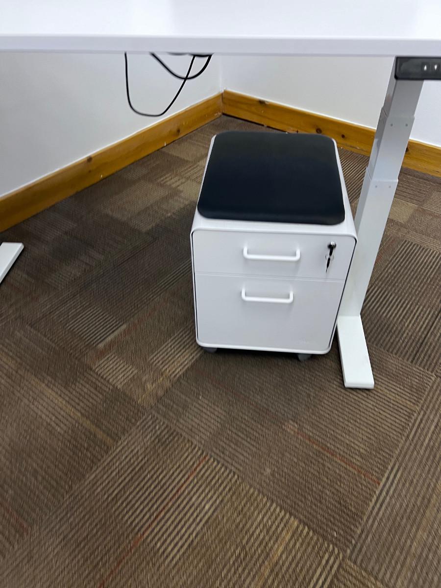Good Working Condition. Measure 57" X 27" Meant to be standing desks. Lot Includes Mini Stowe Cabinet (2 Drawer) with Magnetic Pad called the Mini Stowe Seat Pad that is usable for a seat. Or Removable Bring Help to move down the Stair from the Second floor