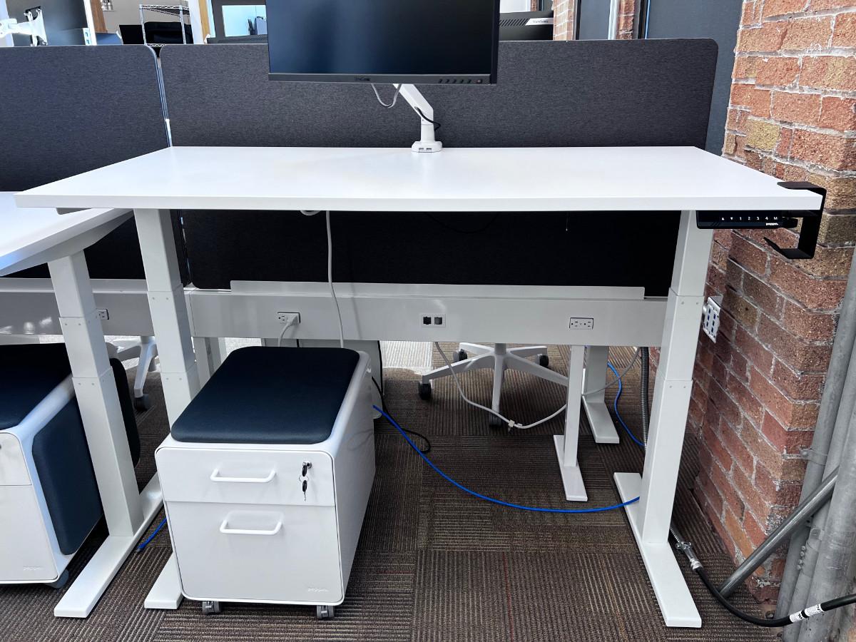 Good Working Condition. Measure 57" X 27" Meant to be standing desks. Lot Includes Mini Stowe Cabinet (2 Drawer) with Magnetic Pad called the Mini Stowe Seat Pad that is usable for a seat. Or Removable Bring Help to move down the Stair from the Second floor. There is no Elevator in this historical building.