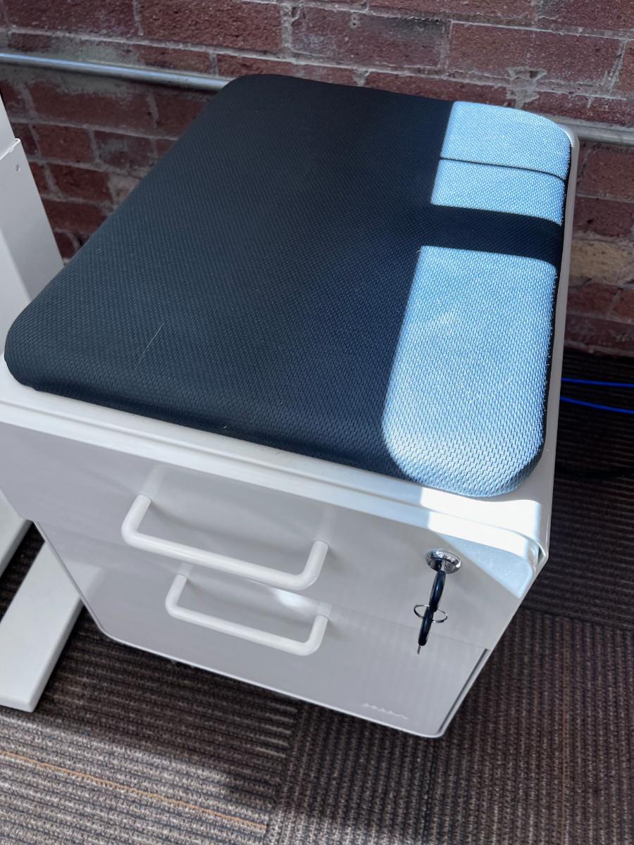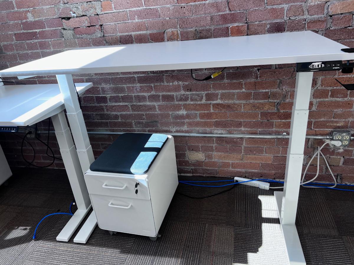 Good Working Condition. Measure 57" X 27" Meant to be standing desks. Lot Includes Mini Stowe Cabinet (2 Drawer) with Magnetic Pad called the Mini Stowe Seat Pad that is usable for a seat. Or Removable Bring Help to move down the Stair from the Second floor. There is no Elevator in this historical building.