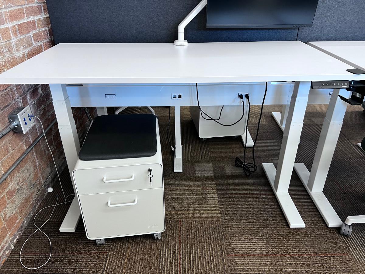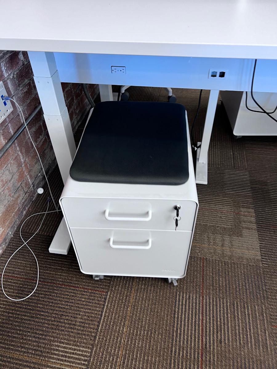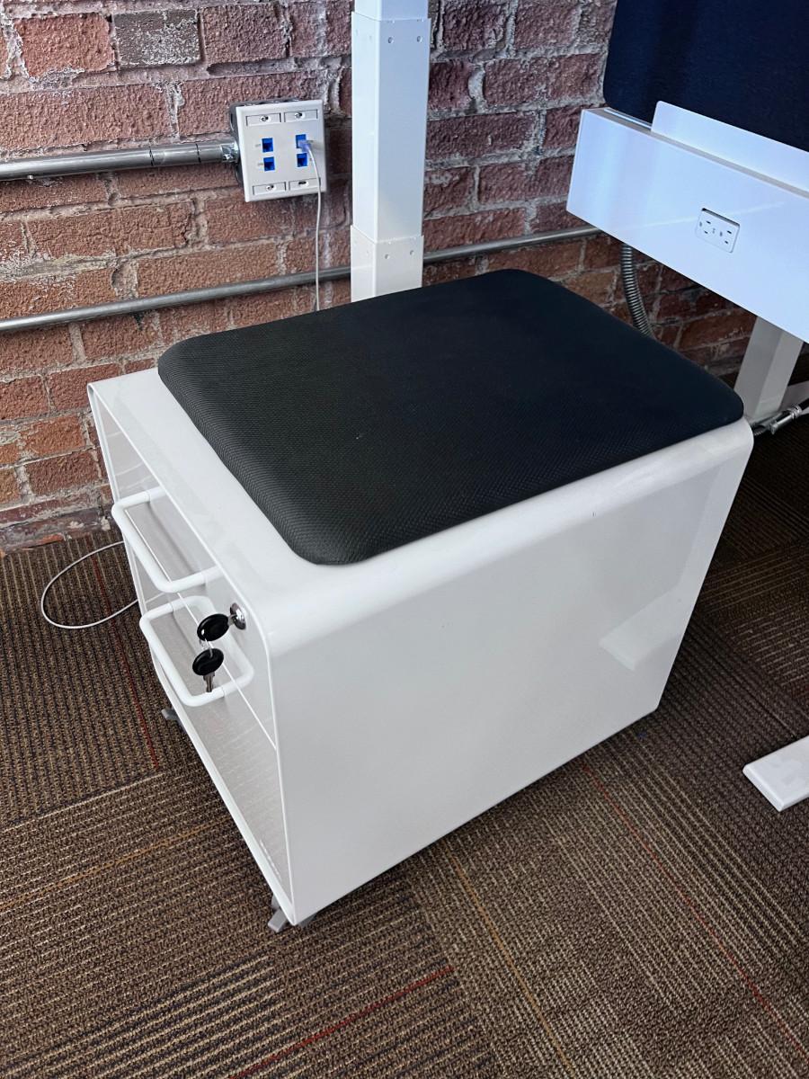 Good Working Condition. Measure 57" X 27" Meant to be standing desks. Lot Includes Mini Stowe Cabinet (2 Drawer) with Magnetic Pad called the Mini Stowe Seat Pad that is usable for a seat. Or Removable Bring Help to move down the Stair from the Second floor. There is no Elevator in this historical building.
