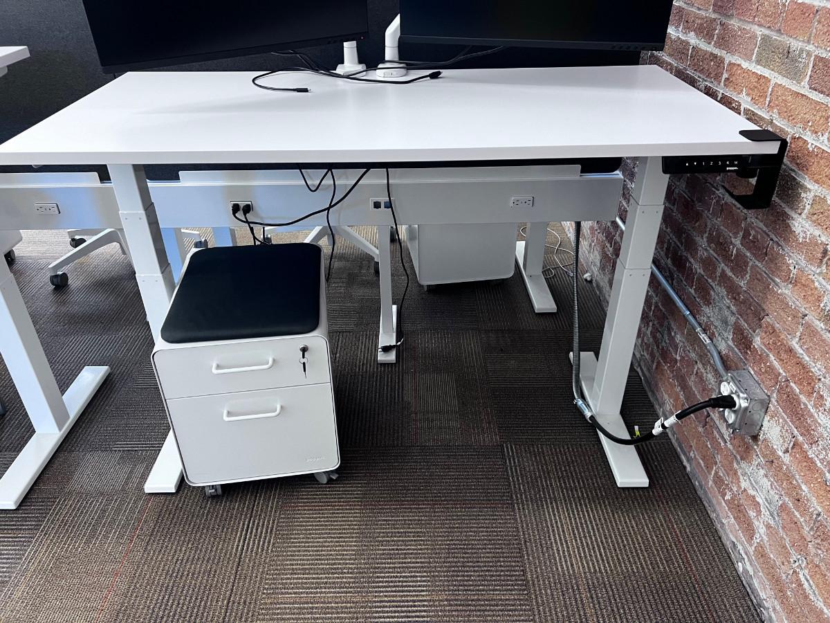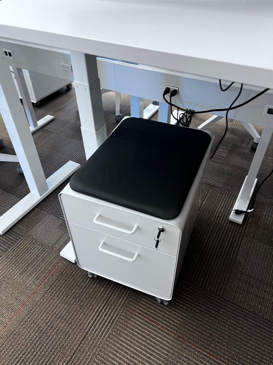 Good Working Condition. Measure 57" X 27" Meant to be standing desks. Lot Includes Mini Stowe Cabinet (2 Drawer) with Magnetic Pad called the Mini Stowe Seat Pad that is usable for a seat. Or Removable Bring Help to move down the Stair from the Second floor. There is no Elevator in this historical building.