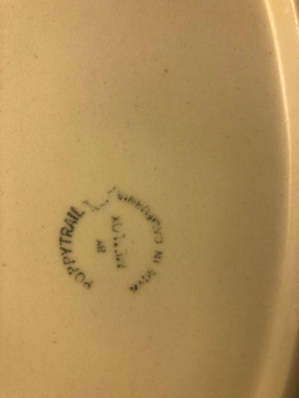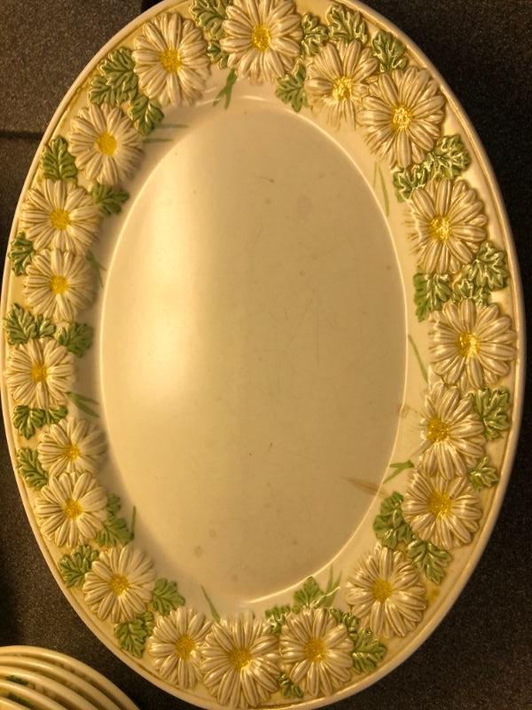 Set includes 5 soup bowls, 4 small bowls, 2 large oval serving plates, 2 vegetable serving bowls, 1 very interesting attached gravy type serving piece, 1 small oval serving piece, 1 sugar, 1 creamer and a very adorable salt and pepper set.
