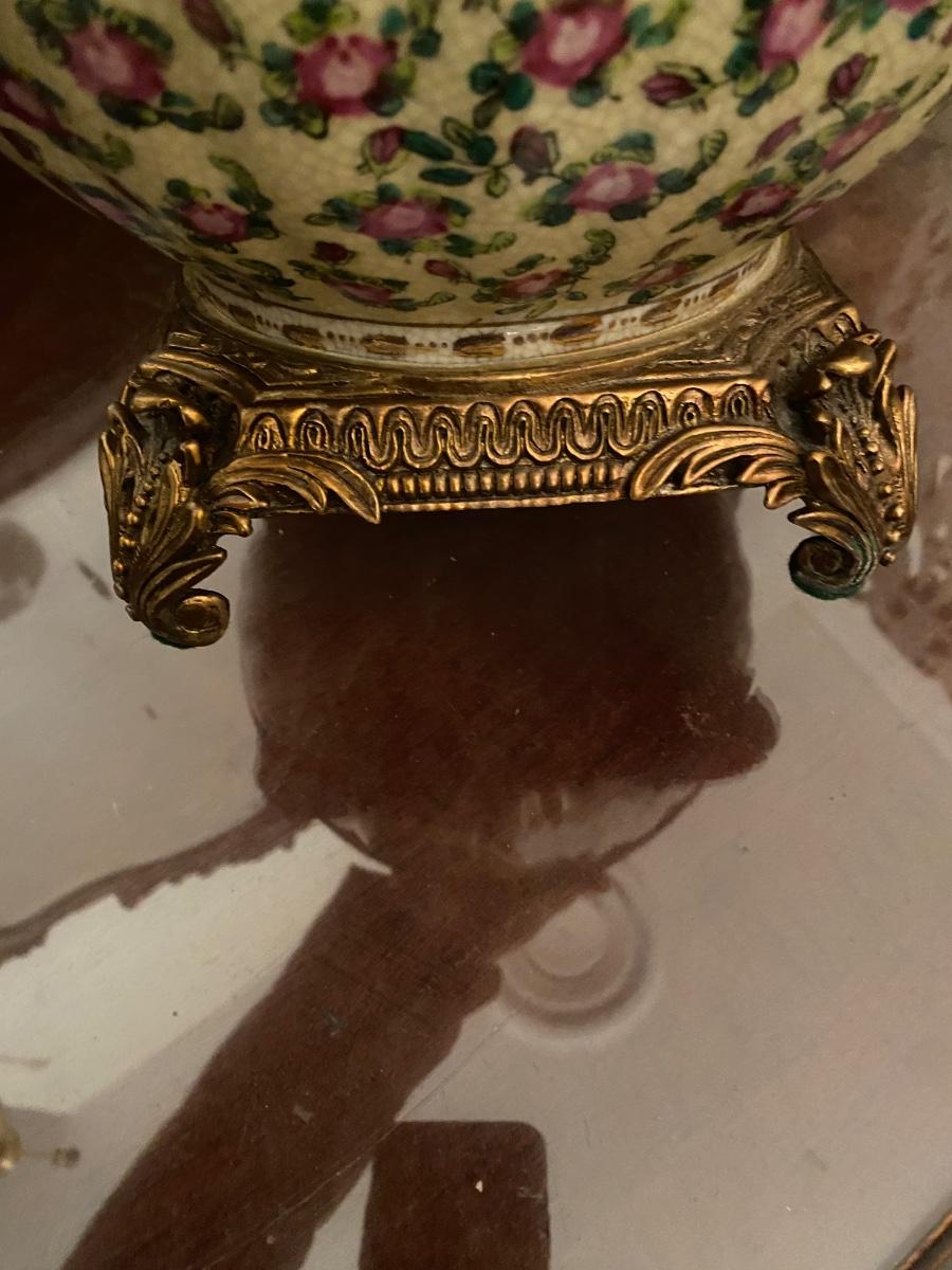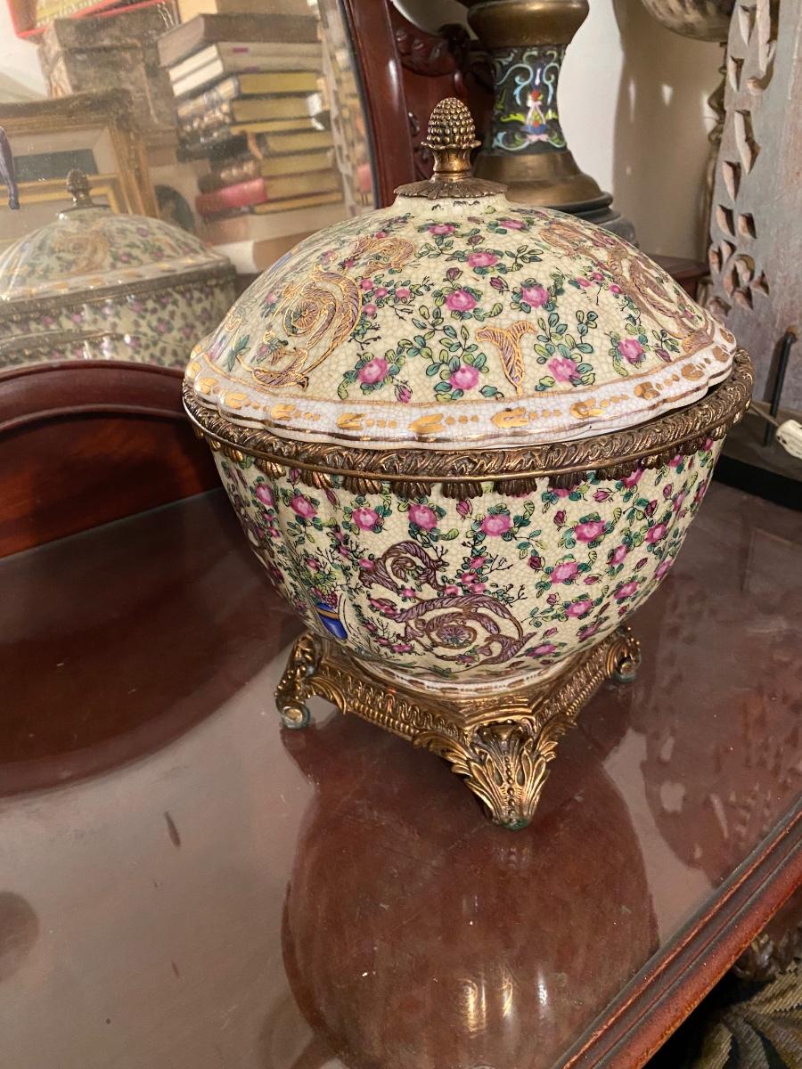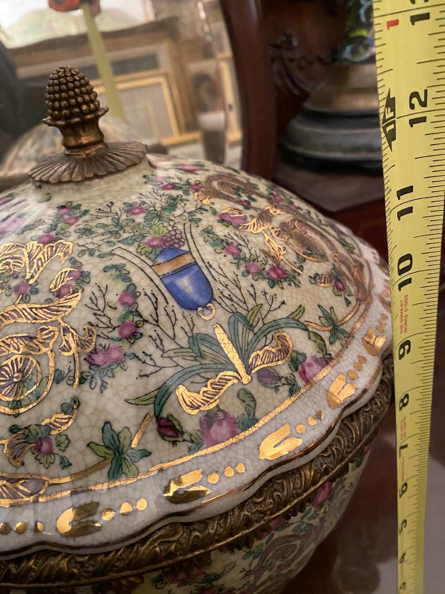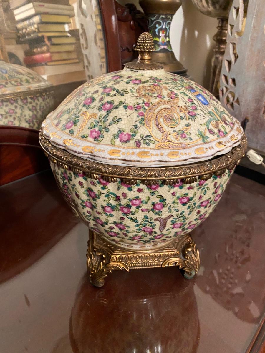 Porcelain ART Pottery, brass base, separate lid with brass top. Crazing throuout but no cracks or chips. 8"H without lid, 12 with. 10" Diameter