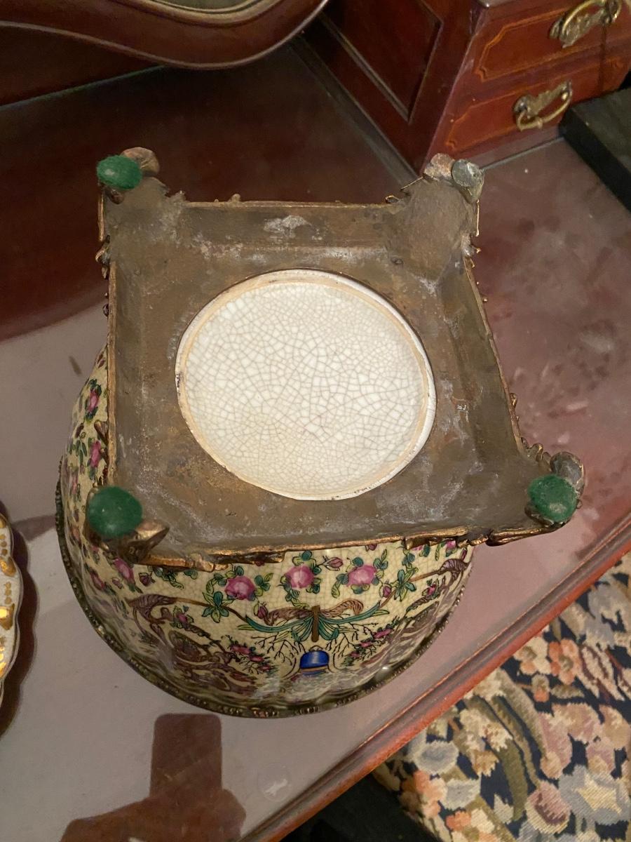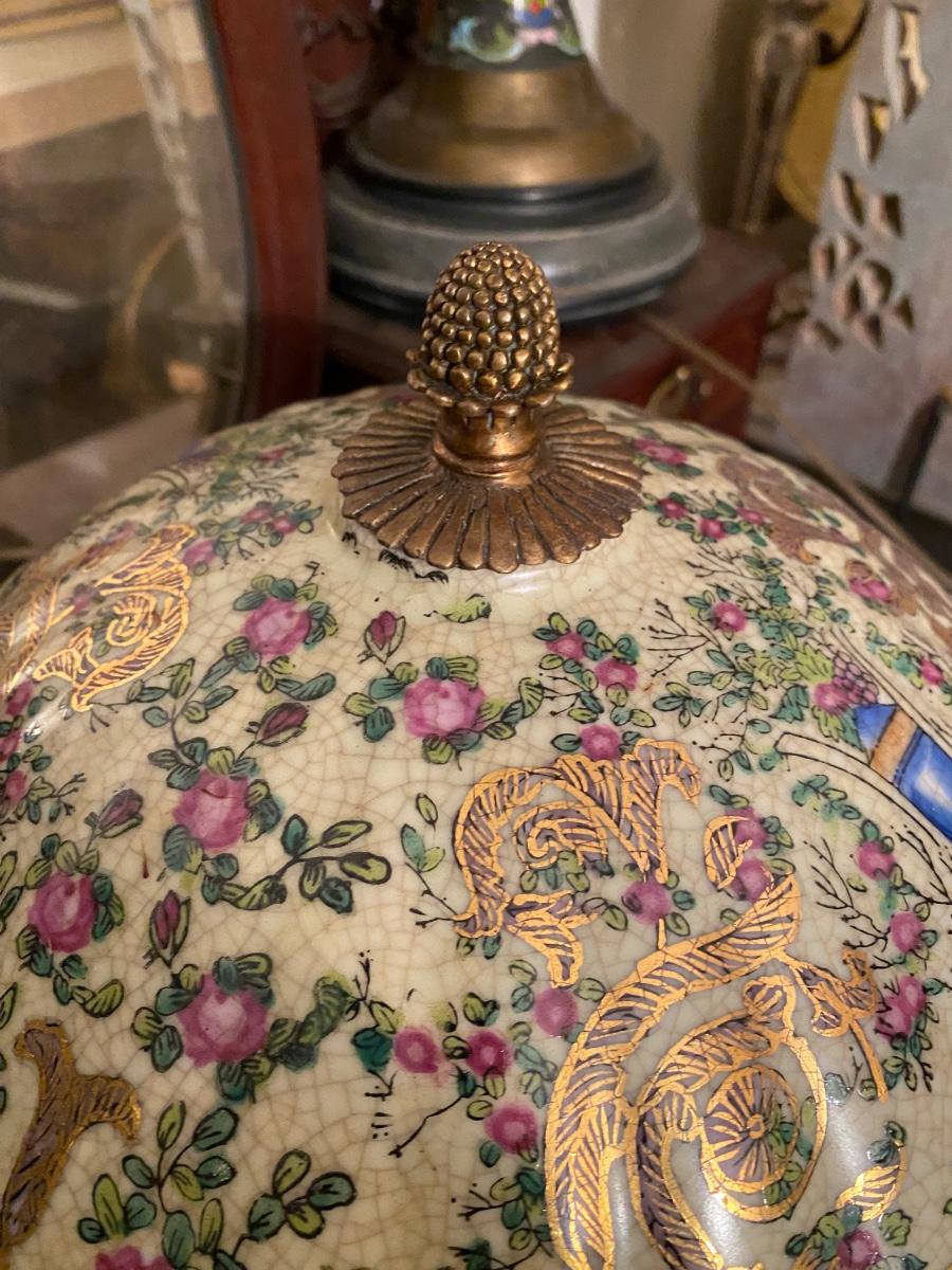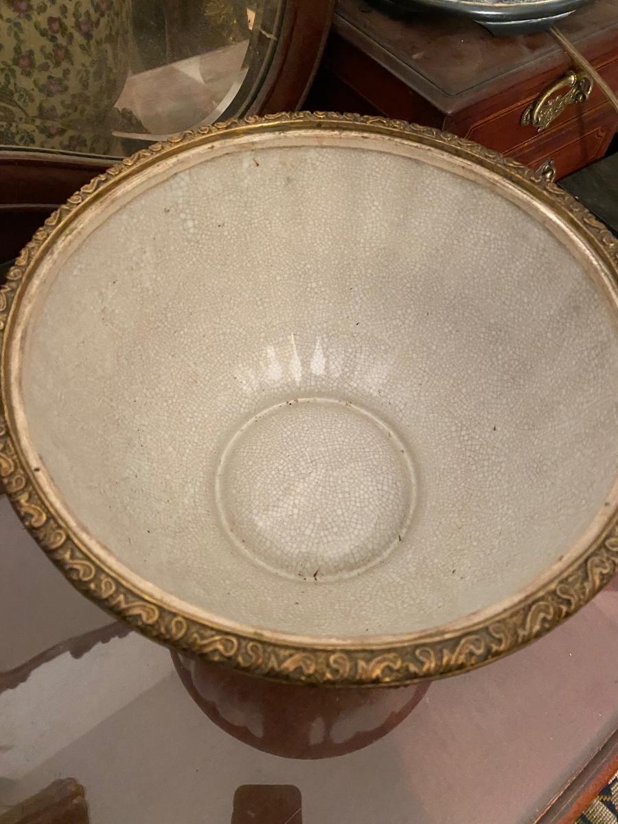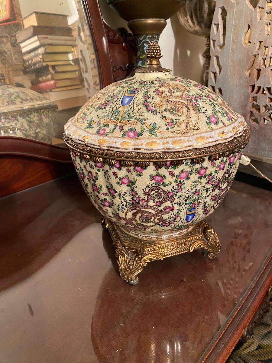Porcelain ART Pottery, brass base, separate lid with brass top. Crazing throuout but no cracks or chips. 8"H without lid, 12 with. 10" Diameter