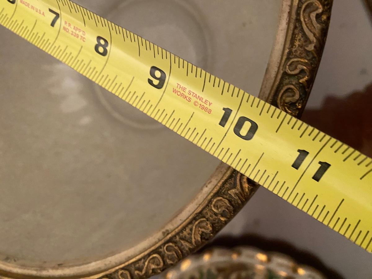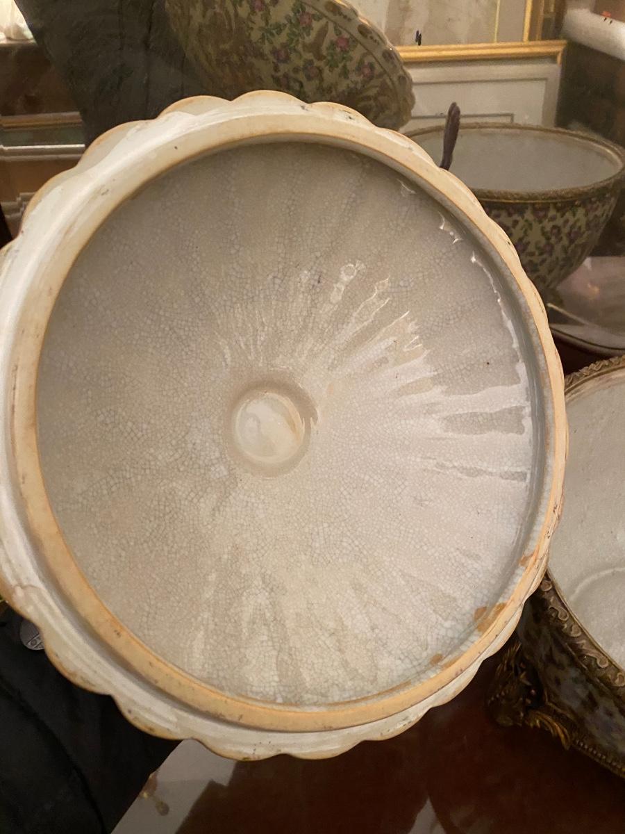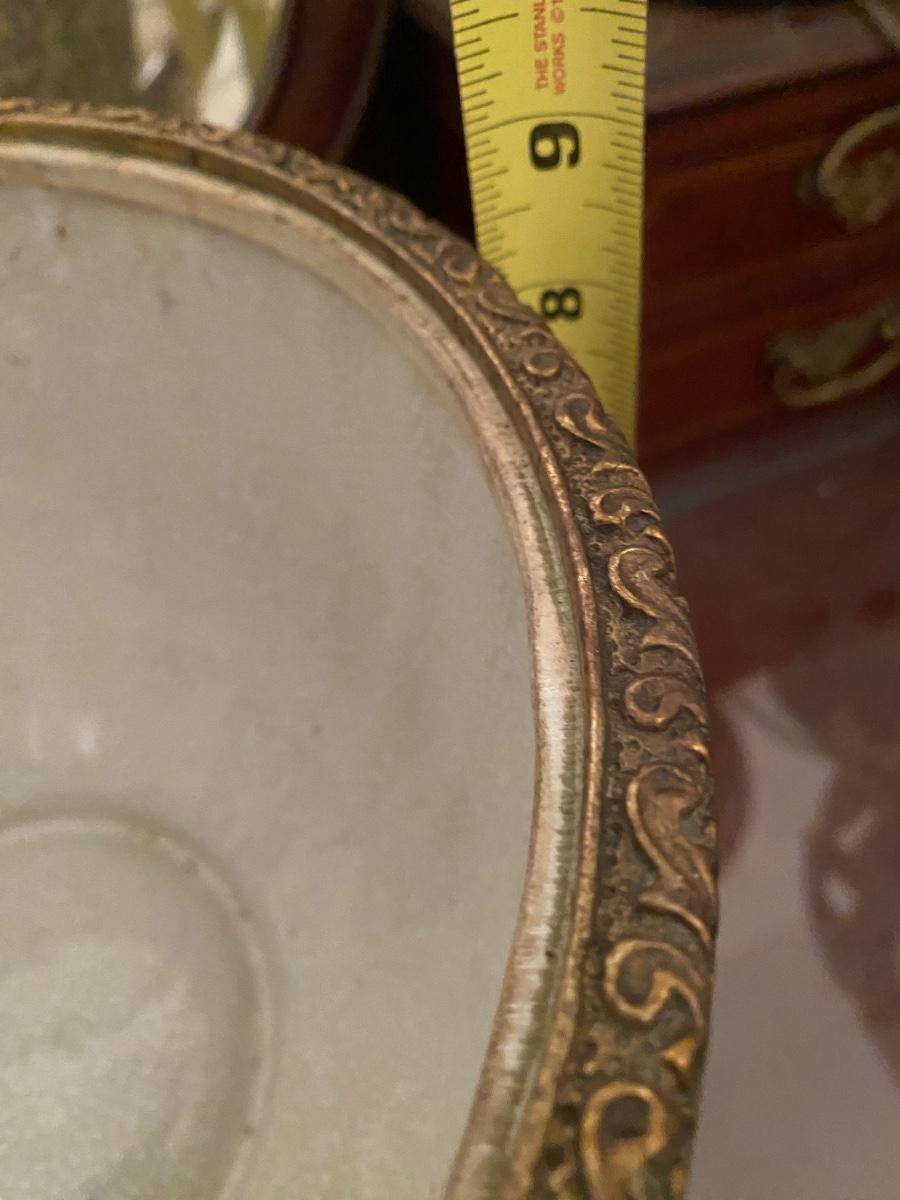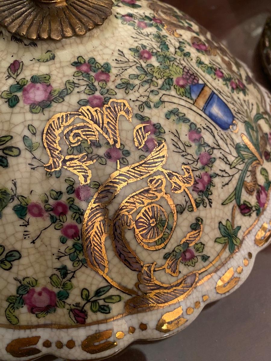 Porcelain ART Pottery, brass base, separate lid with brass top. Crazing throuout but no cracks or chips. 8"H without lid, 12 with. 10" Diameter