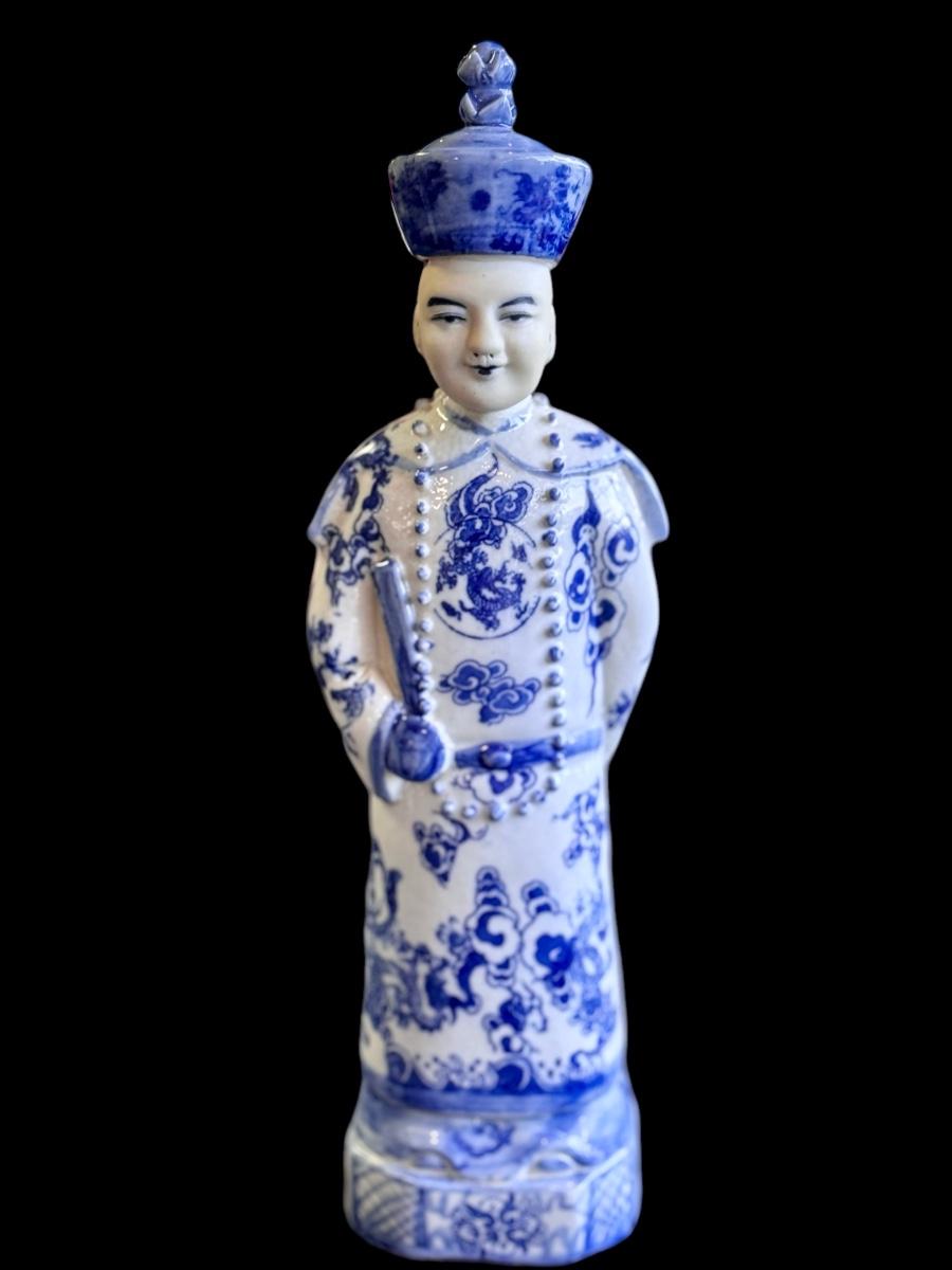 Vintage Blue and White Porcelain Style Chinese Emperor Statue