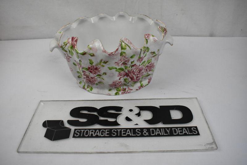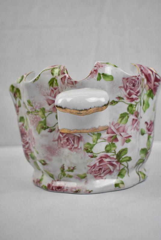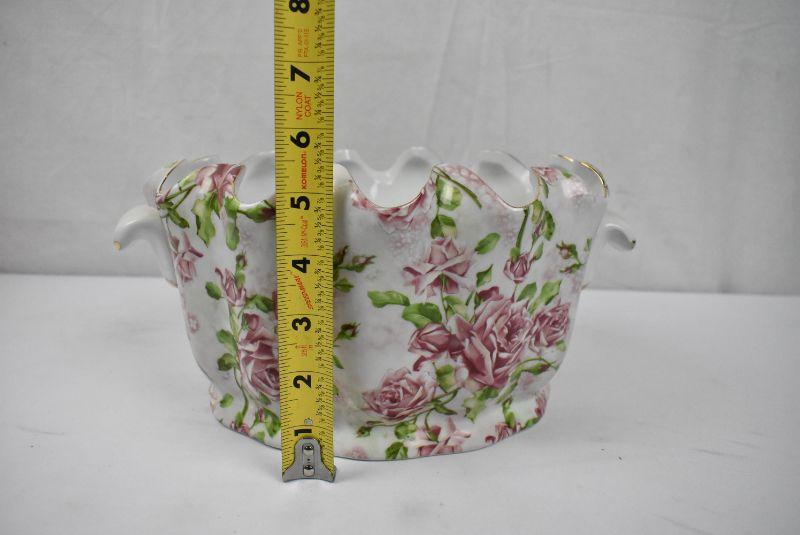 Porcelain Bowl with Side Handles. White with Pink roses and green leaves. Gold trim. Antique Reflections by J Godinger & Co