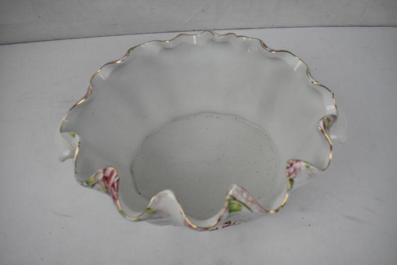 Porcelain Bowl with Side Handles. White w/ Pink roses & green leaves. Gold trim
