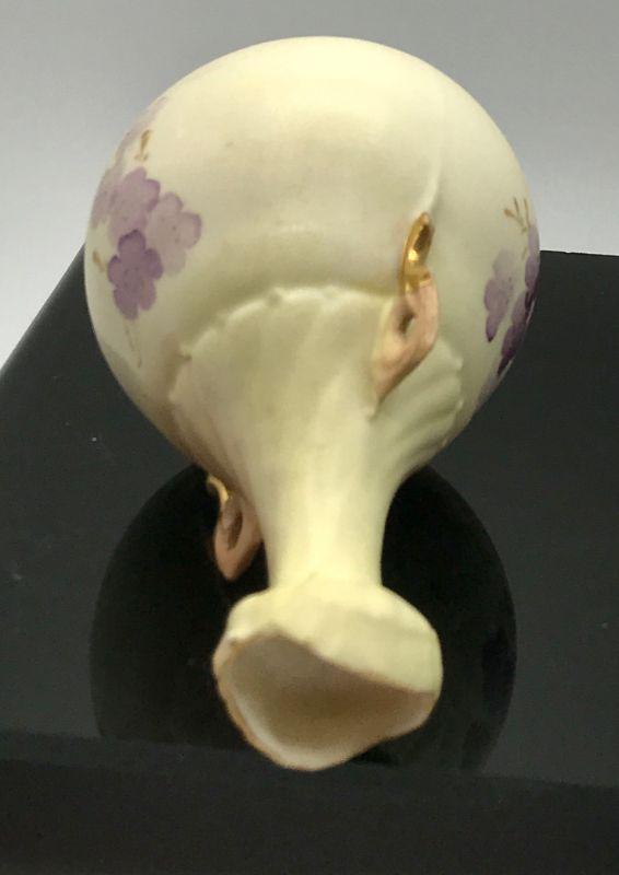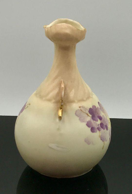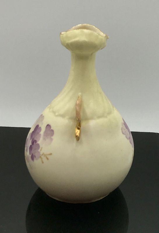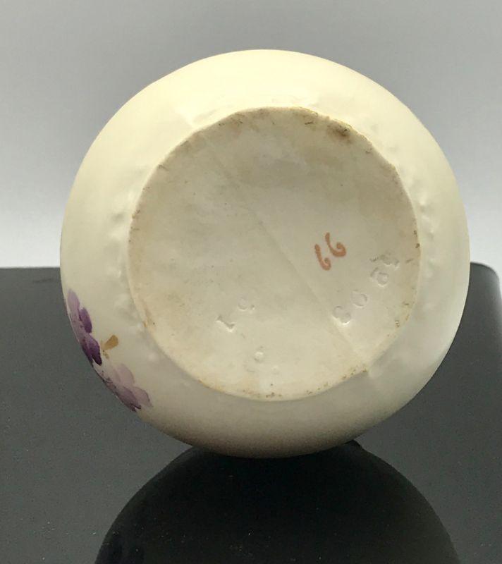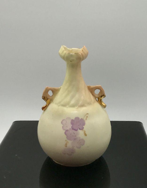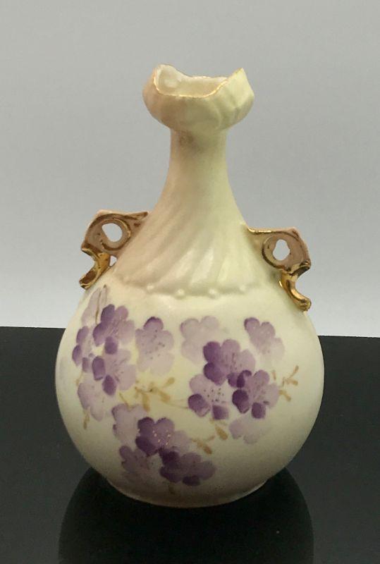 Small Porcelain Bud Vase. Purple painted flowers with gold accent handles. Unusual shape and opening. Numbered on the bottom. Good Condition, but there is a brush spot on side of paint that appears to be under the glaze and the mouth of vase is a little rough.