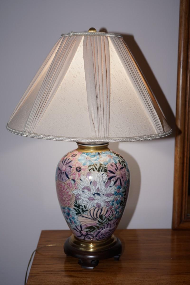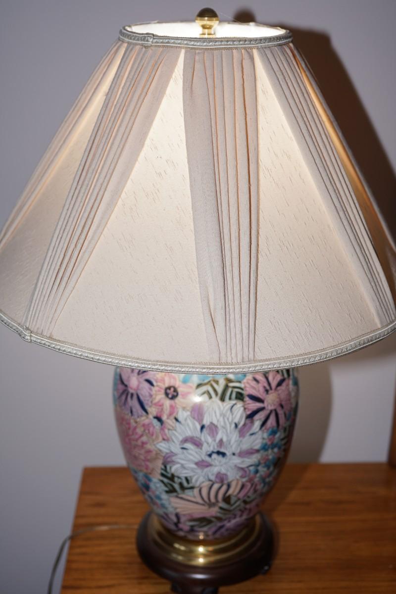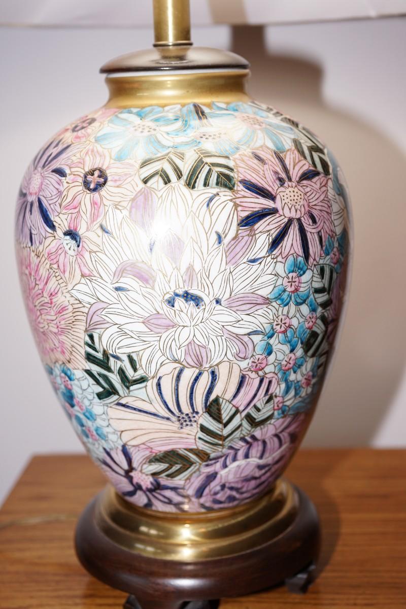 PORCELAIN CERAMIC FLORAL TABLE LAMP /MAHOGANY AND BRASS PLATEAU ASIAN FLORALS