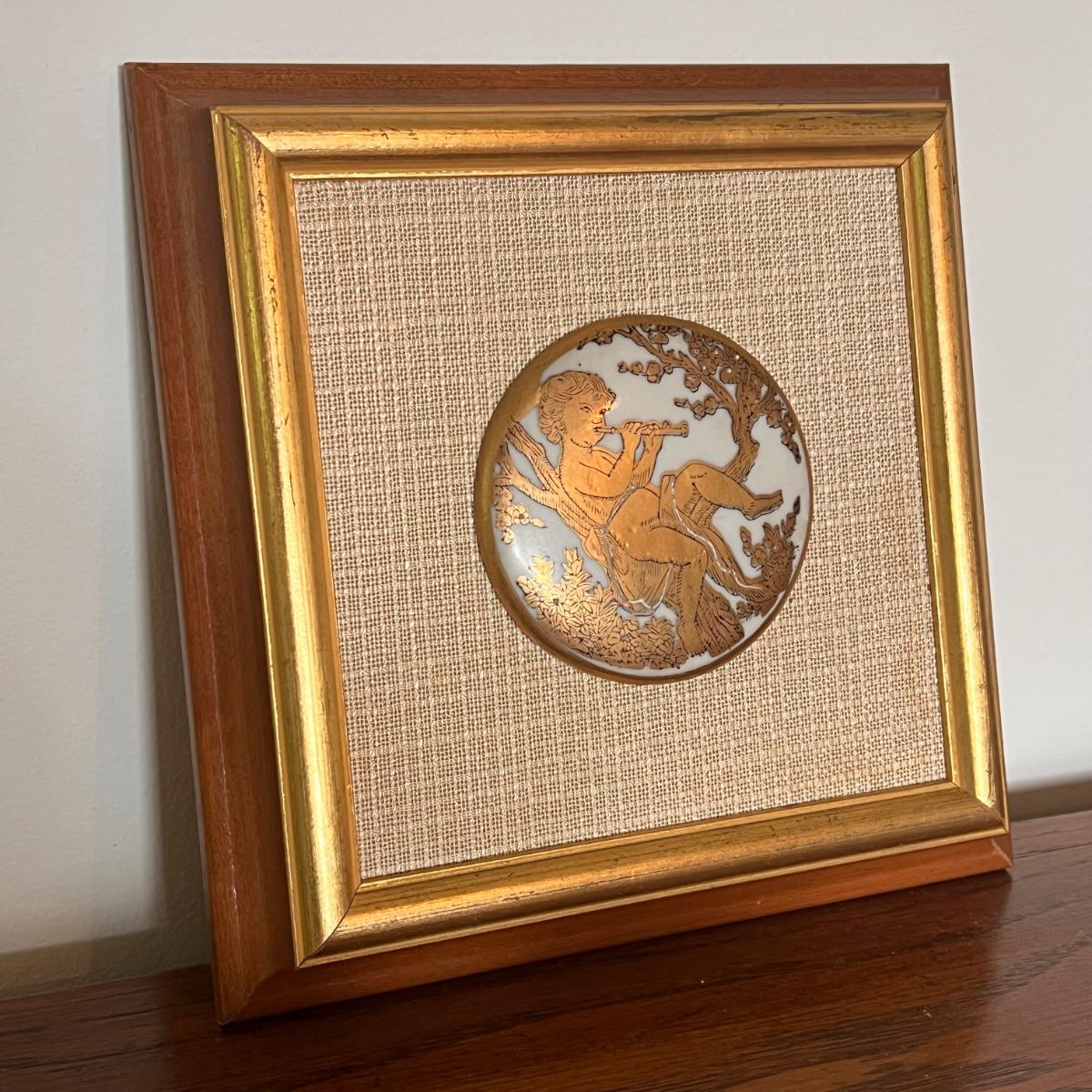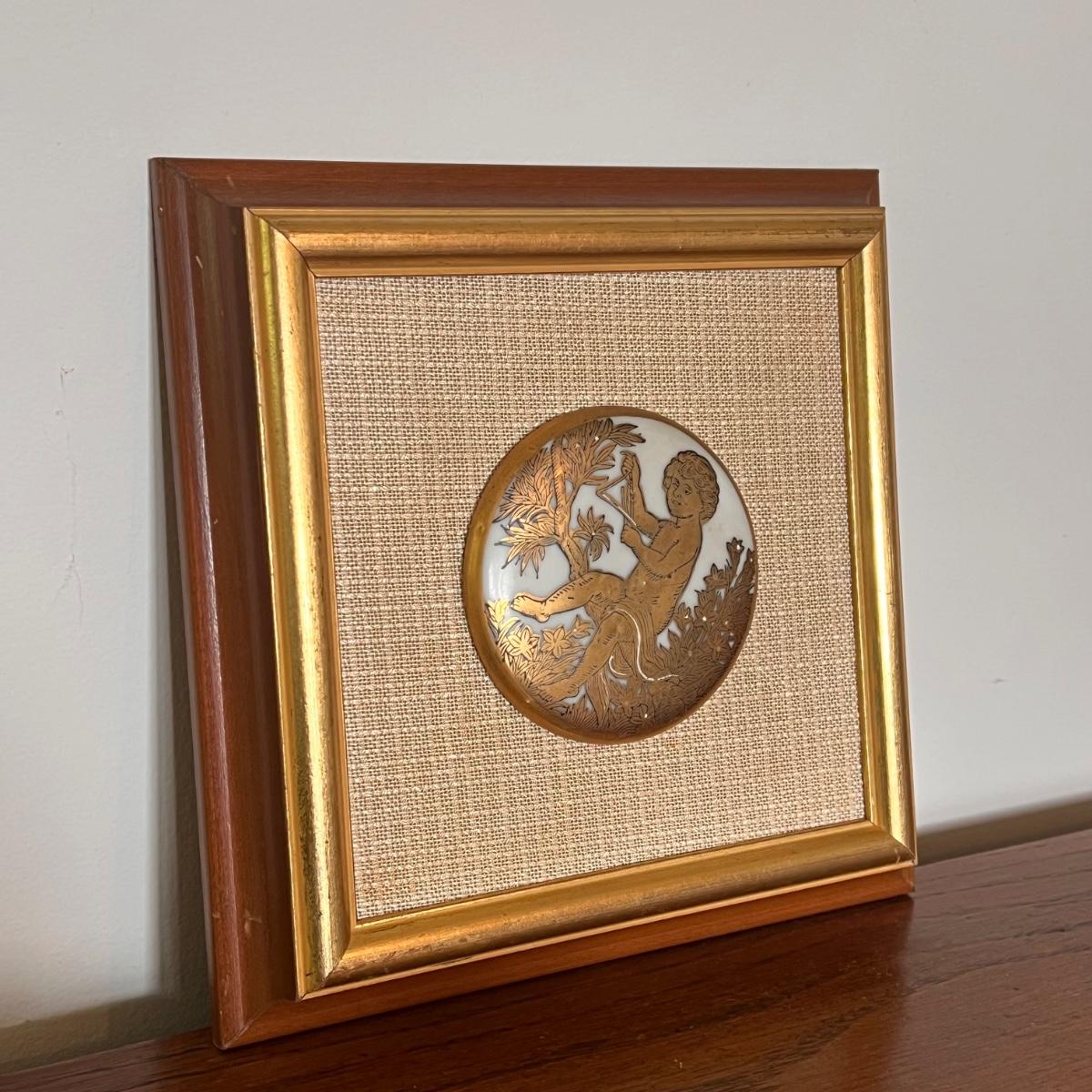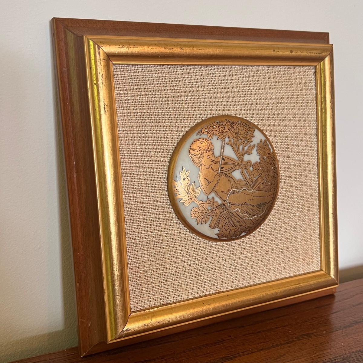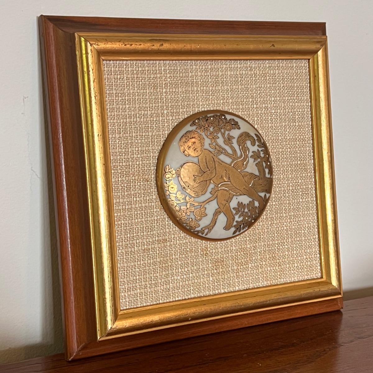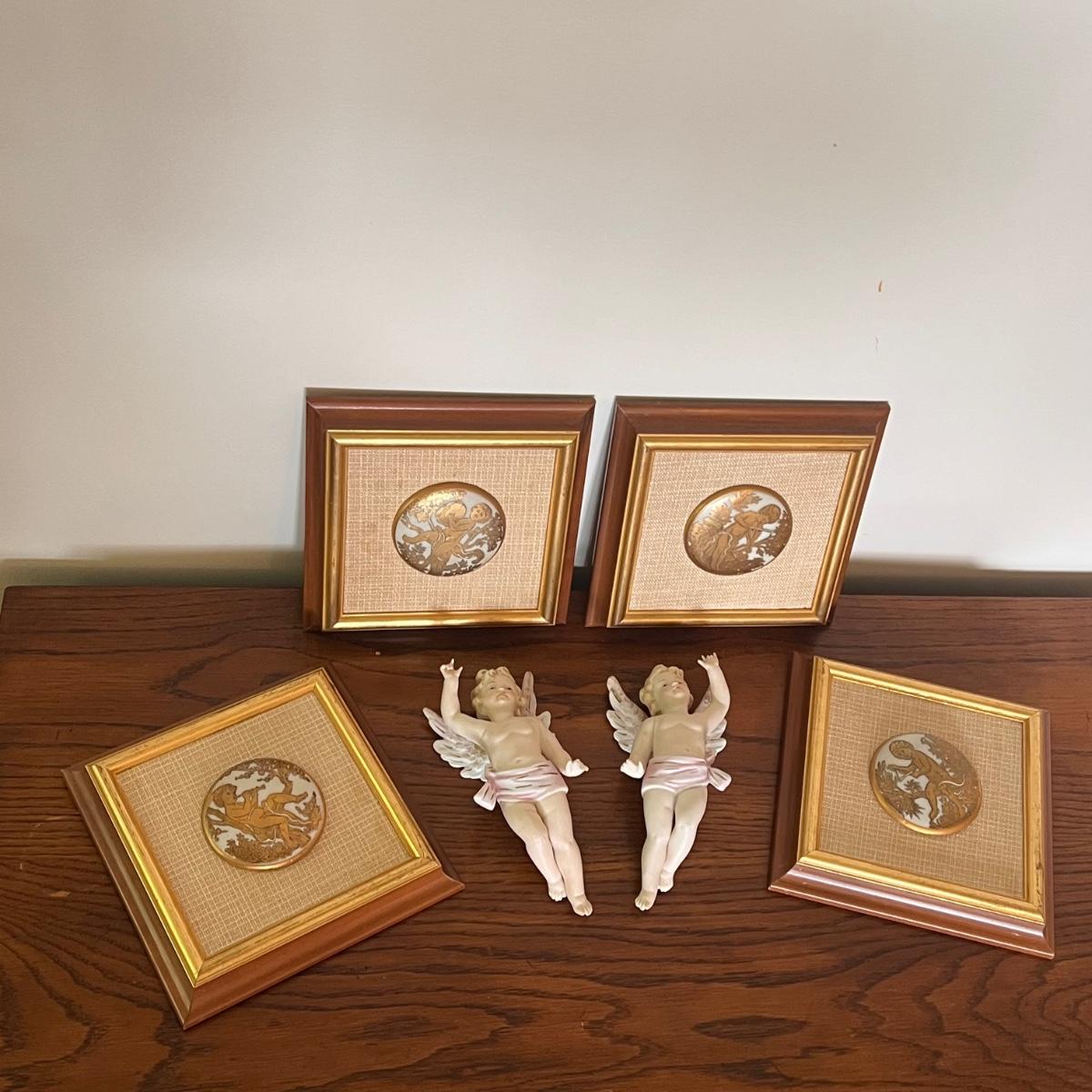 This lot includes two porcelain cherub figures and four framed porcelain cherub plates. The framed cherubs individually measure 8” x 8” x 1”H. The frames are wooden and painted gold. Shipping available.
