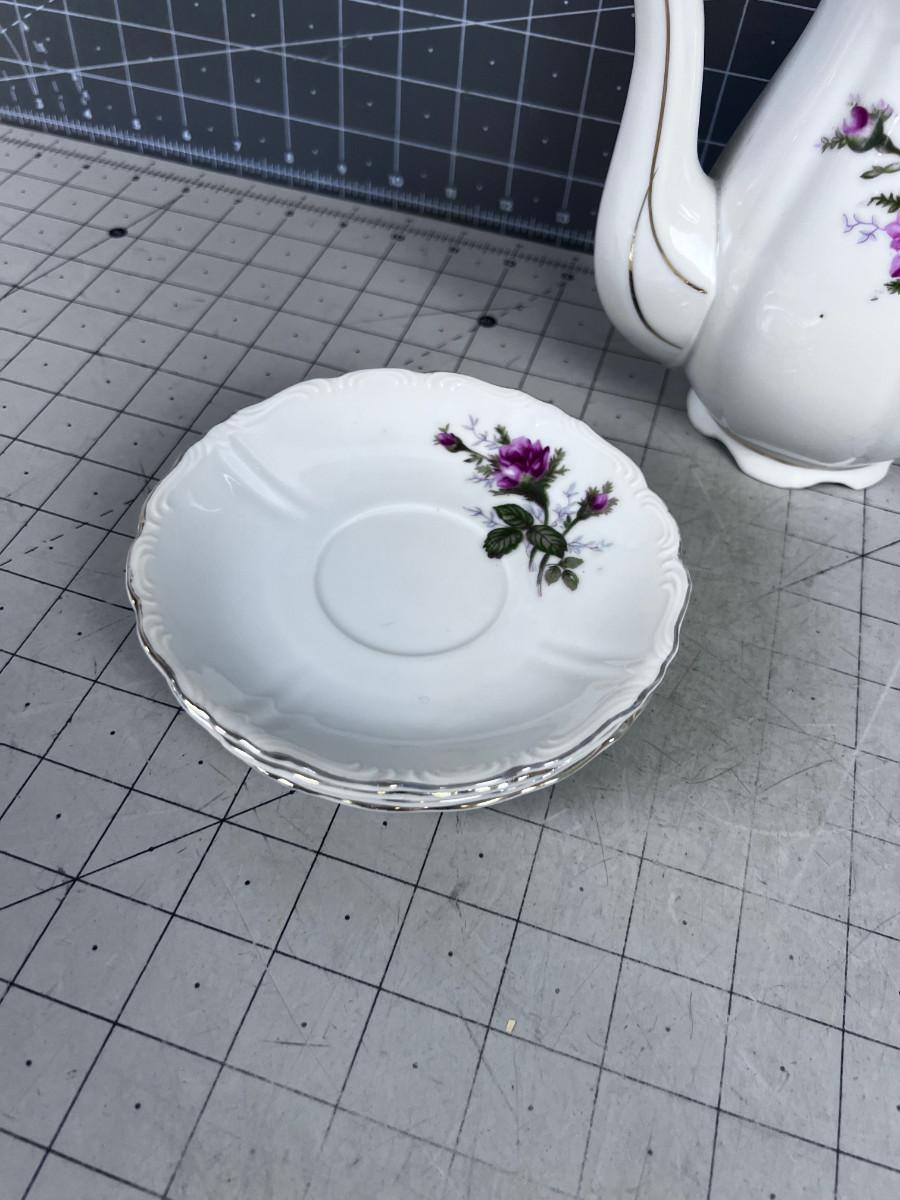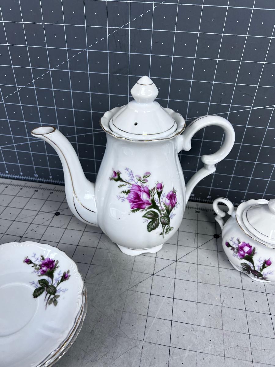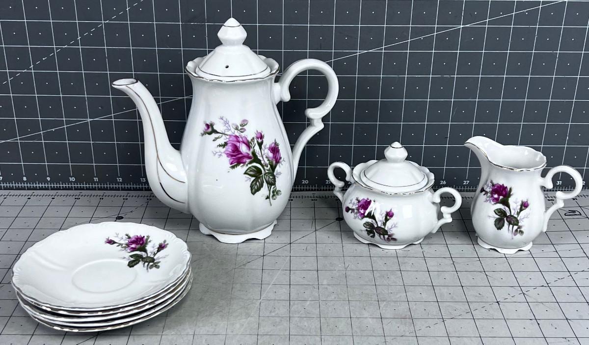 Porcelain China Coffee Pot, Saucers with Cream & Sugar