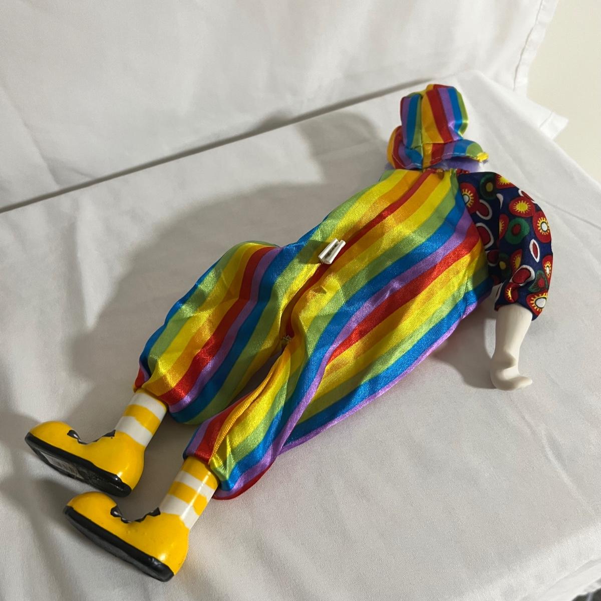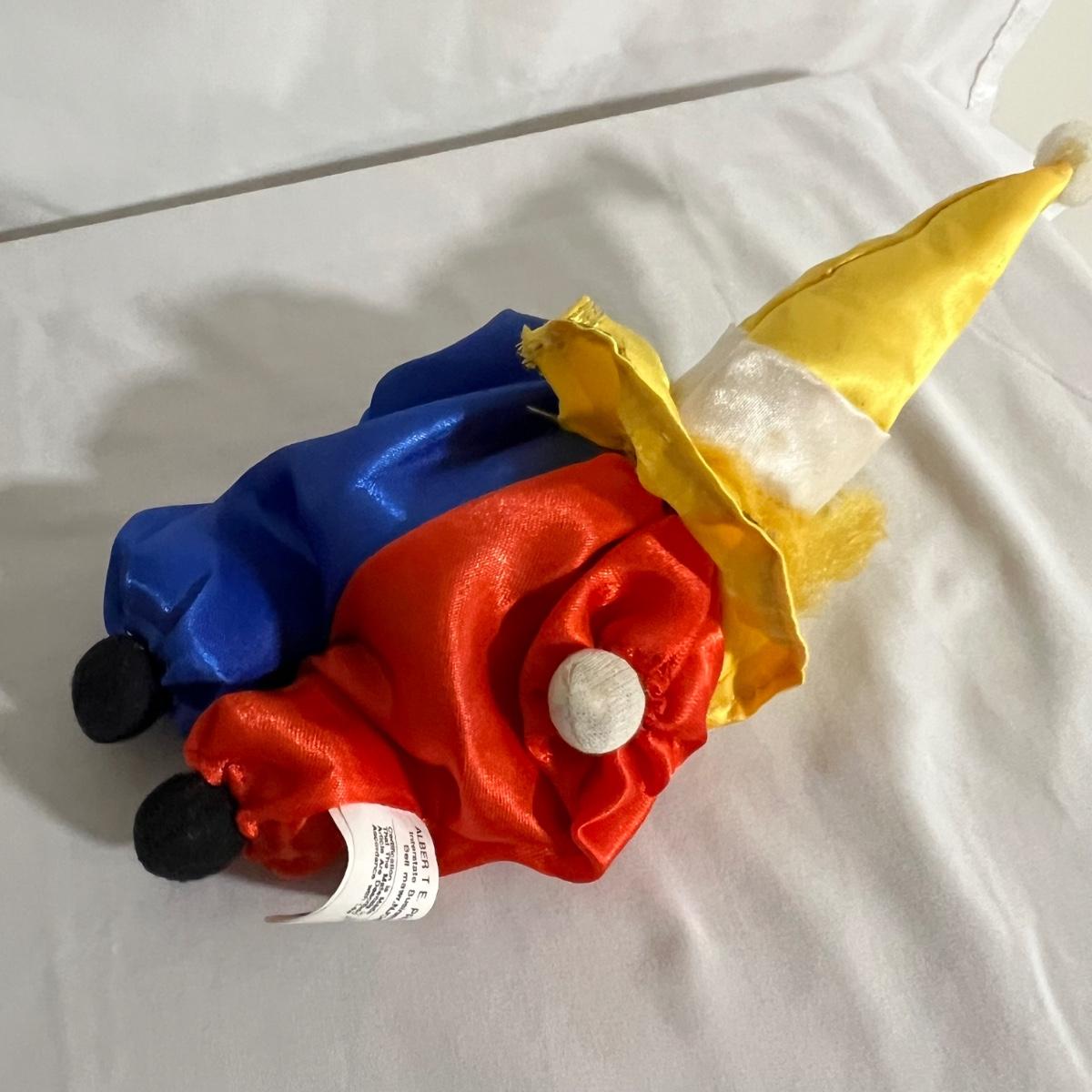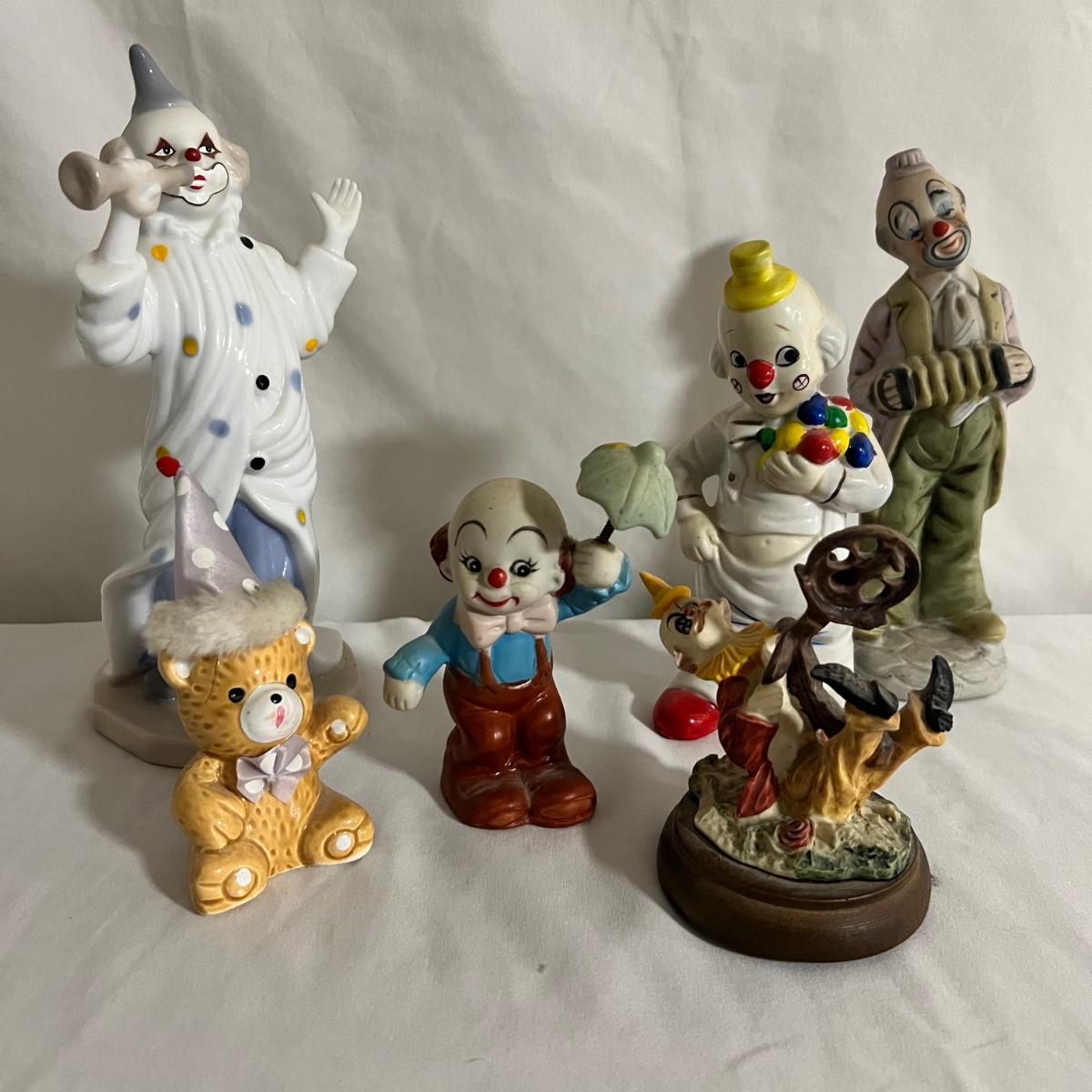 Wonderful assortment of clowns and masks. The larger of the two masks is a plastic vendetta mask designed to be worn whereas the smaller porcelain Mardi Gras mask is decorative only. One of the puppet style clowns needs his boot reattached, see pic. The white cloaked figurine clown with flute measures 3.5” x 4” x 9”H.