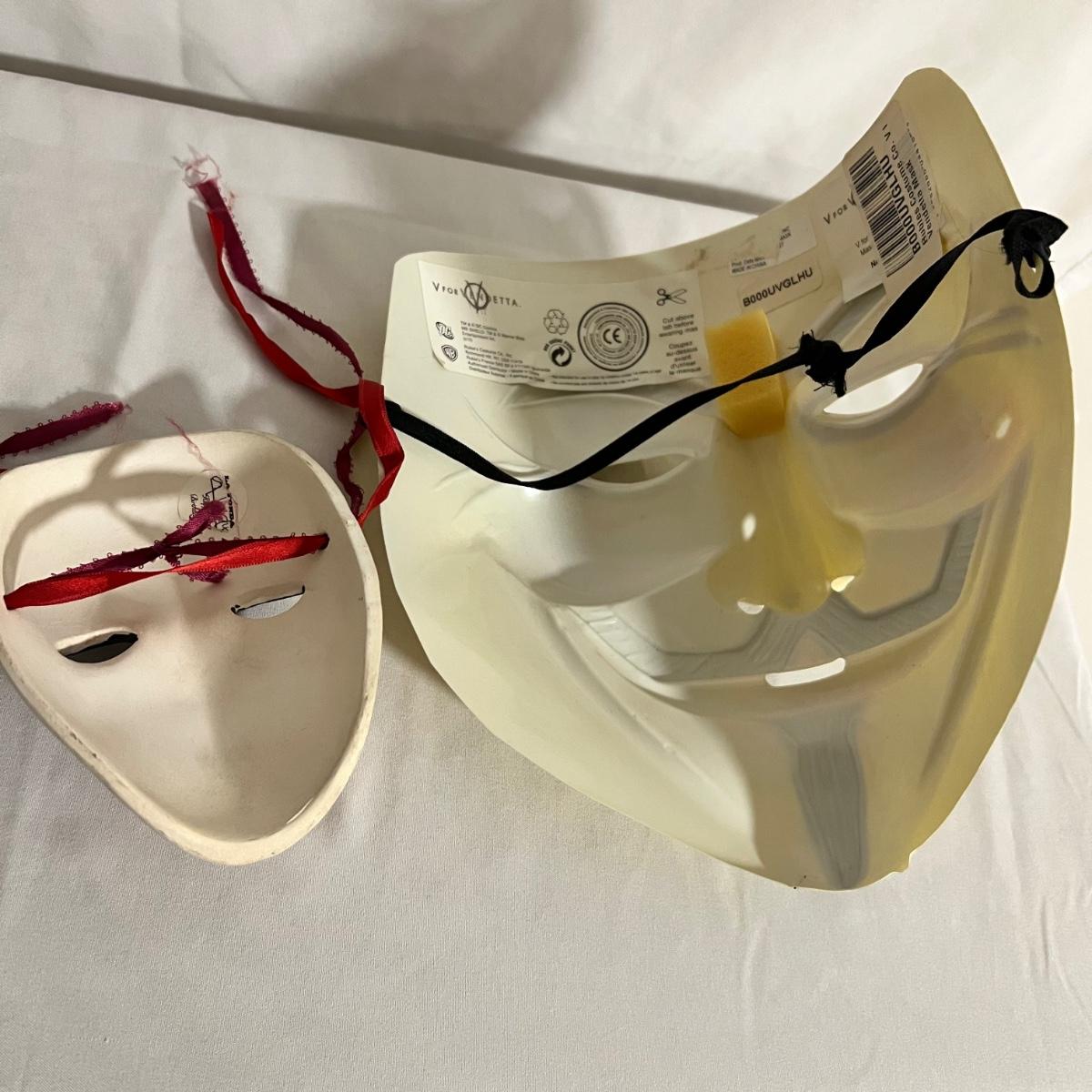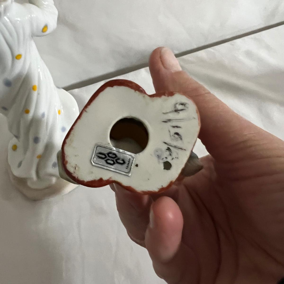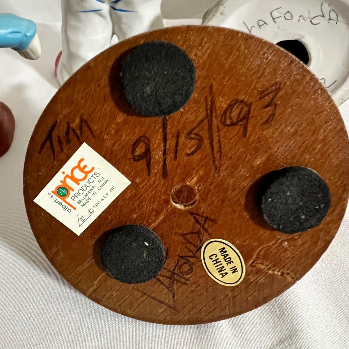 Wonderful assortment of clowns and masks. The larger of the two masks is a plastic vendetta mask designed to be worn whereas the smaller porcelain Mardi Gras mask is decorative only. One of the puppet style clowns needs his boot reattached, see pic. The white cloaked figurine clown with flute measures 3.5” x 4” x 9”H.