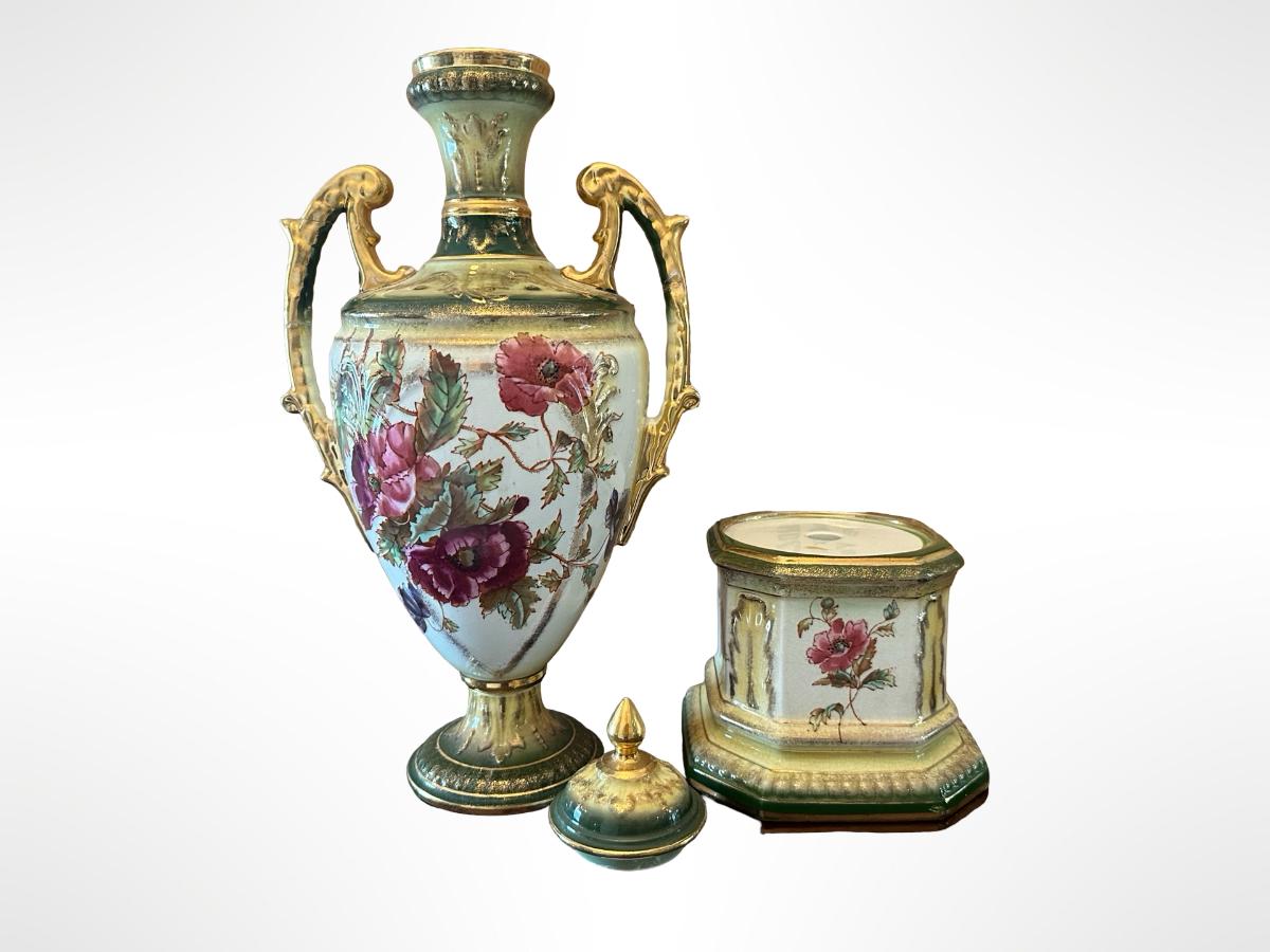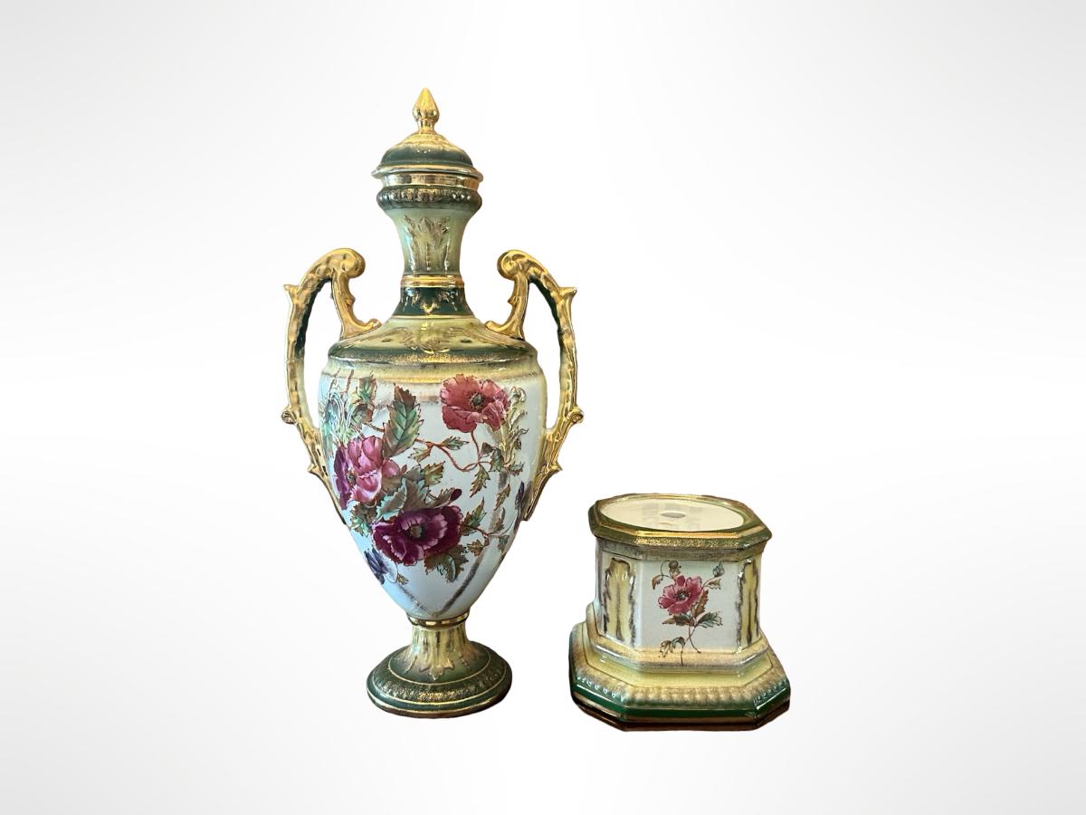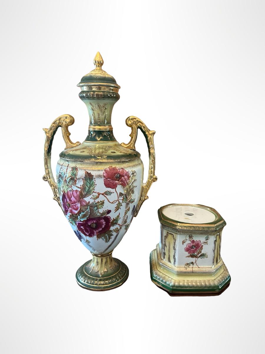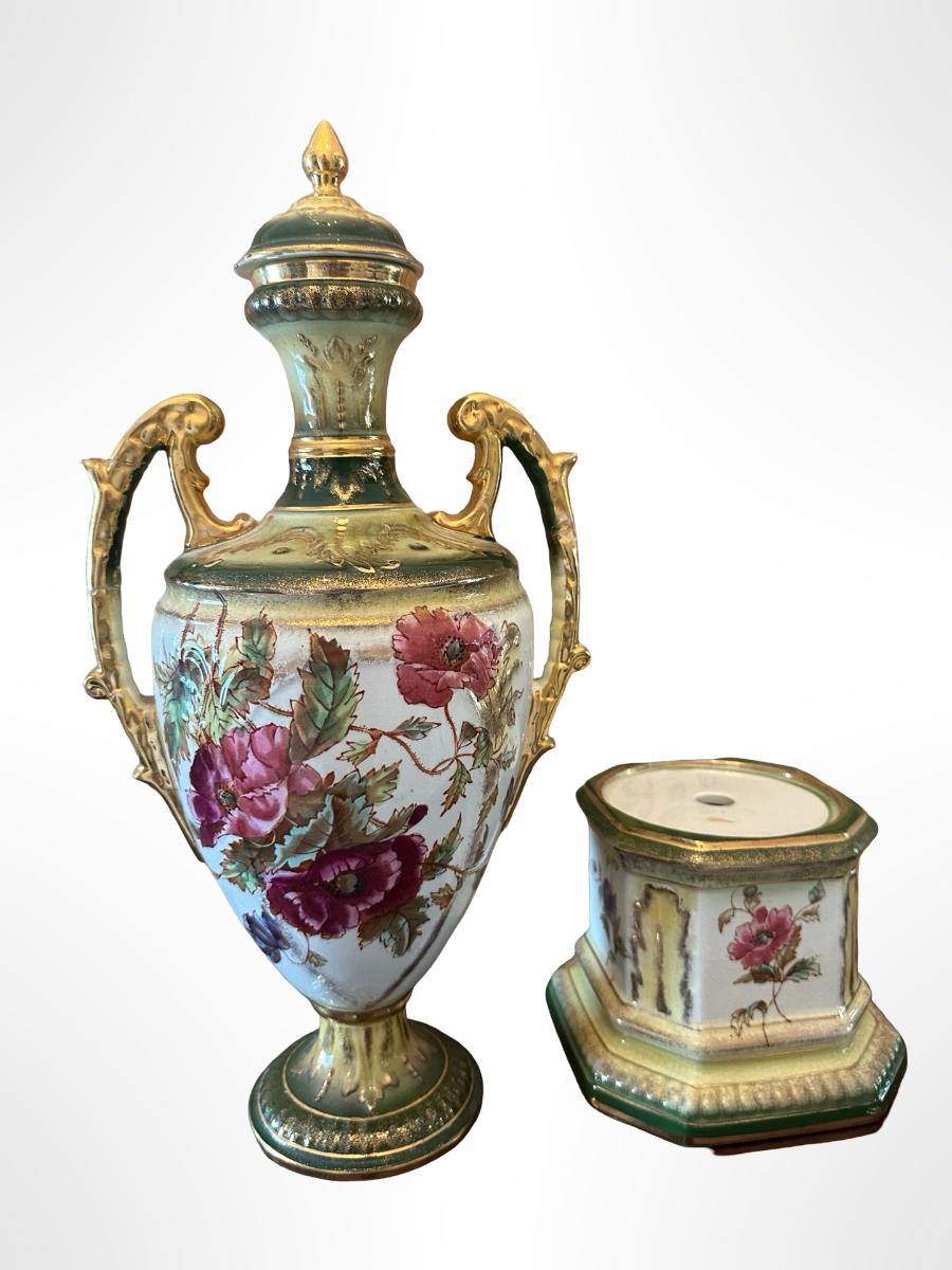 Porcelain Covered Center Urn with Hand-Painted Floral Decoration (See Description)
