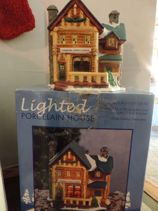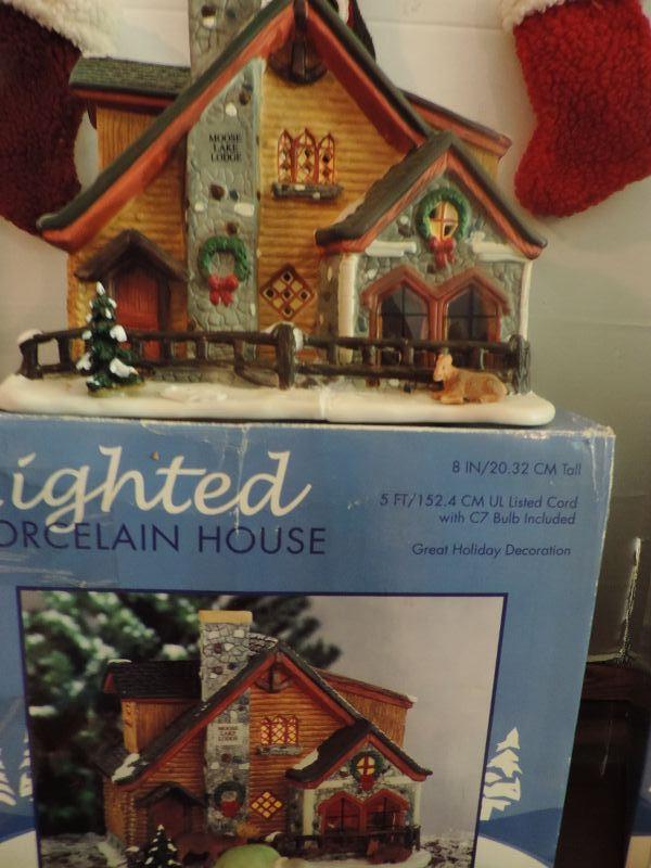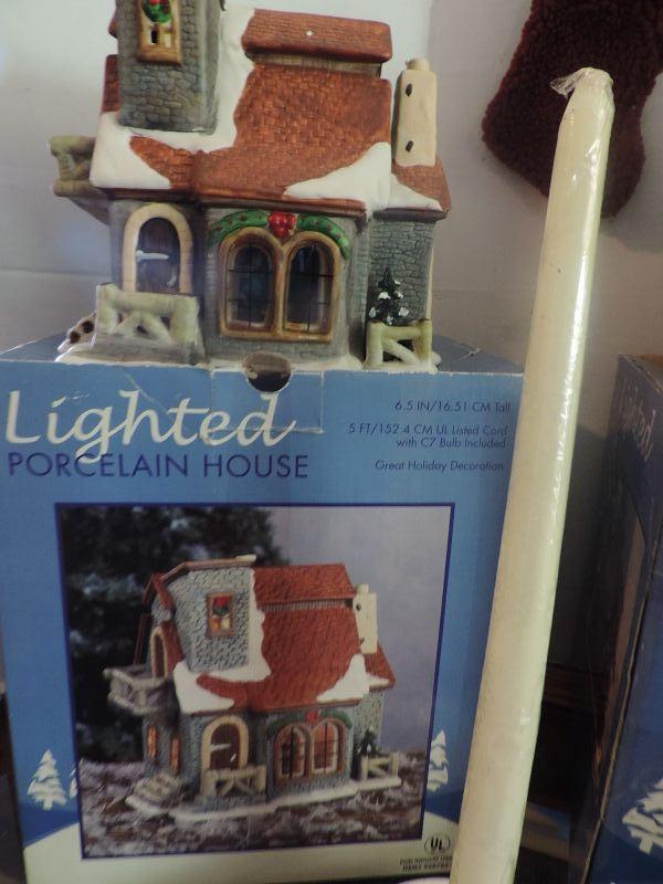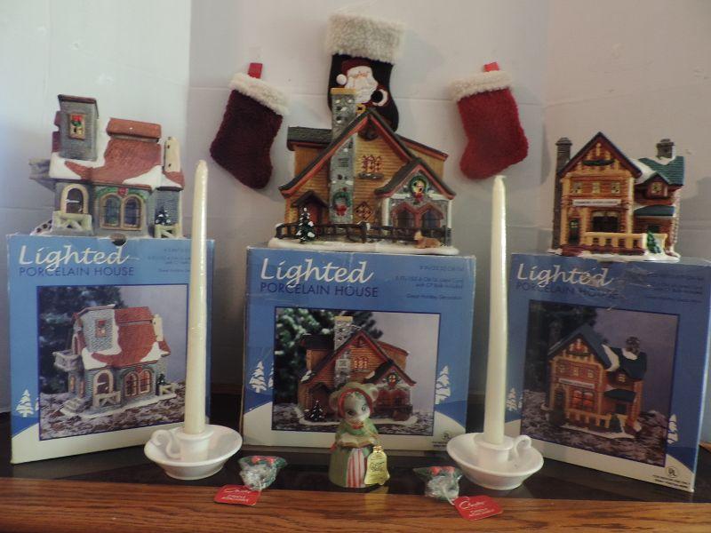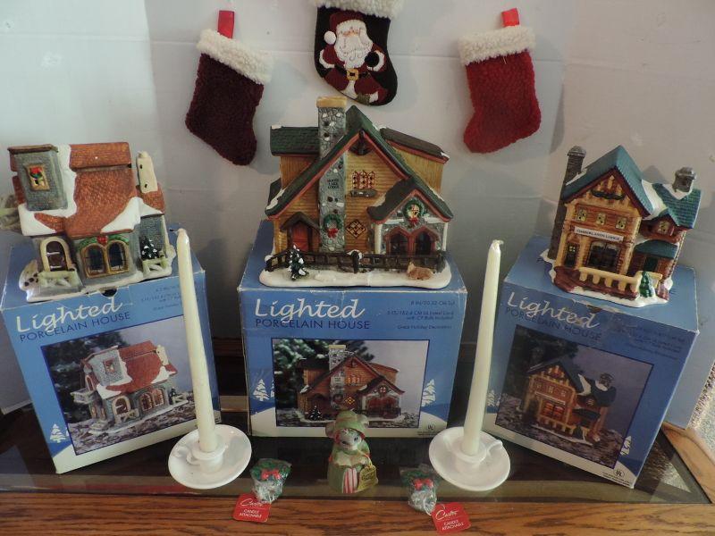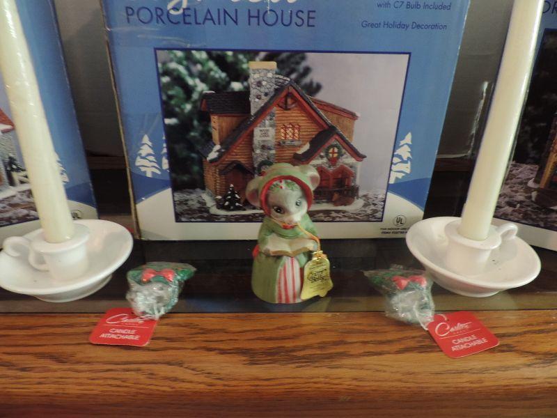 THREE HOUSES MADE OF PORCELAIN TO START OR ADD TO YOUR VILLAGE, MOUSE BELL, CANDLE HOLDERS, AND MORE