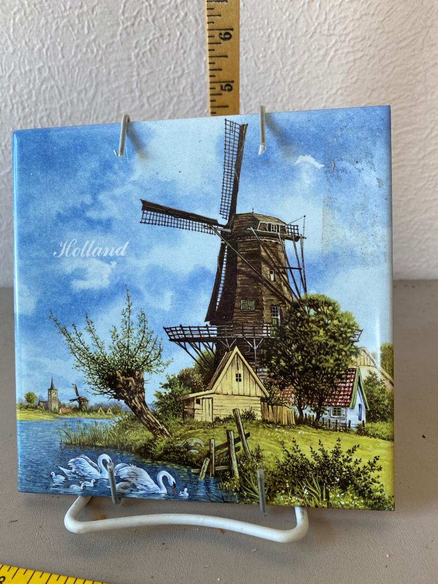Porcelain decorative tile to hang on your wall. Has a picture of a windmill from Holland.