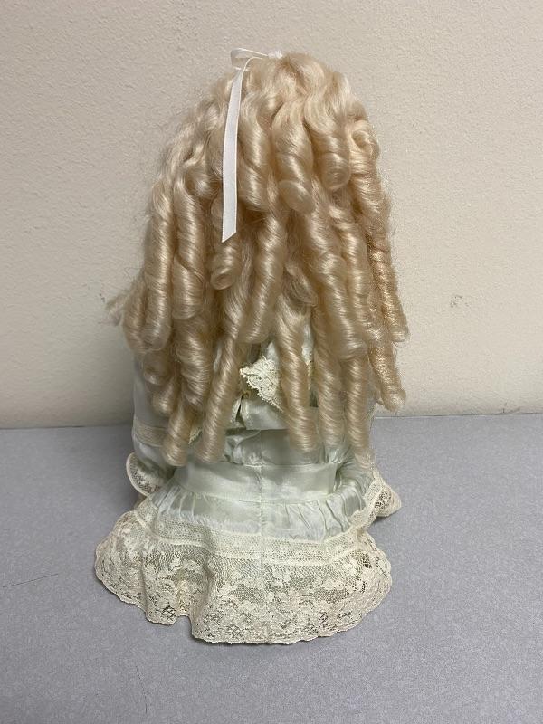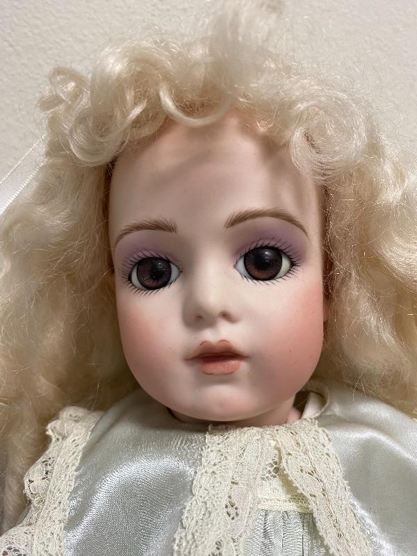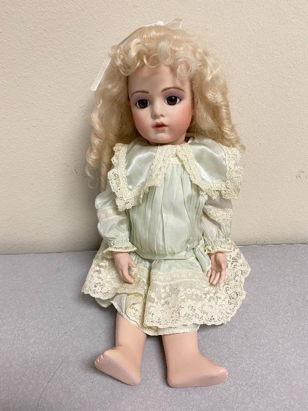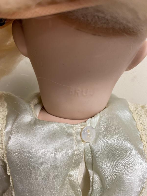 Blonde porcelain doll. Jointed body. Dark brown eyes. Stamped back of neck “Brujne”. Believe she is a reproduction. In good condition.