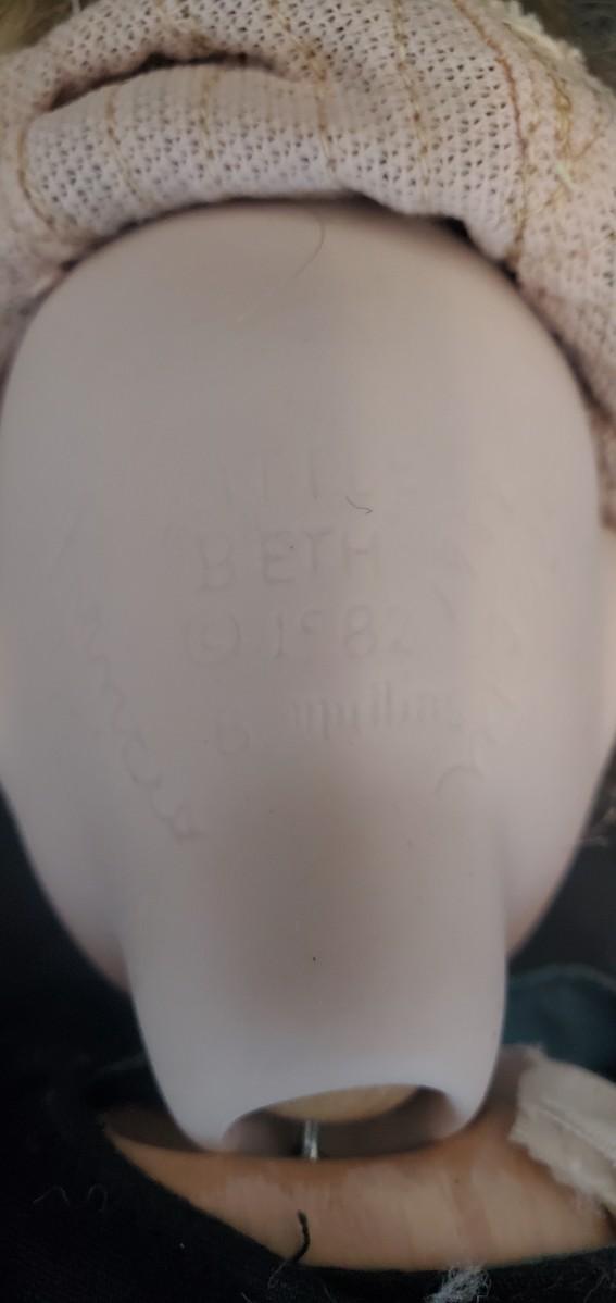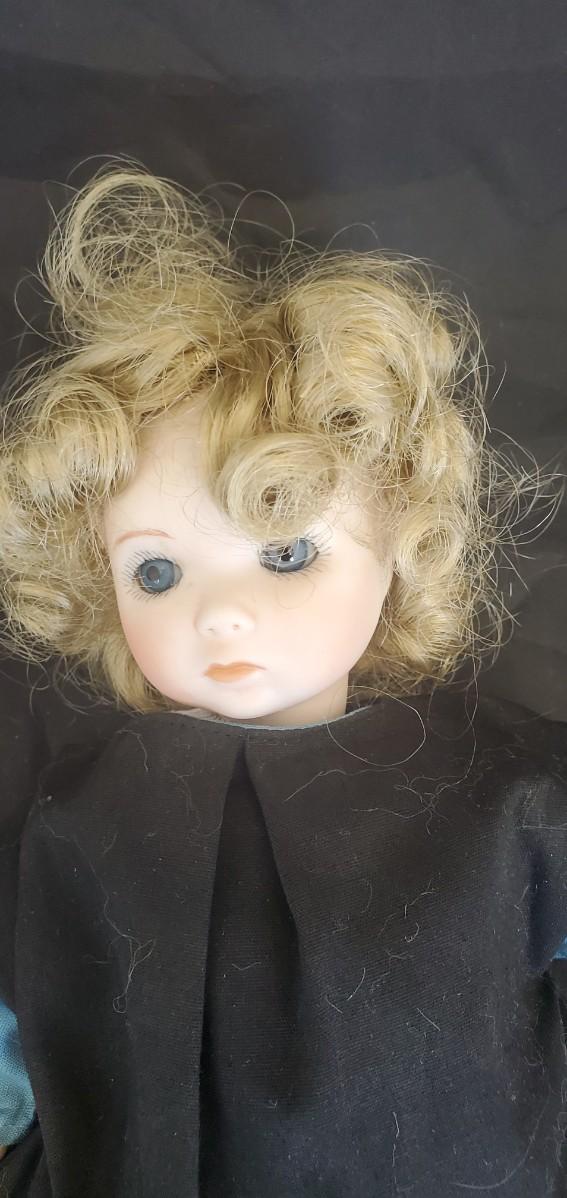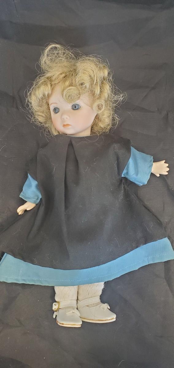 Porcelain doll in a blue and black dress. "Little Beth"