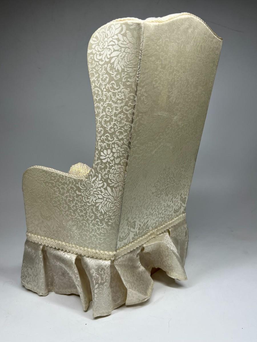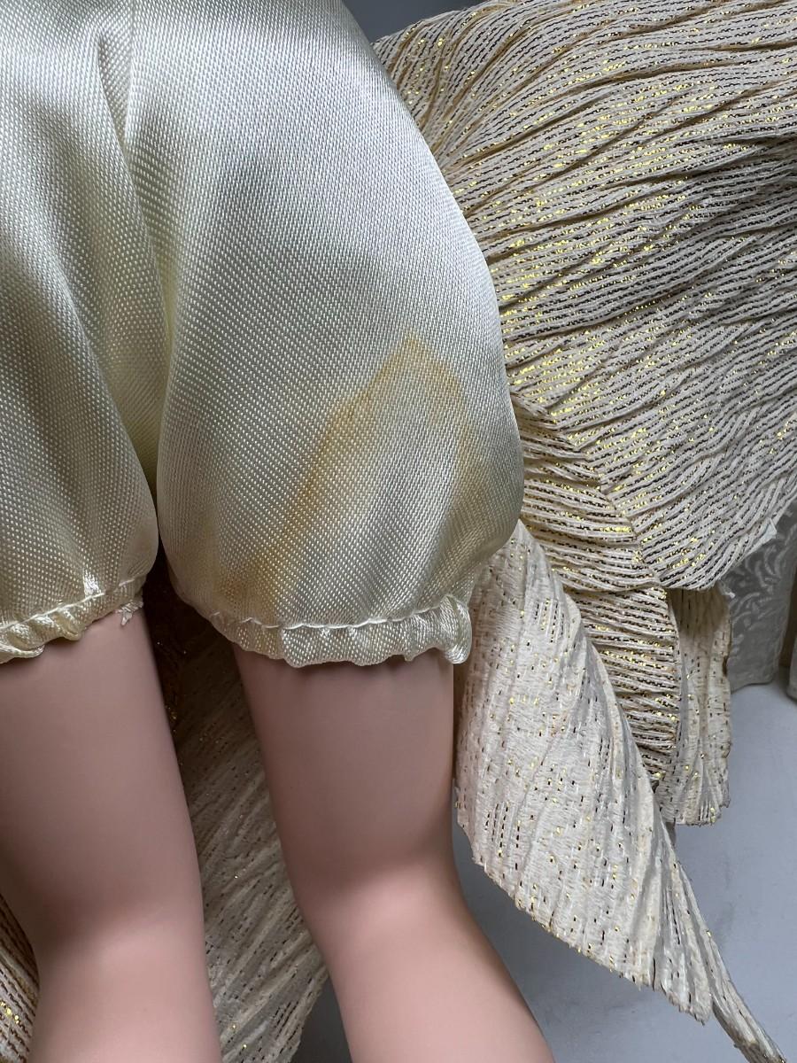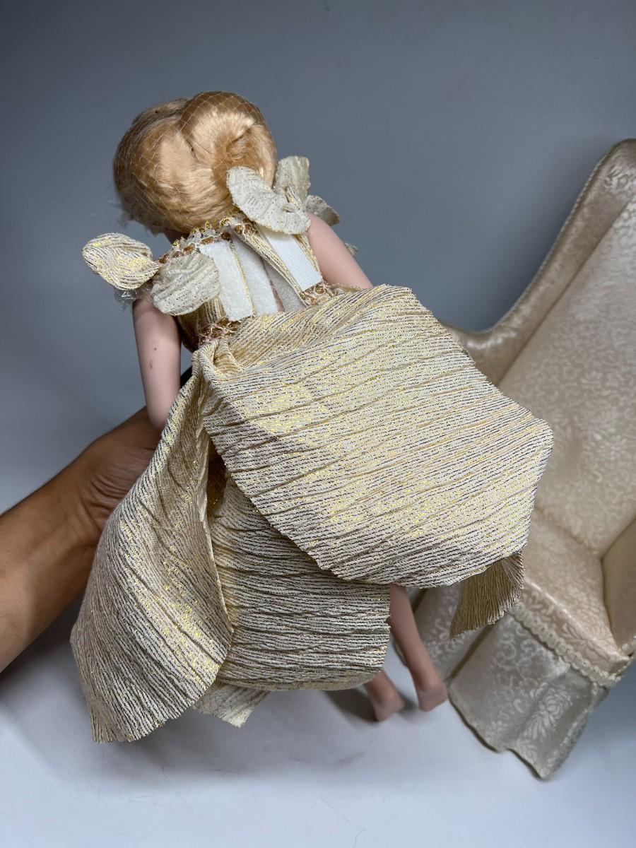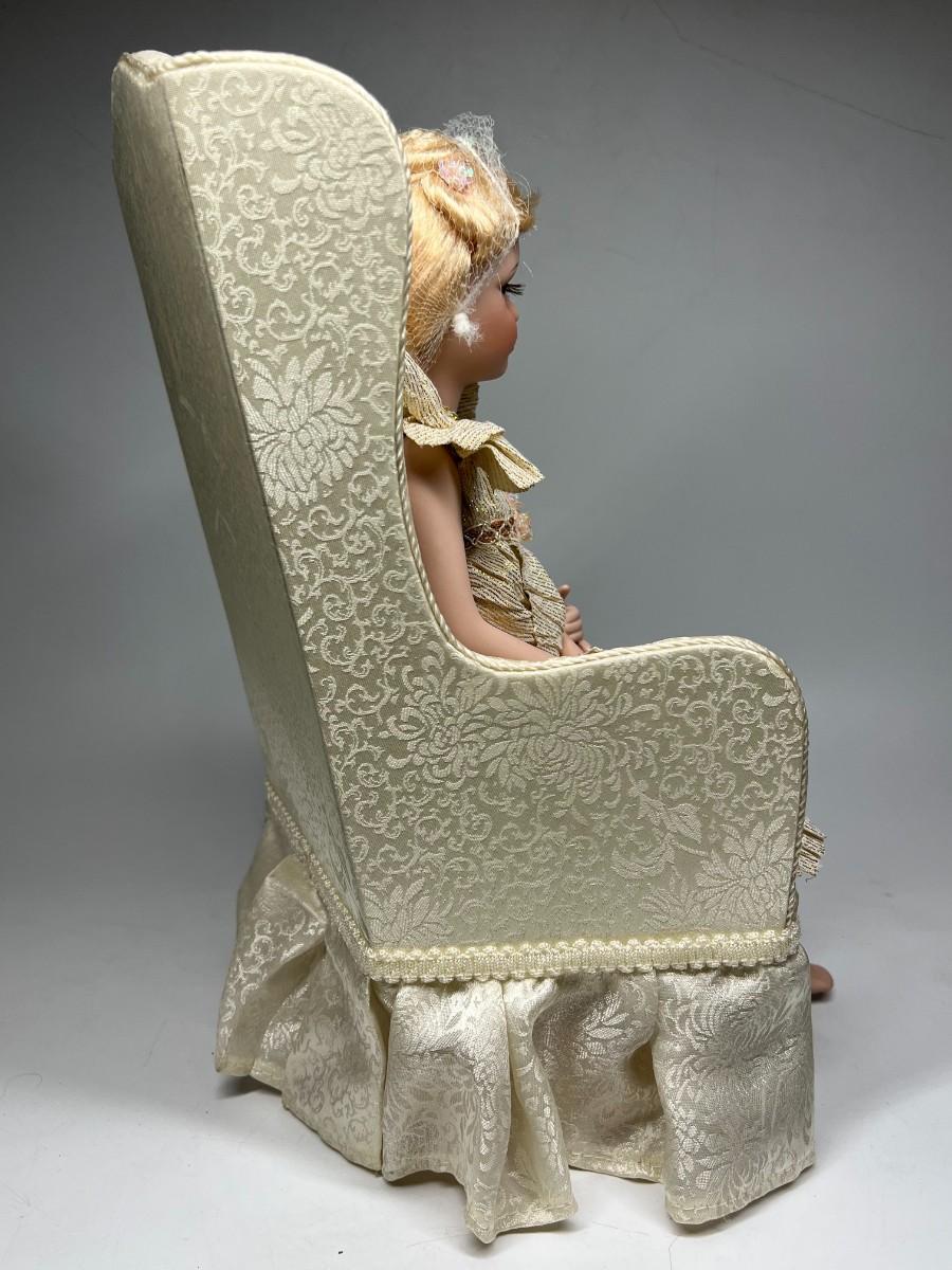 Porcelain Doll in Gold Outfit Sitting in Chair
