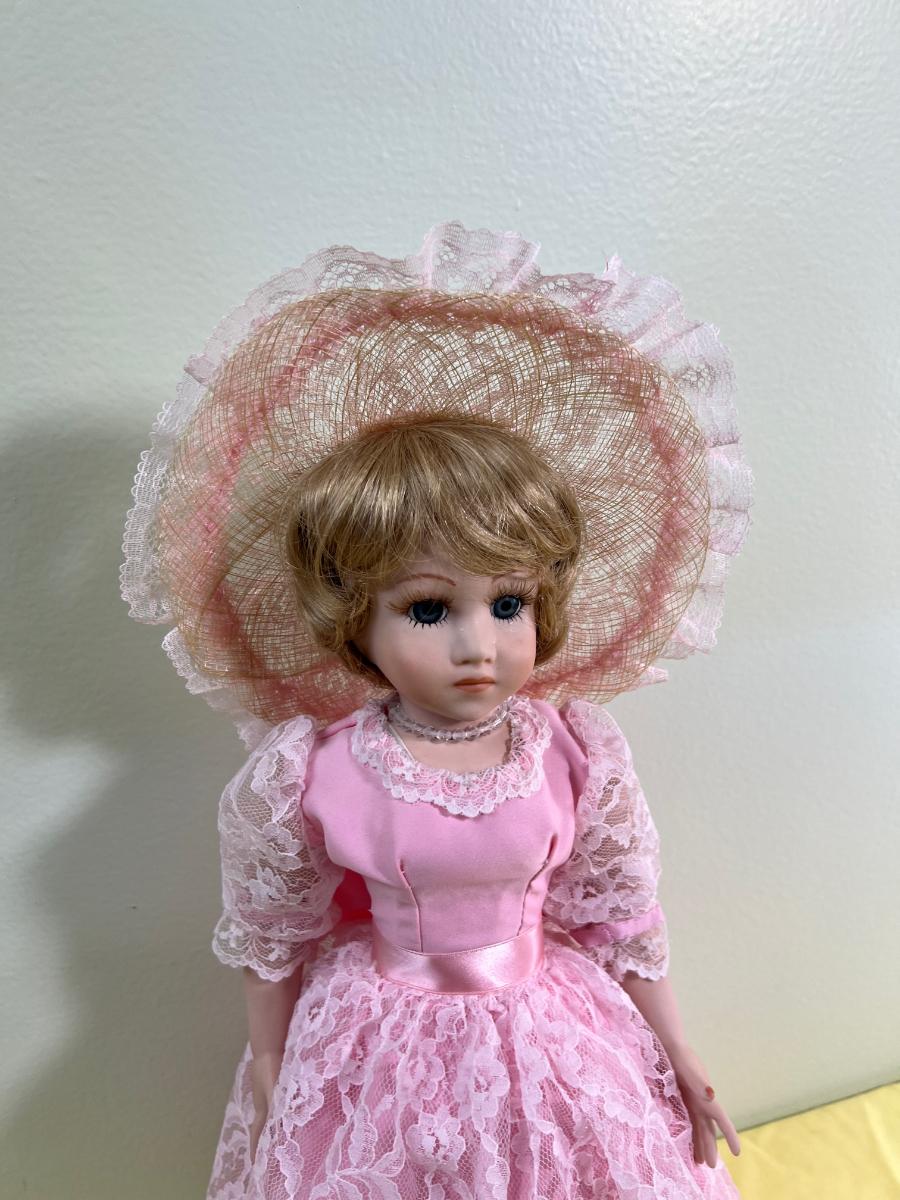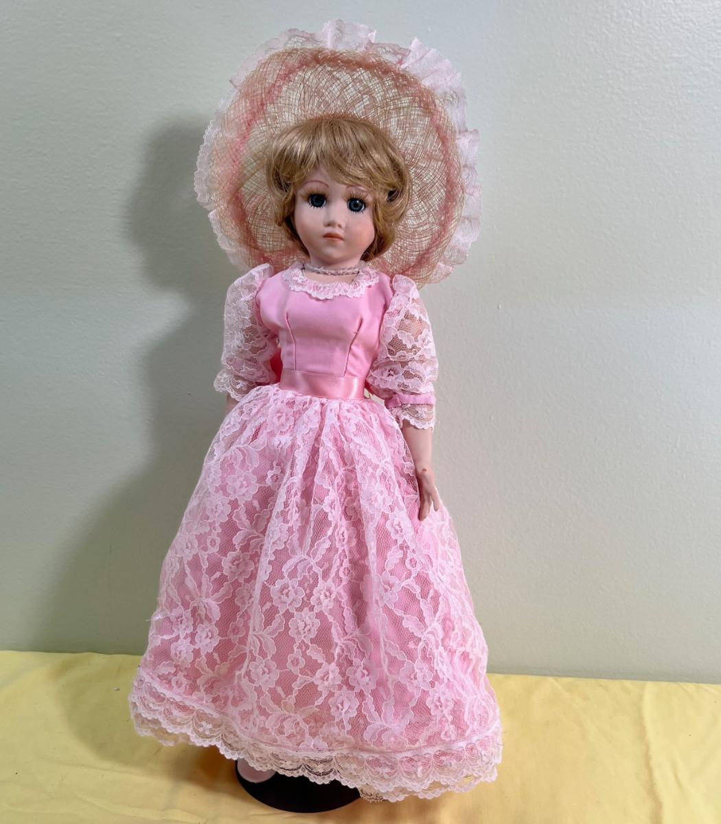 Porcelain Doll Named BEBE W/Stand  (Pink)