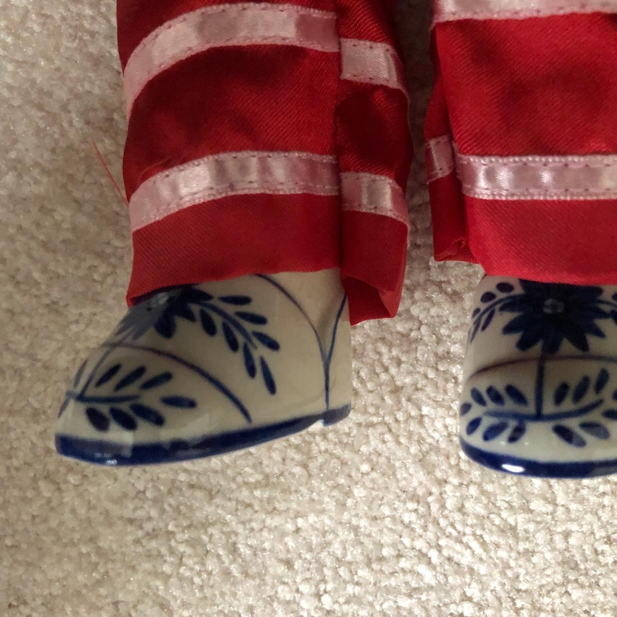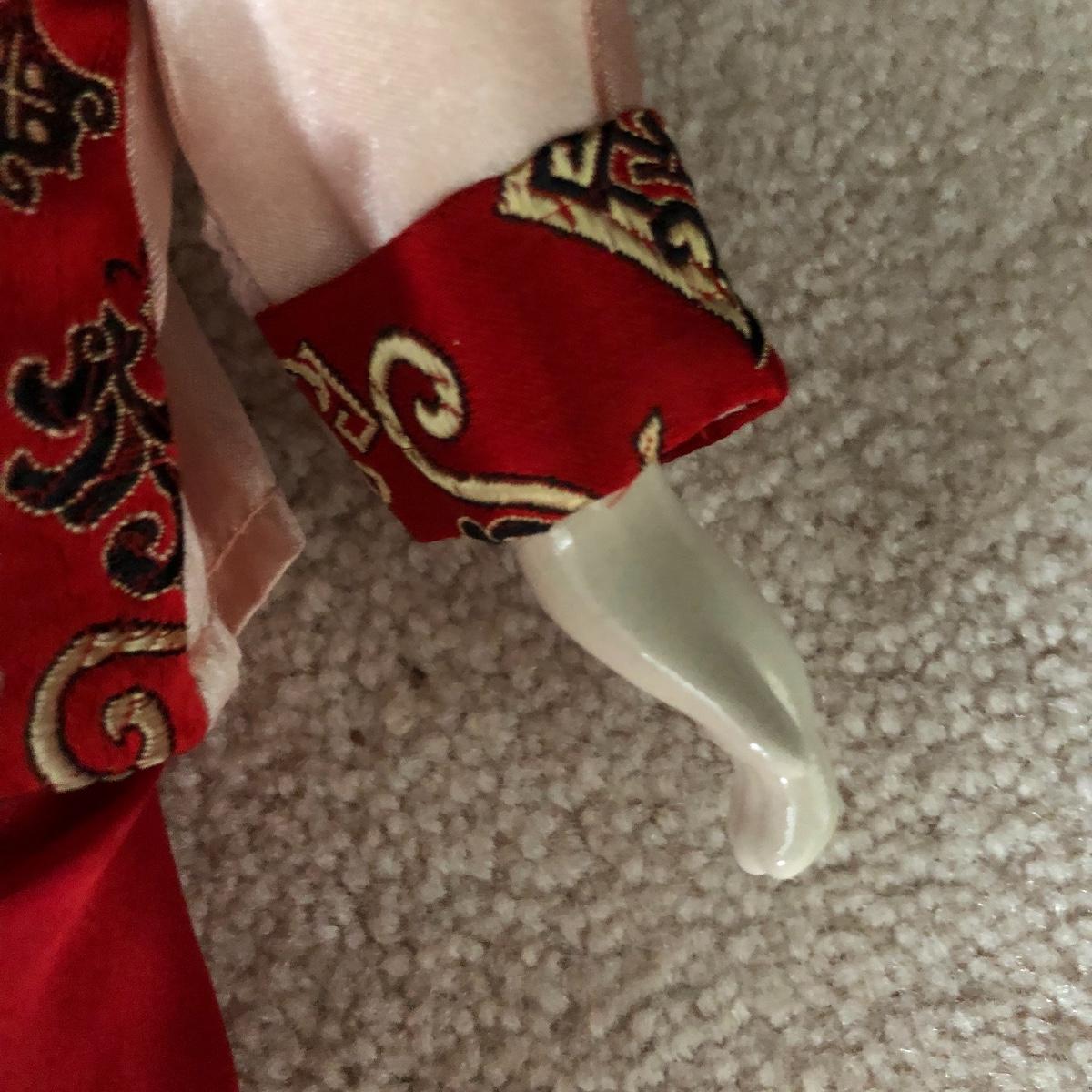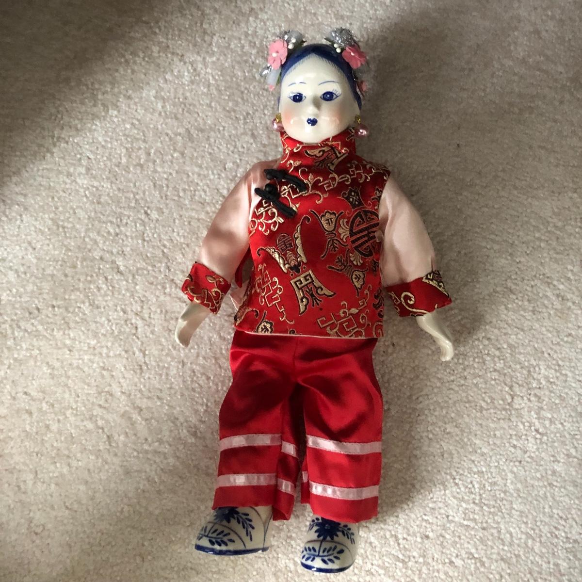 Lot includes doll with porcelain hands, feet and head. Doll measures 7” x 3” x 12.5”.