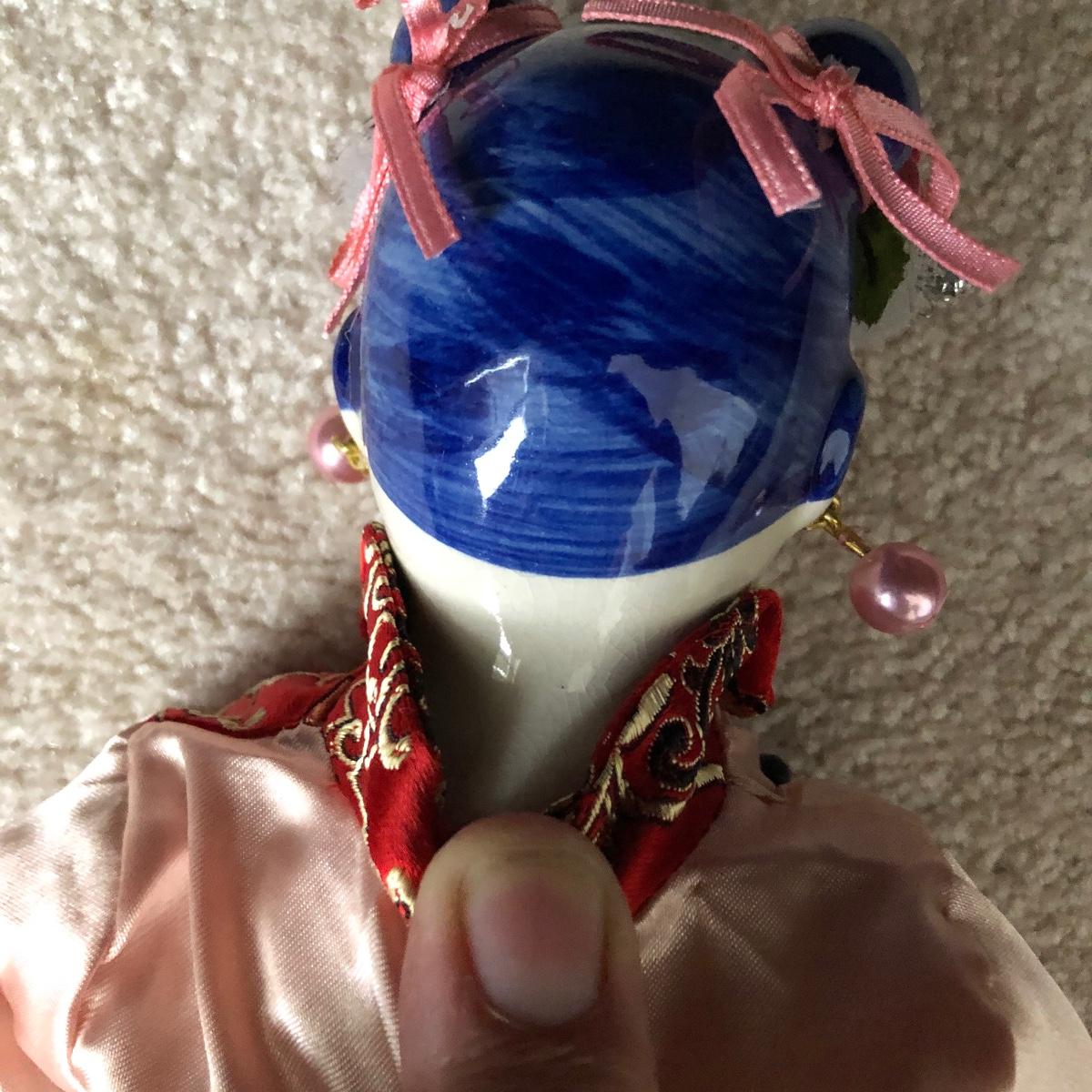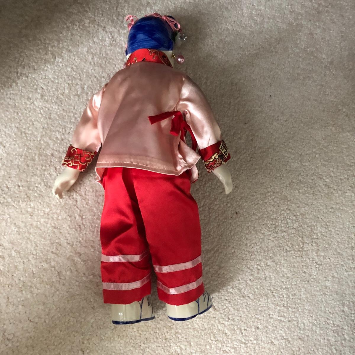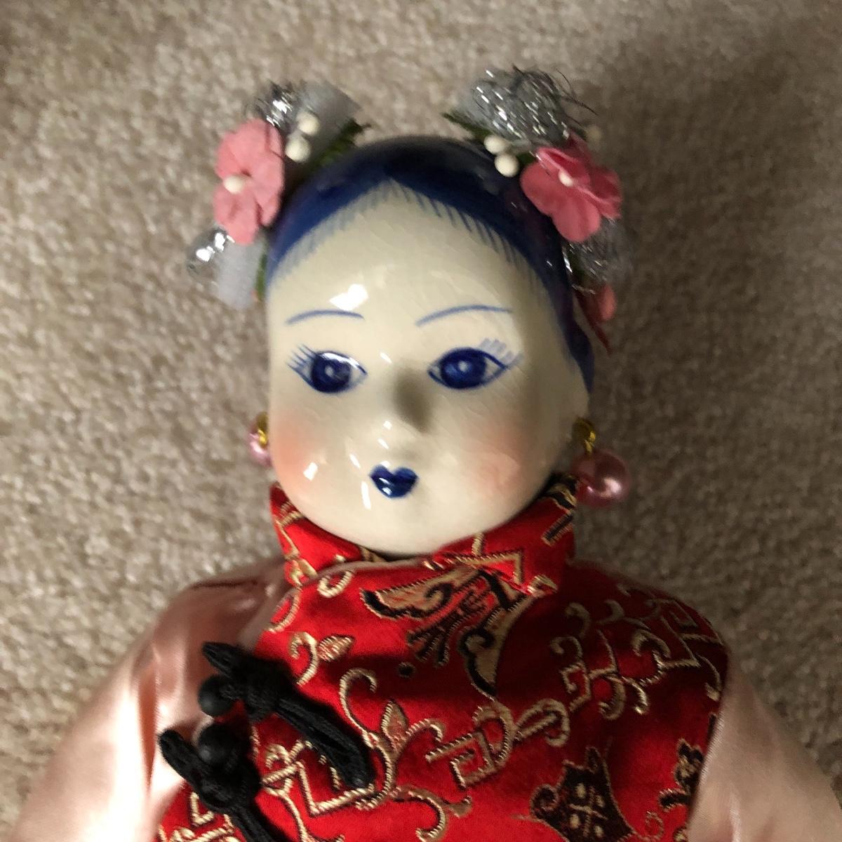 Lot includes doll with porcelain hands, feet and head. Doll measures 7” x 3” x 12.5”.