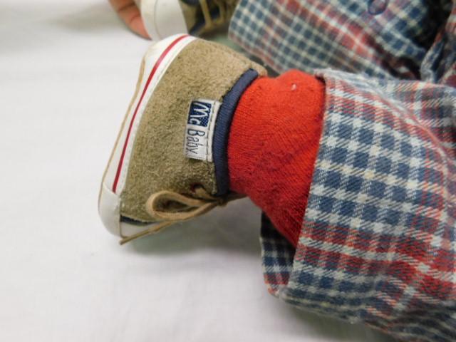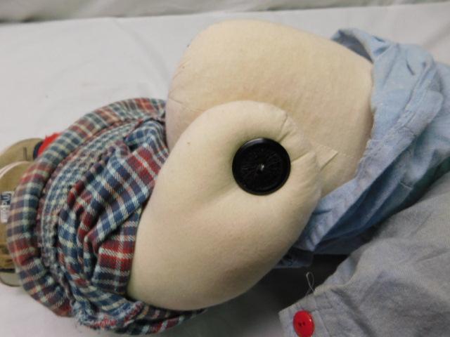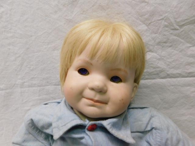 Porcelain Doll with Blue Glass Eyes and Button Hinged Limbs. this doll is extremely heavy with thick porcelain head and hands. Clothes may not be original to doll.