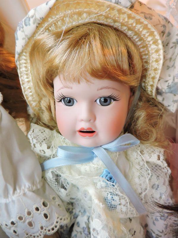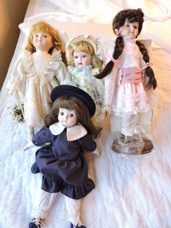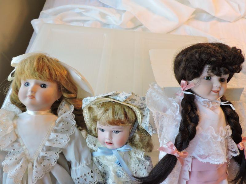 Porcelain dolls from late 1980's-early 1990's. Includes Brinn's 1989 and Camelot. 3 have stands. **Please read Terms and Conditions before placing a bid. Pick up is Sunday, September 15, 2019 from 11am to 4pm and Tuesday, September 17 from 4pm-7pm in Sicklerville. All sales are final. All sales are as is, where is. Please review all photos. Any props included in photos are not included in listing. All measurements are approximate.
