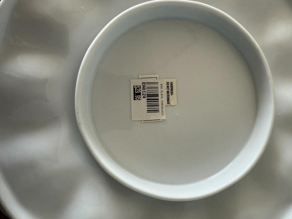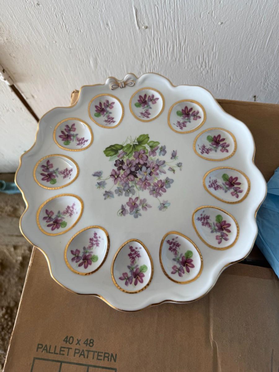 Porcelain Egg Tray: This delightful porcelain egg tray holds 12 halves and features beautiful purple and lavender posies with elegant gold trim. Perfect for Easter or as a charming decorative piece!