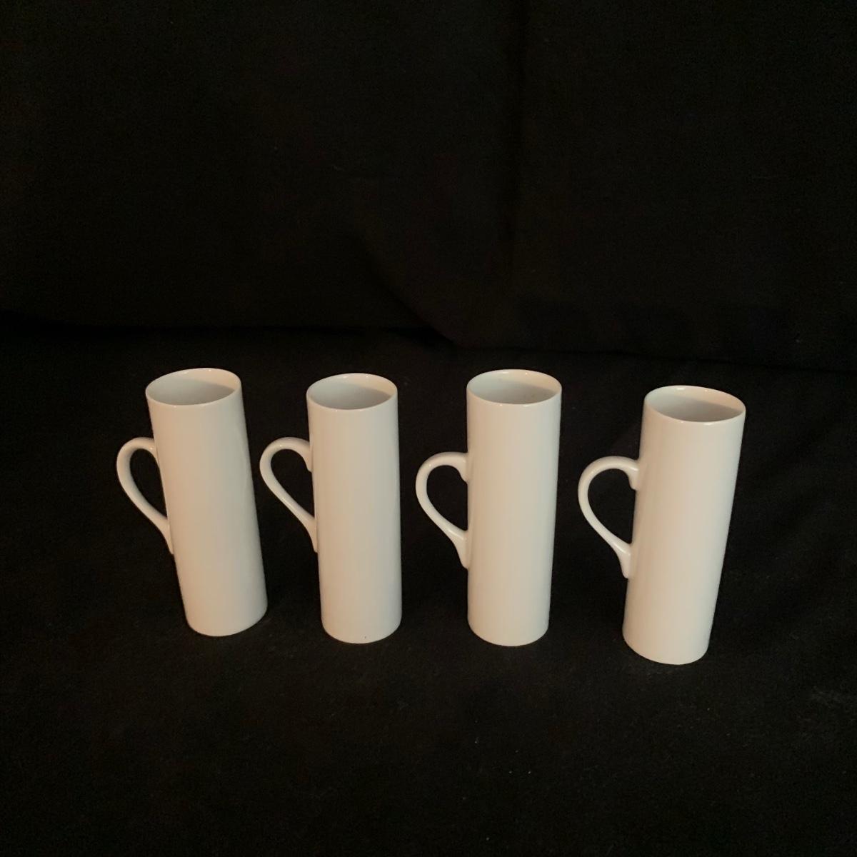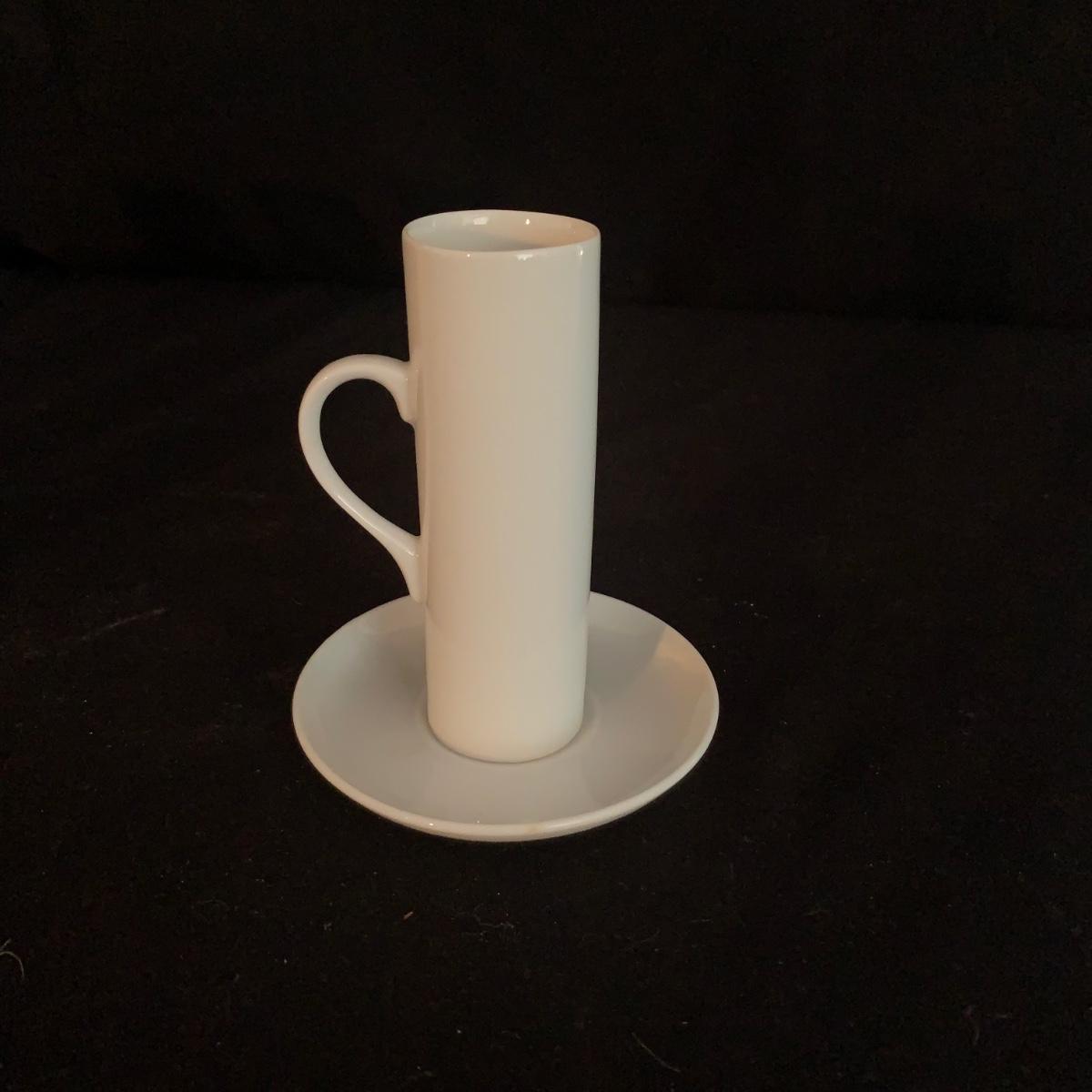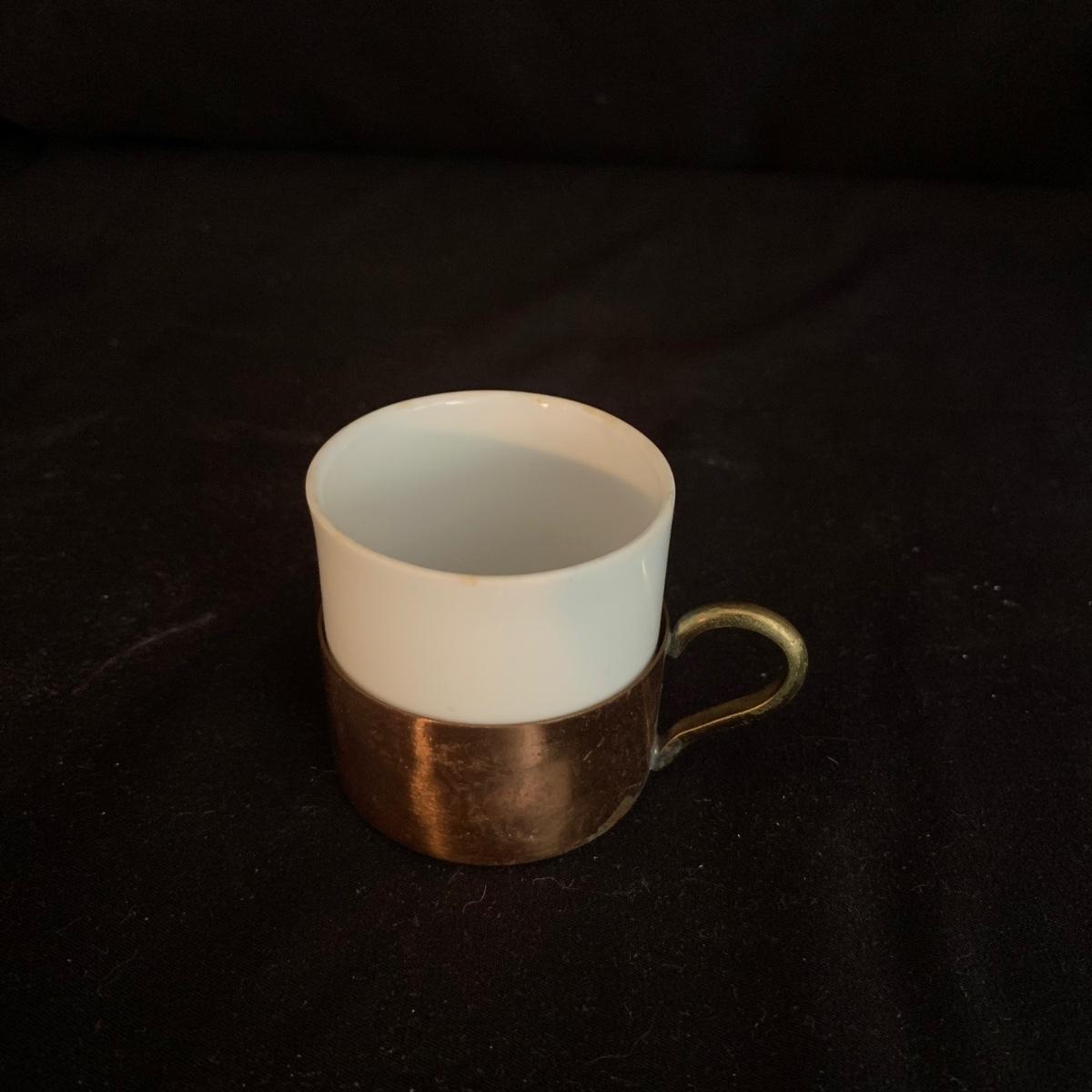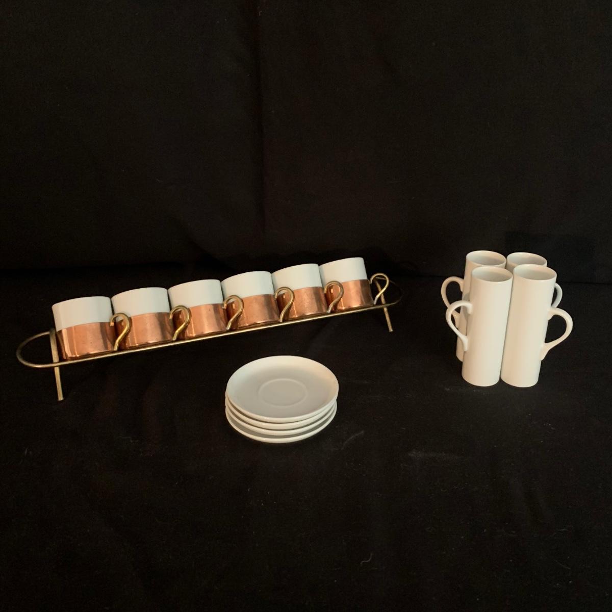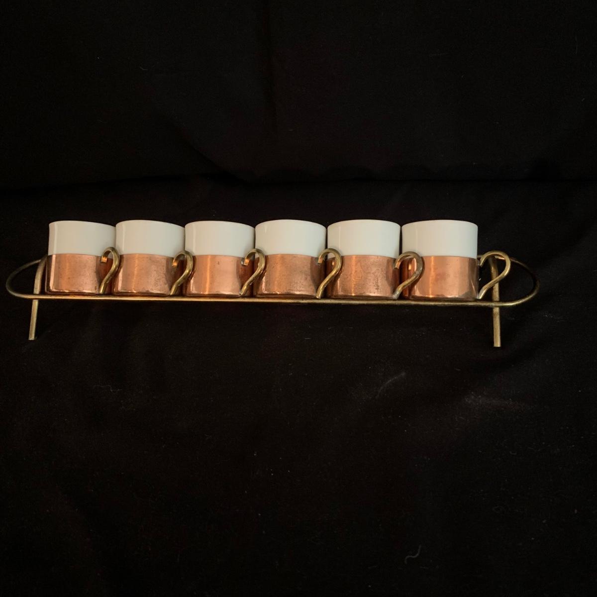 This lot includes one set of six espresso cups with a matching holding rack. Included also is a set of four tall porcelain espresso cups with matching plates. The espresso cups can separate from their copper holders (see photos). The set of six espresso cups measure about 2in x 2in (per cup). The tall porcelain espresso cups measure about 4in x 1.5in. Shipping available.
