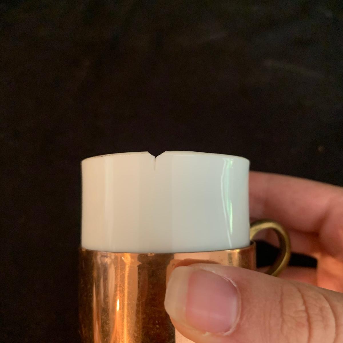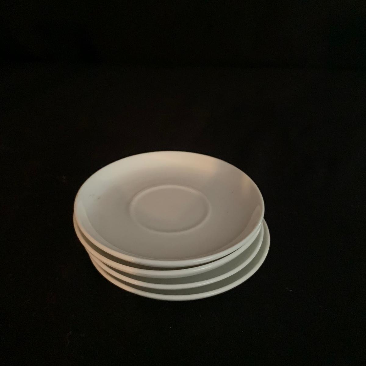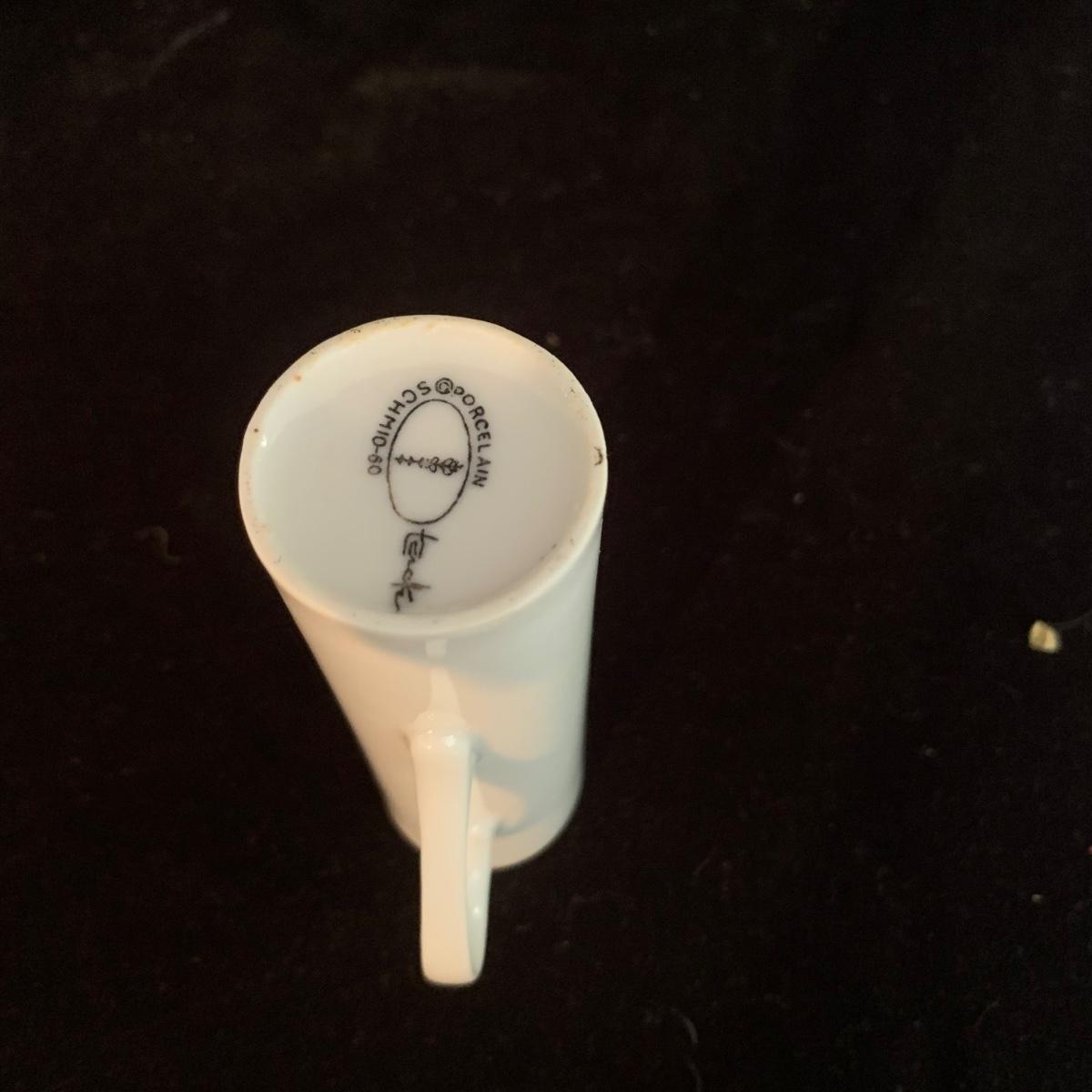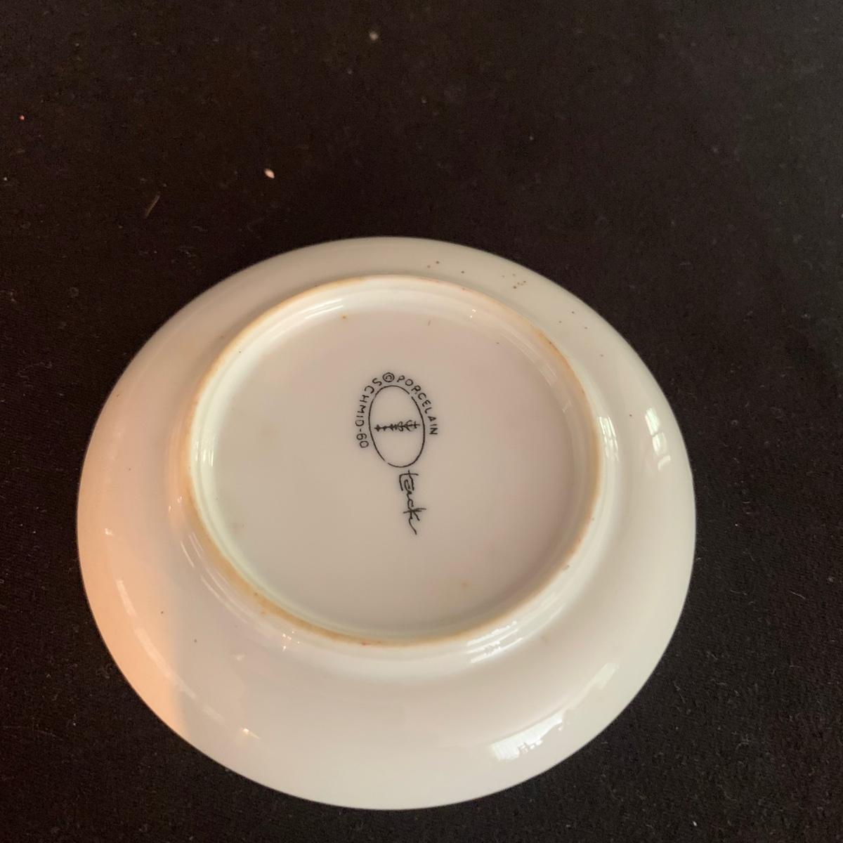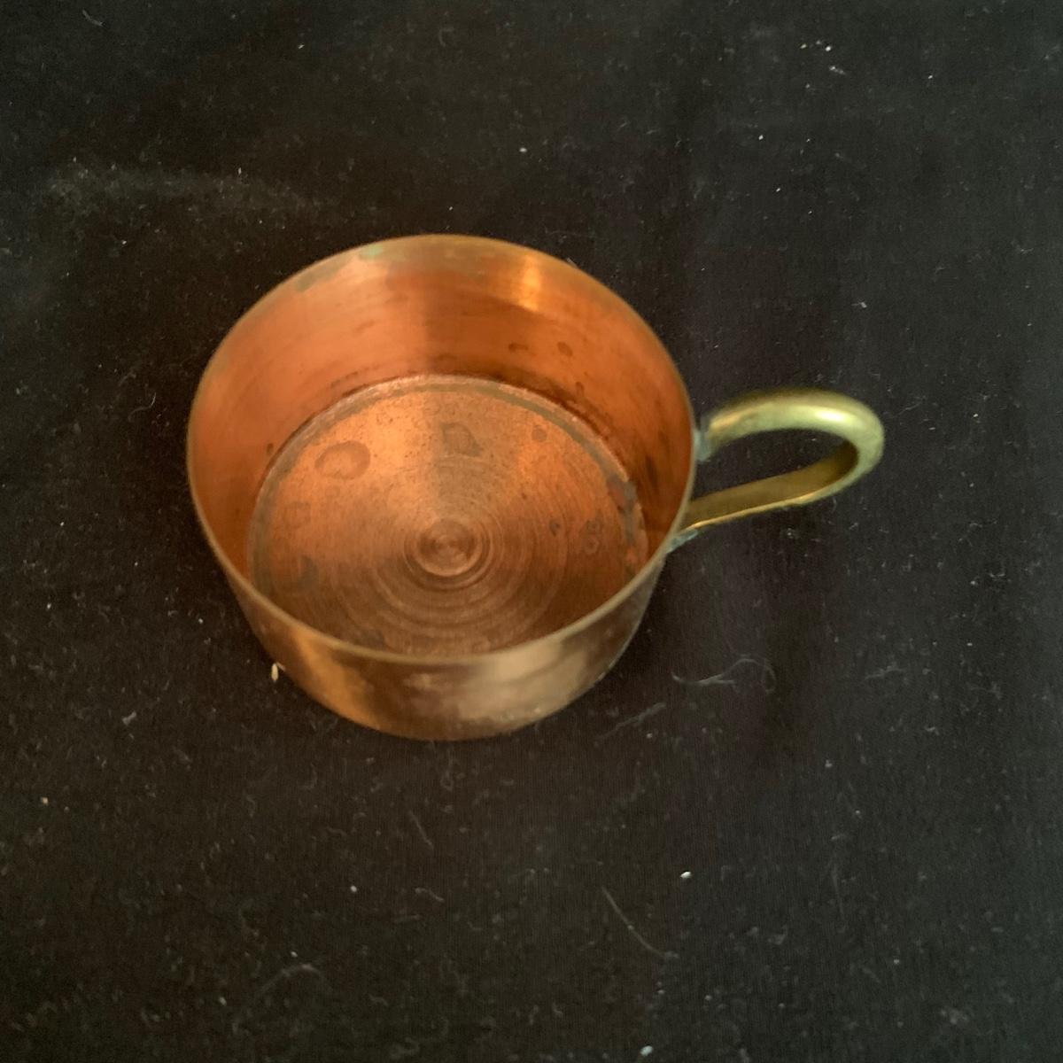 This lot includes one set of six espresso cups with a matching holding rack. Included also is a set of four tall porcelain espresso cups with matching plates. The espresso cups can separate from their copper holders (see photos). The set of six espresso cups measure about 2in x 2in (per cup). The tall porcelain espresso cups measure about 4in x 1.5in. Shipping available.