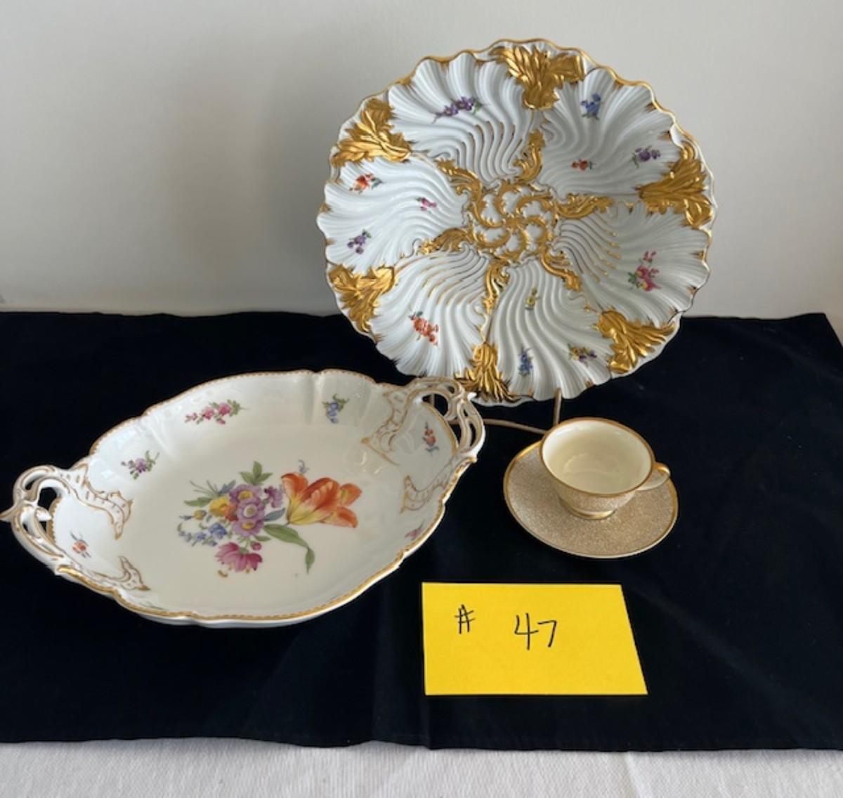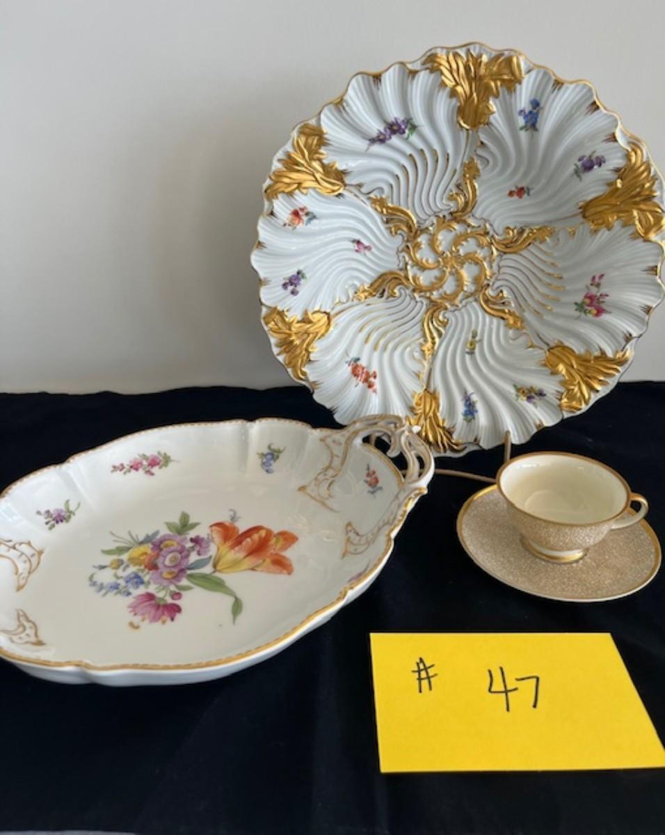 Meissen and Nymphenburg platters, Rosenthal teacup