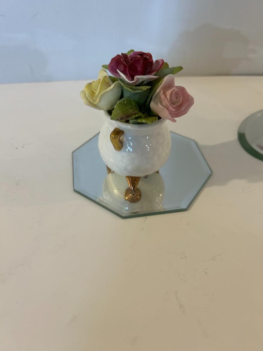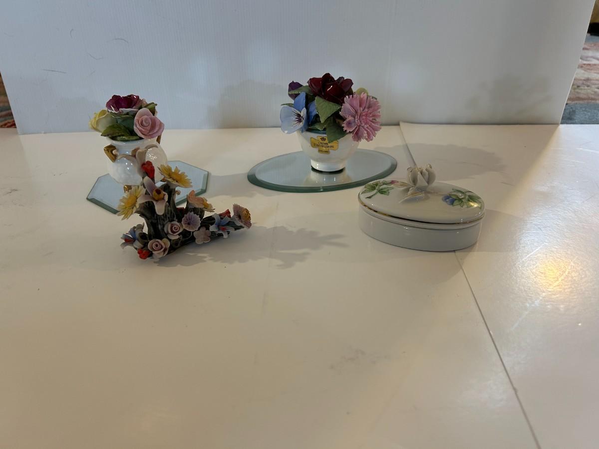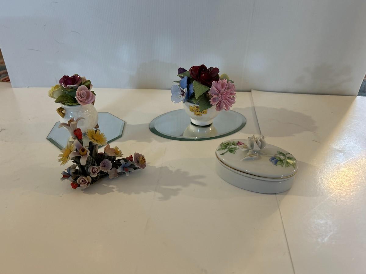 Four floral decorative pieces with two beveled edged mirrors to highlight their beauty. Trinket box has a tiny surprise.