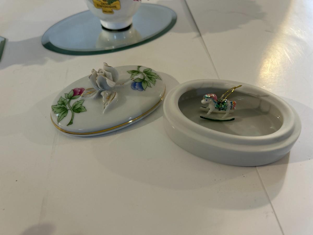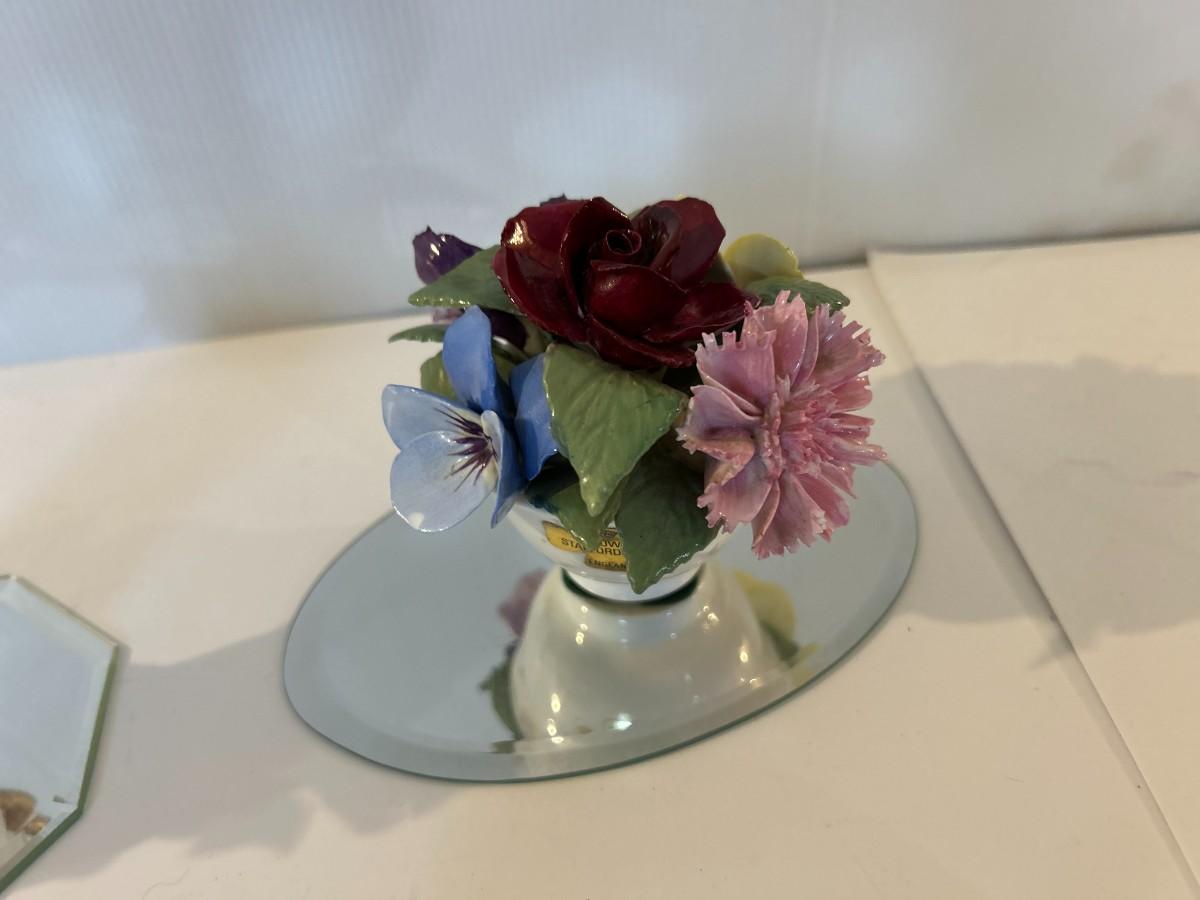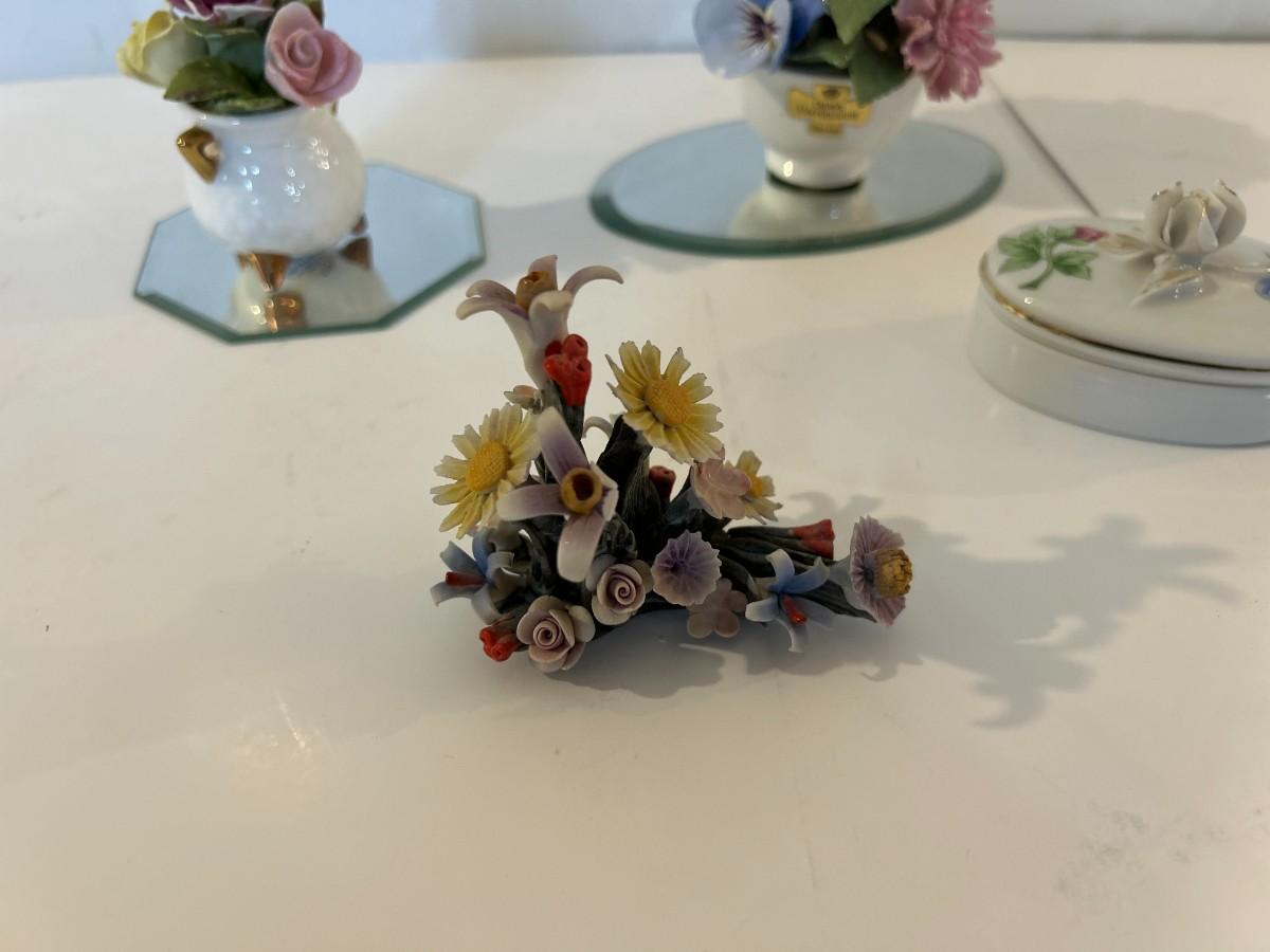 Four floral decorative pieces with two beveled edged mirrors to highlight their beauty. Trinket box has a tiny surprise.