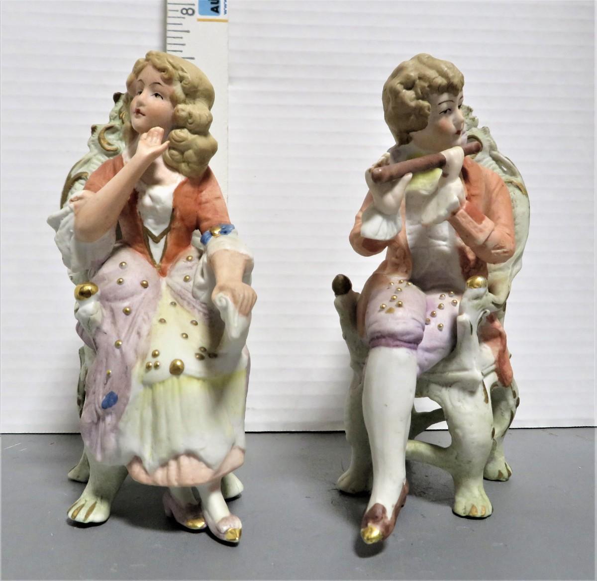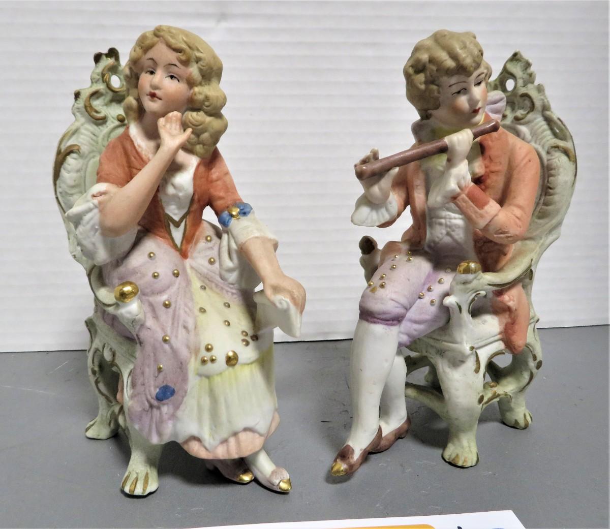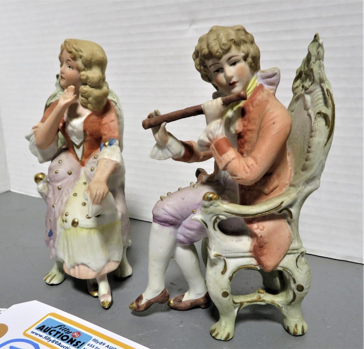 (2) nice Hand painted Victorian Porcelain signed DEP 11981 Germany figures. Both posed in Chairs. Lady holding handbag purse & Man with musical instrument Flute.